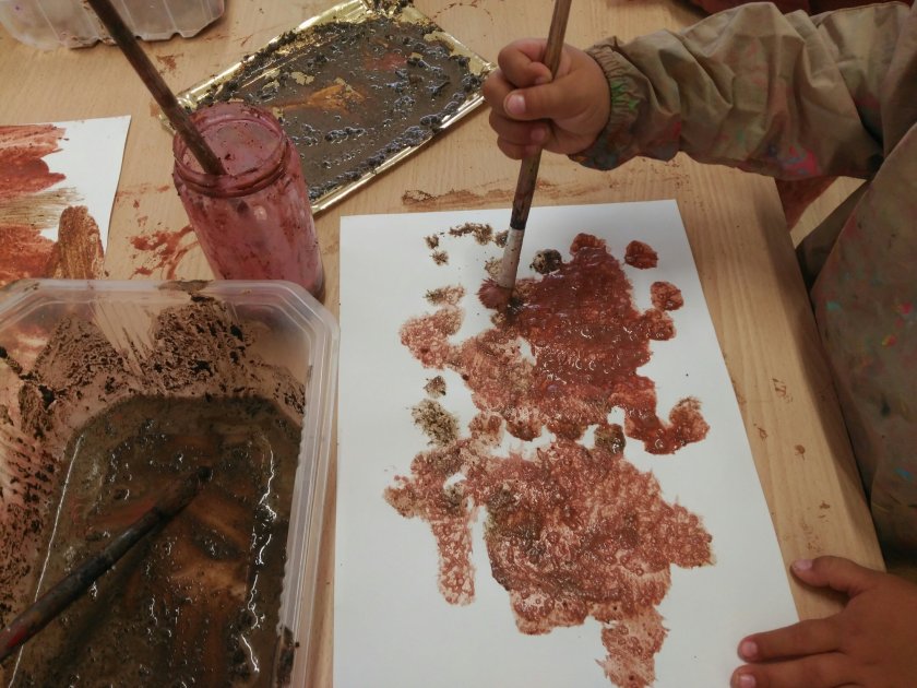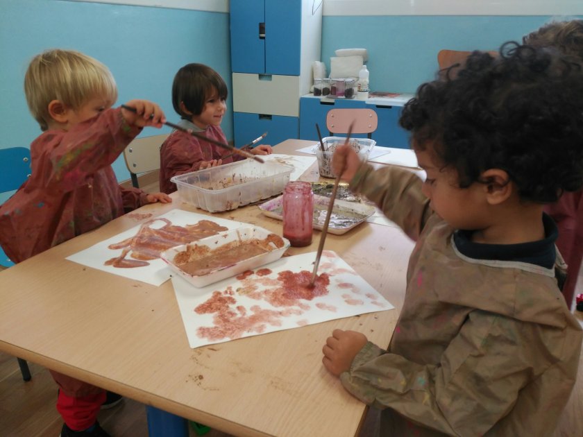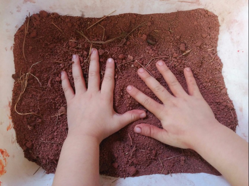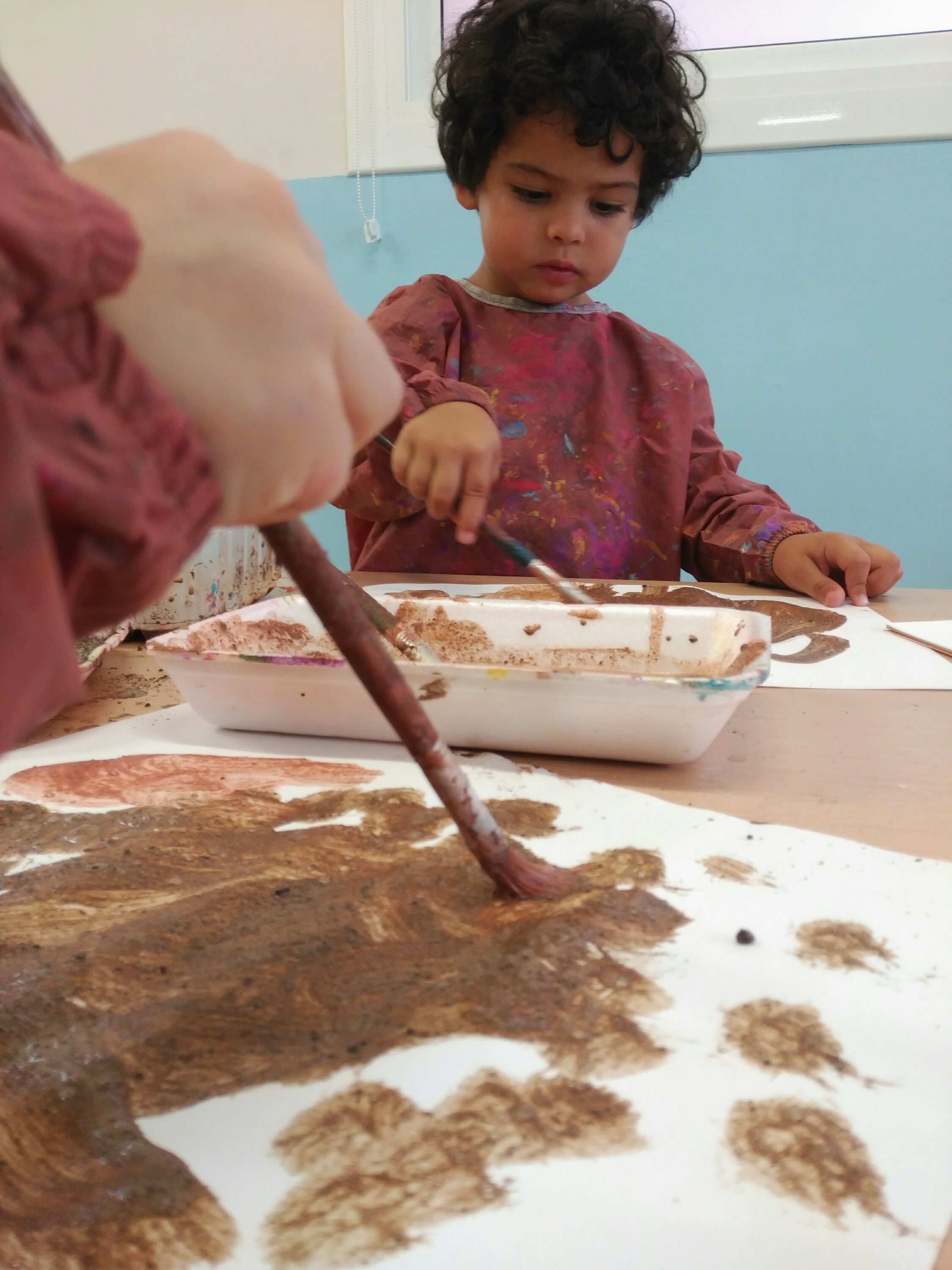 La manipolazione della terra é sempre un’esperienza magica, rilassante e coinvolgente. I bambini e le bambine di 3 anni hanno avuto l’occasione a scuola di toccarla, odorarla, osservarla e infine di usarla come pittura.