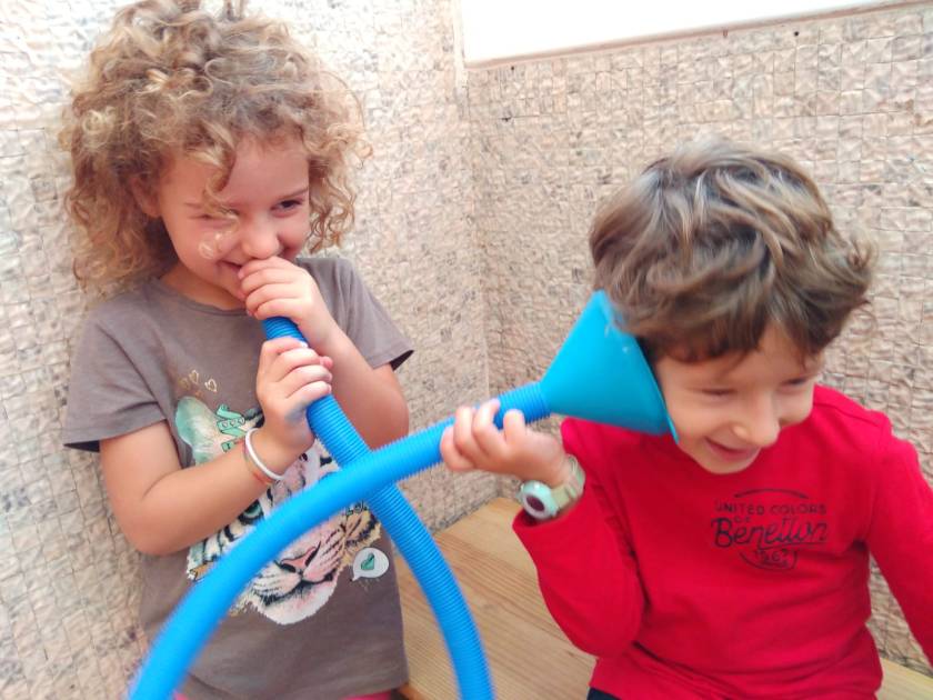 Il gruppo dei 5 anni invece ha iniziato l’attività con La storia della conchiglia. I bambini e le bambine hanno ascoltato il suono del mare dentro la conchiglia e cominciato ad esplorare il concetto di cassa di risonanza suonando con i bicchieri, riproducendo il funzionamento del timpano e suonando il cajón flamenco…
