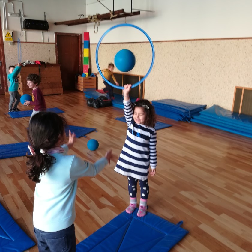 Nelle varie sessioni in palestra si esercitano facendo diversi giochi e movimenti: capriole, salti, corse… anche in coppia.