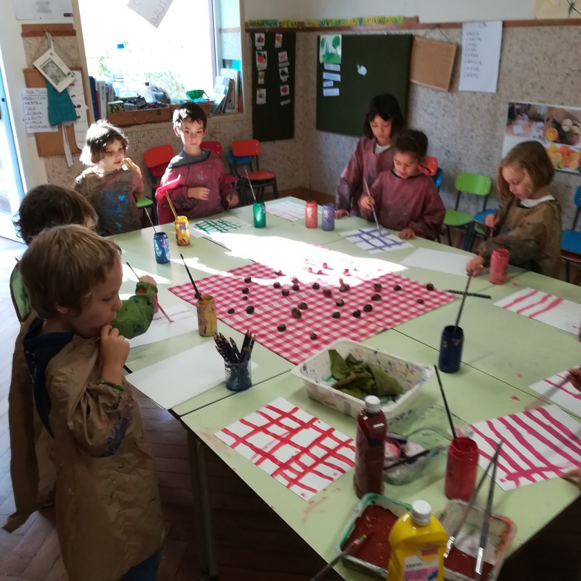 La protagonista: la castagna, ma non meno importante lo sfondo quadrettato che con tanta cura e precisione hanno elaborato i bambini e le bambine di 5 anni.
