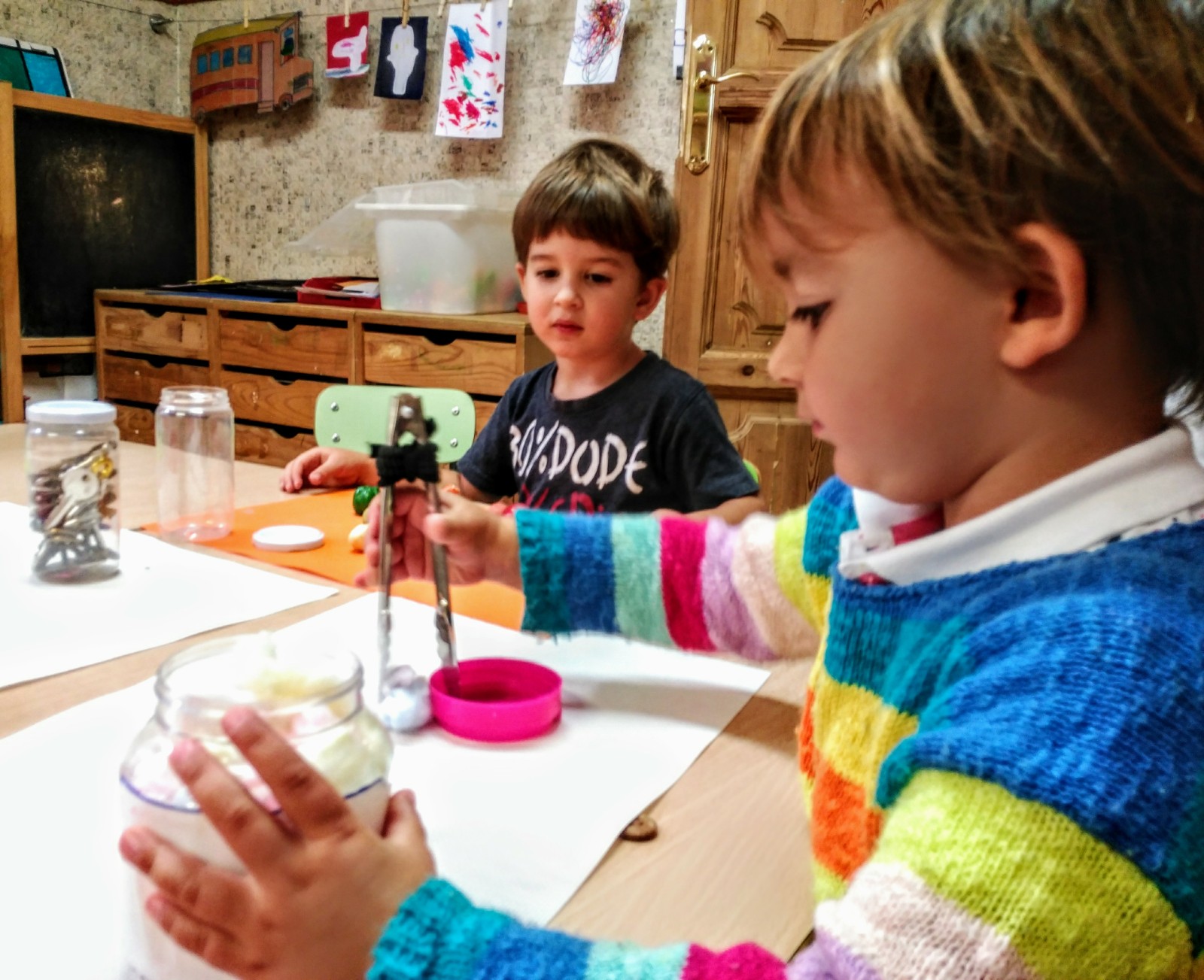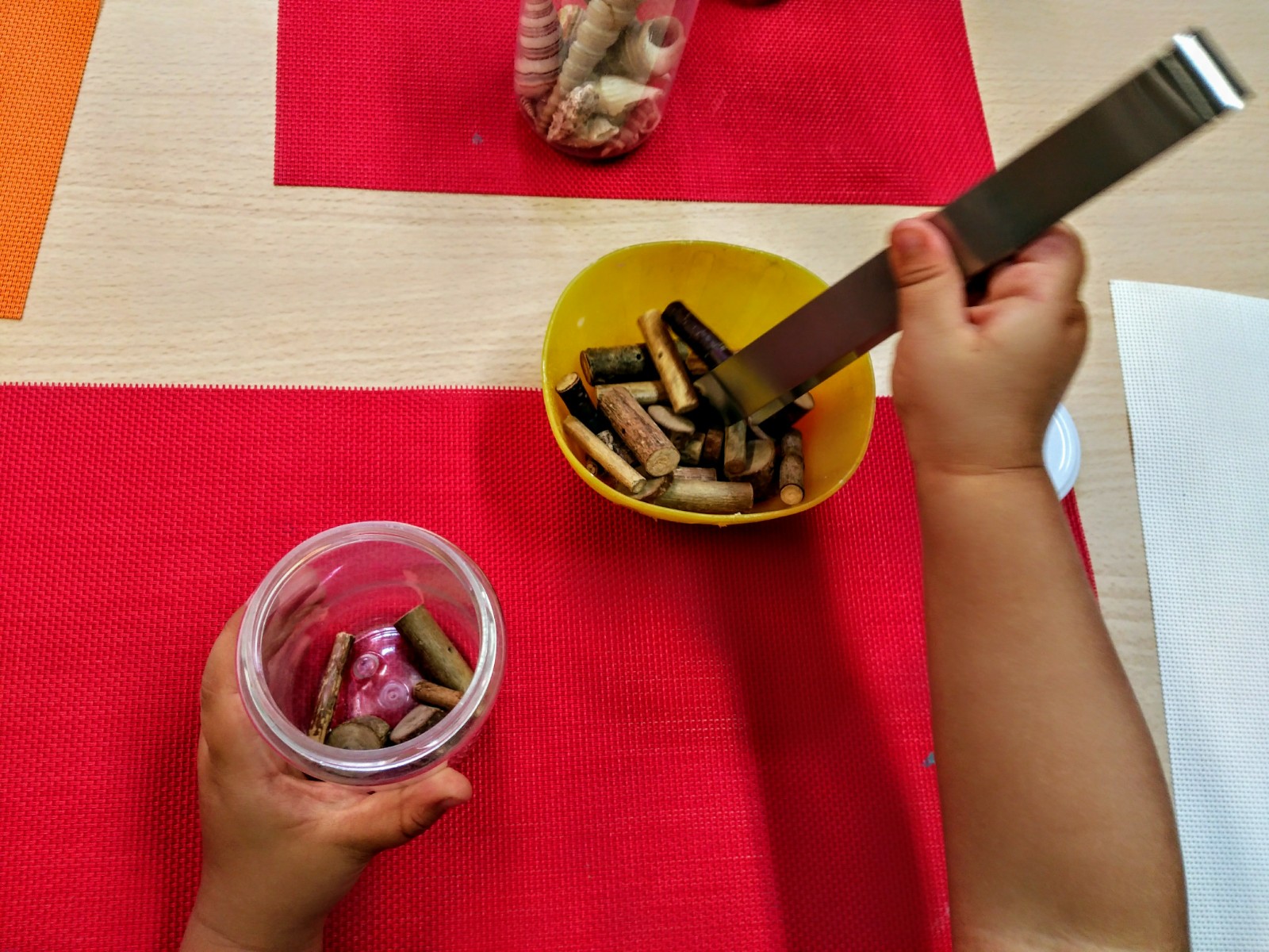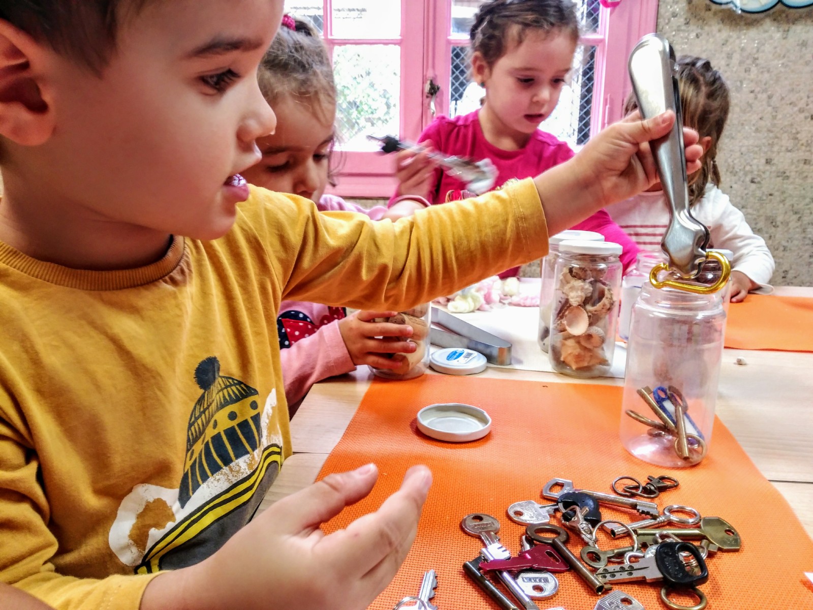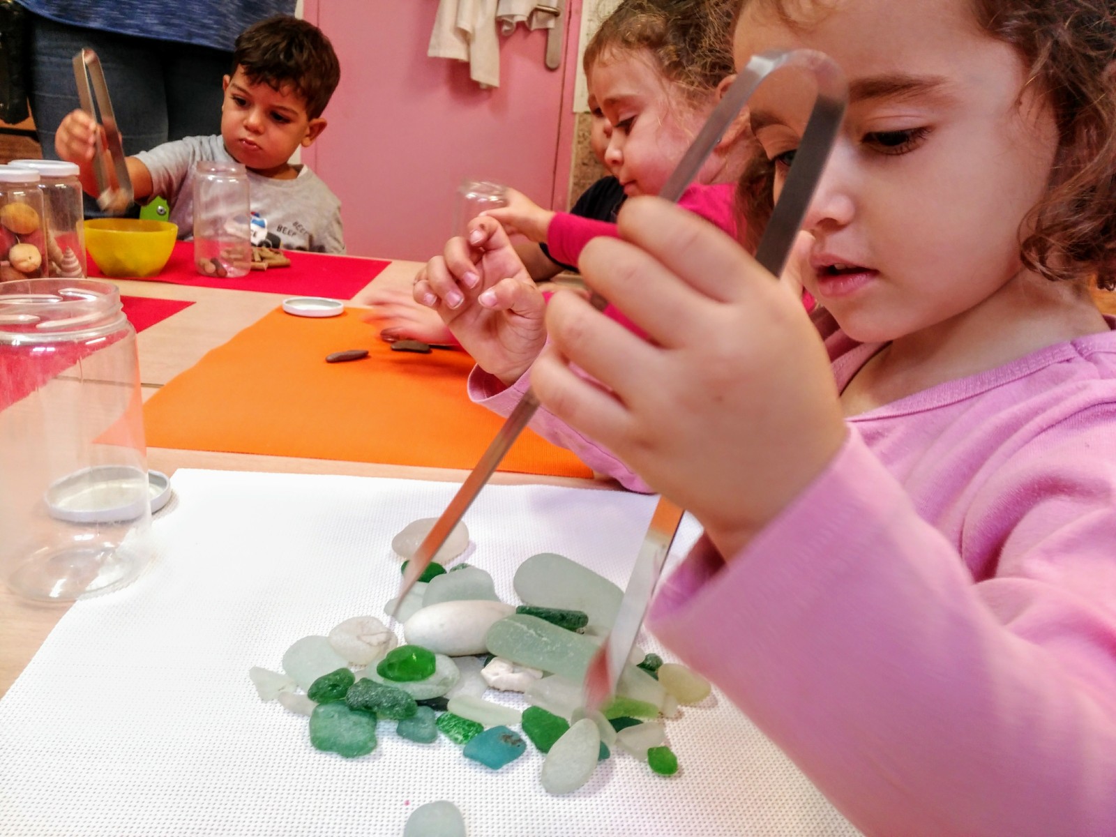 Tanti barattoli pieni di oggetti naturali e della vita quotidiana, differenti texturas, materiali, dimensioni, odori… tocchiamo, travasiamo, infiliamo, afferiamo, stringiamo, pinziamo, classifichiamo…