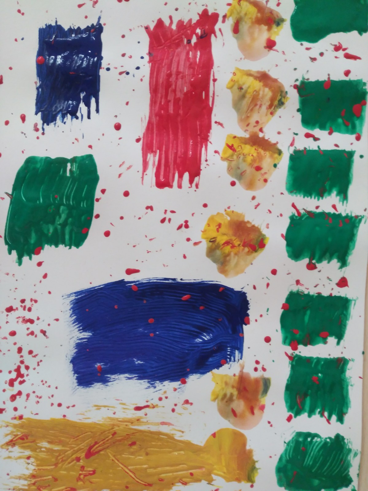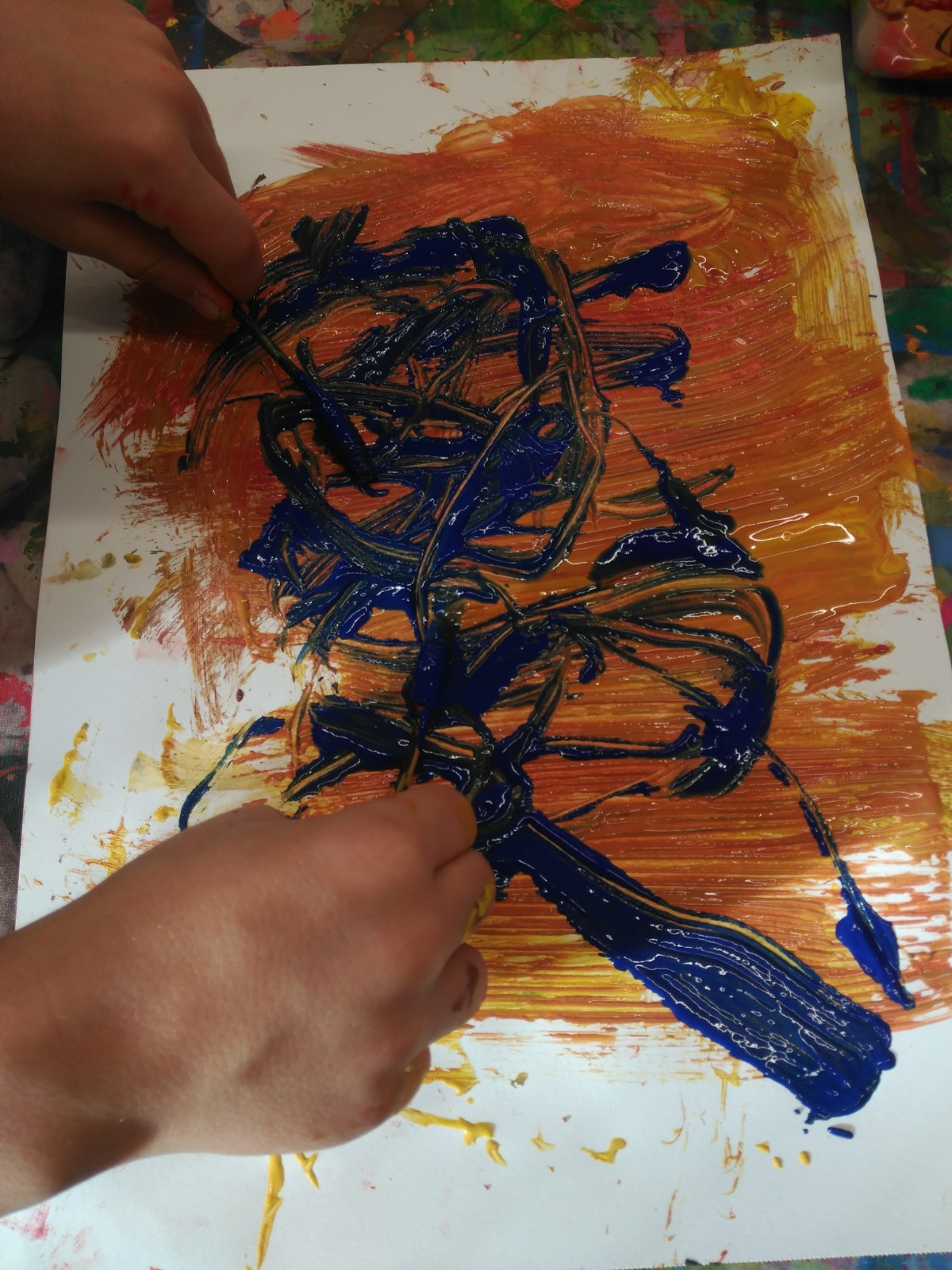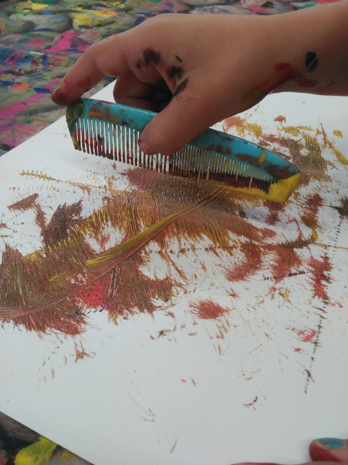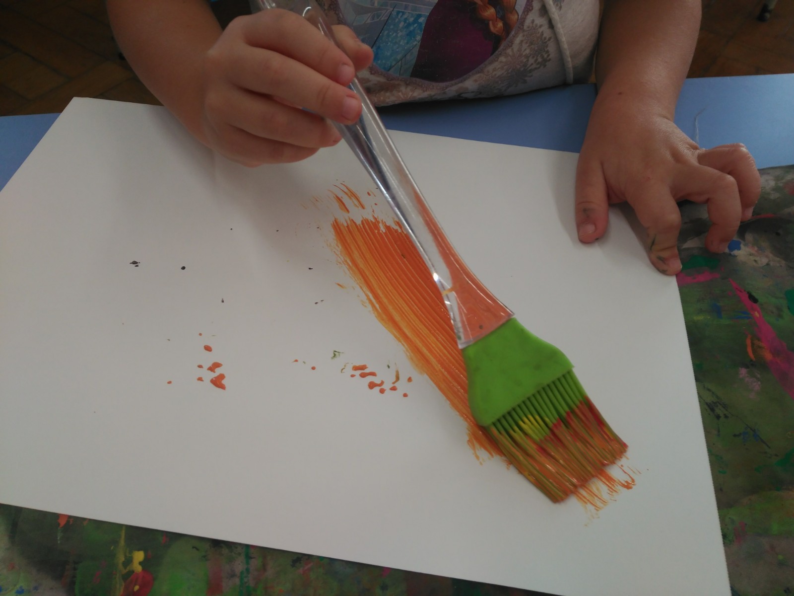 Poi sperimentiamo con i segni e le tracce che lasciano strumenti e oggetti di uso quotidiano, non convenzionali per la pittura. Esploriamo le differenti azioni che si possono fare e i segni che si creano. Con lo stesso oggetto che succede se faccio più o meno pressione, se striscio, se lo faccio “saltellare”…?