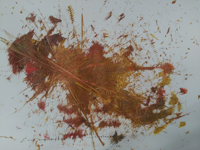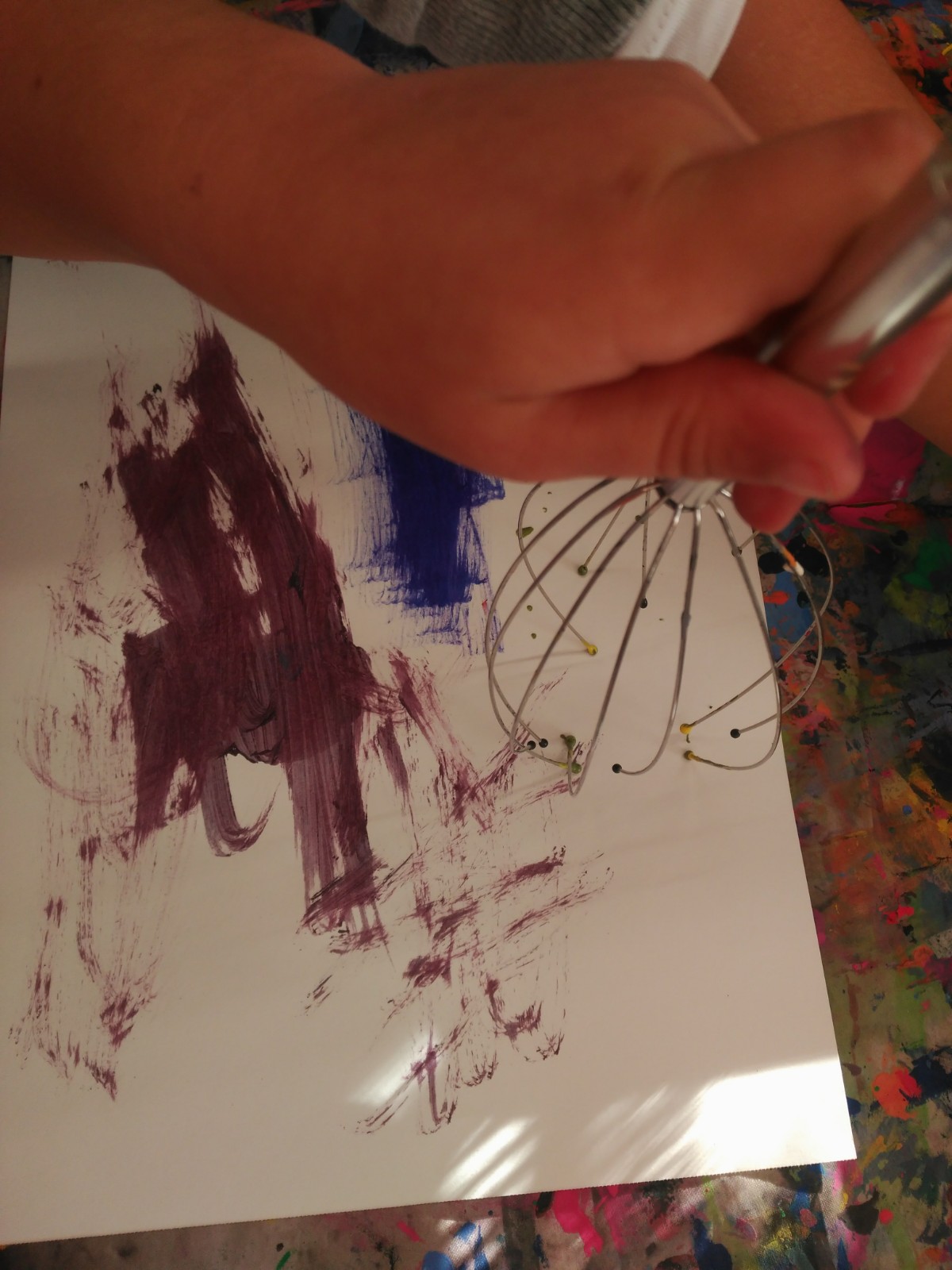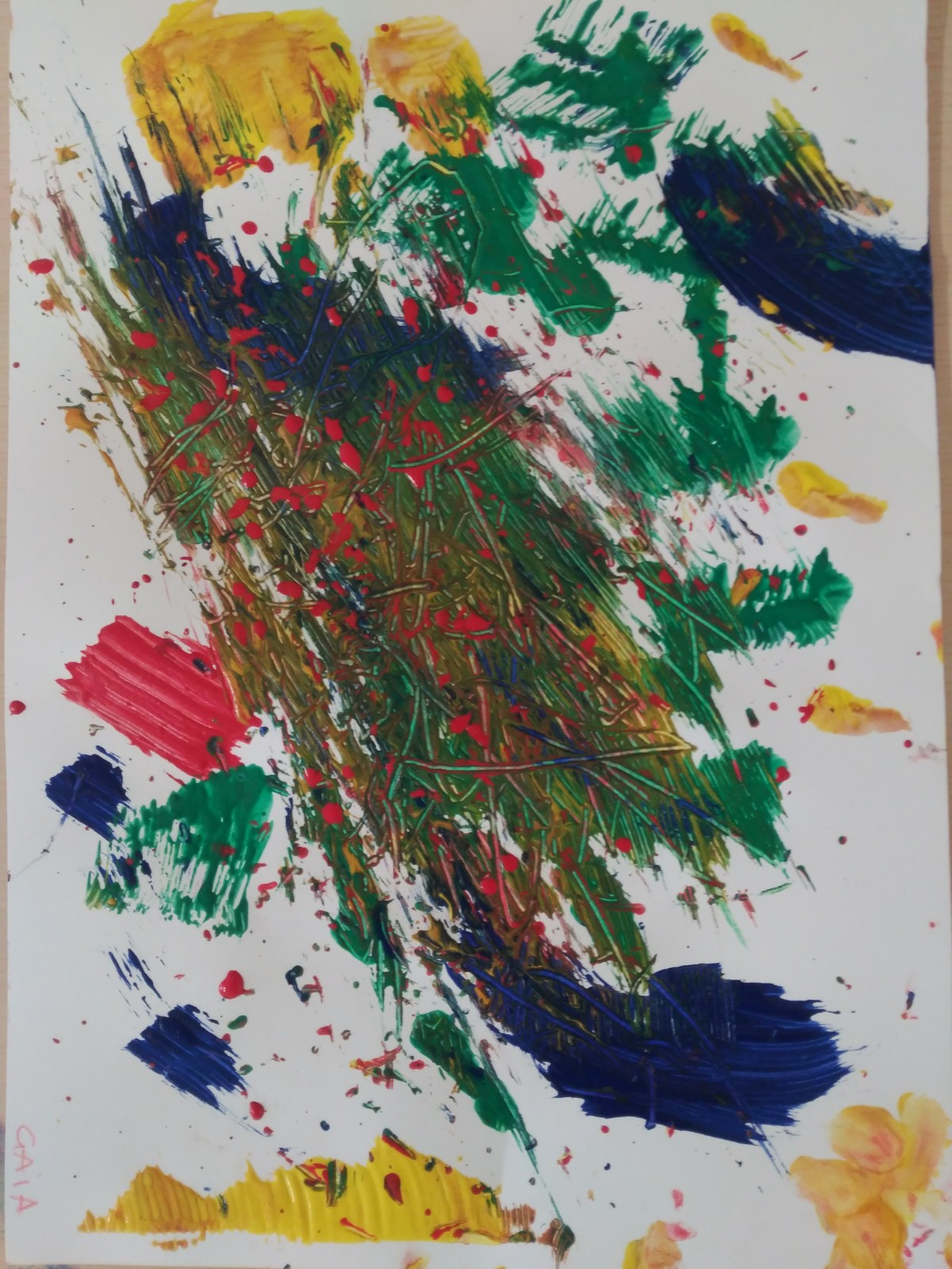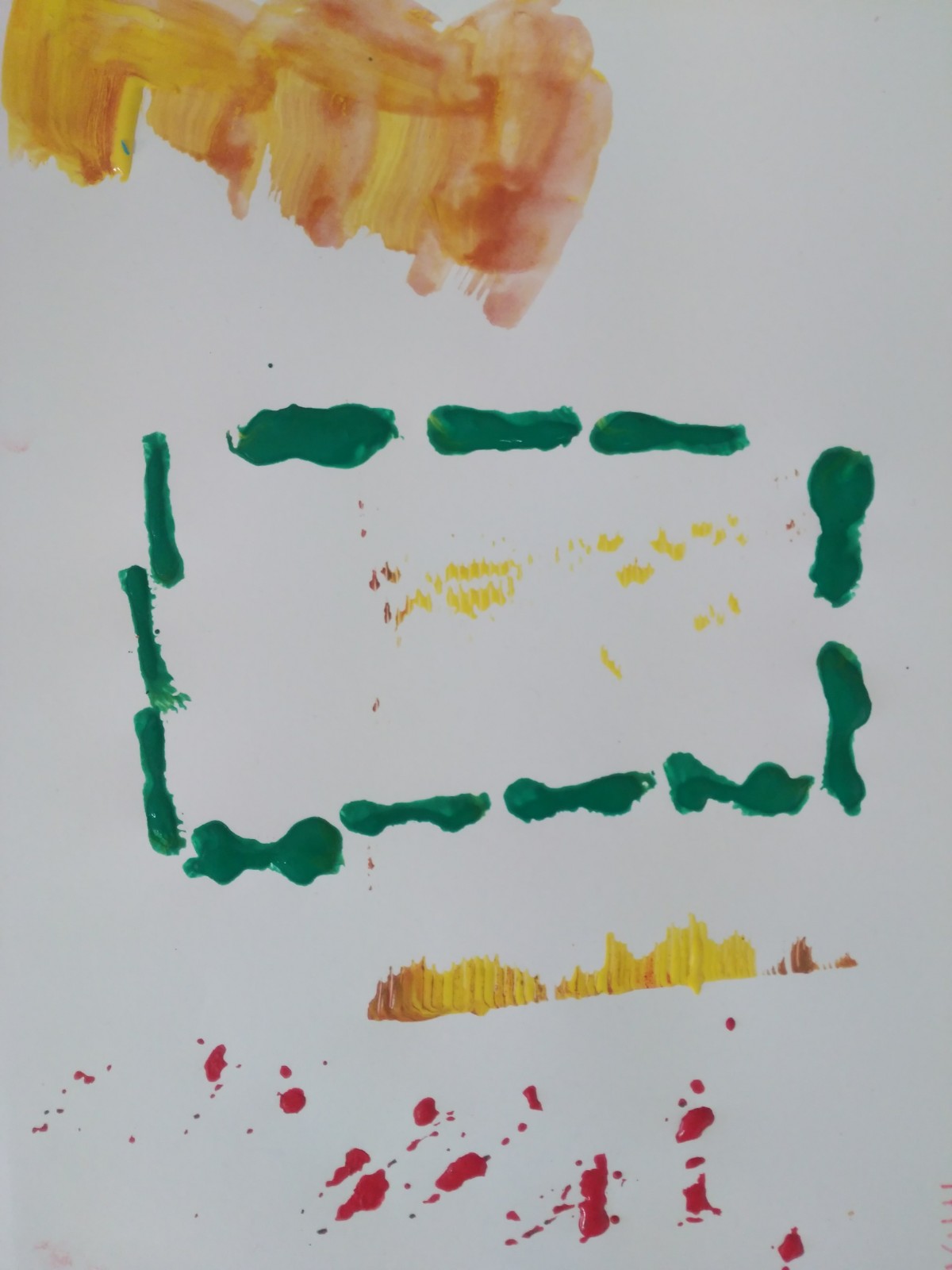 Poi sperimentiamo con i segni e le tracce che lasciano strumenti e oggetti di uso quotidiano, non convenzionali per la pittura. Esploriamo le differenti azioni che si possono fare e i segni che si creano. Con lo stesso oggetto che succede se faccio più o meno pressione, se striscio, se lo faccio “saltellare”…?