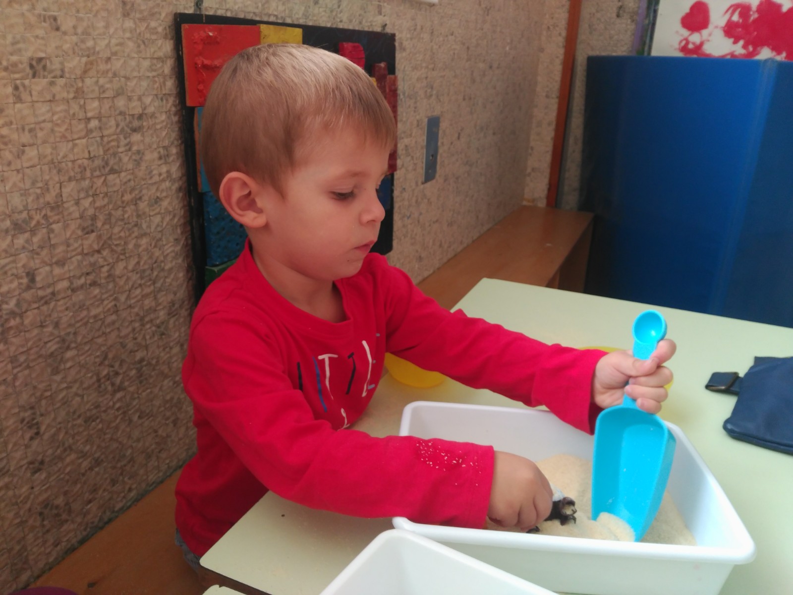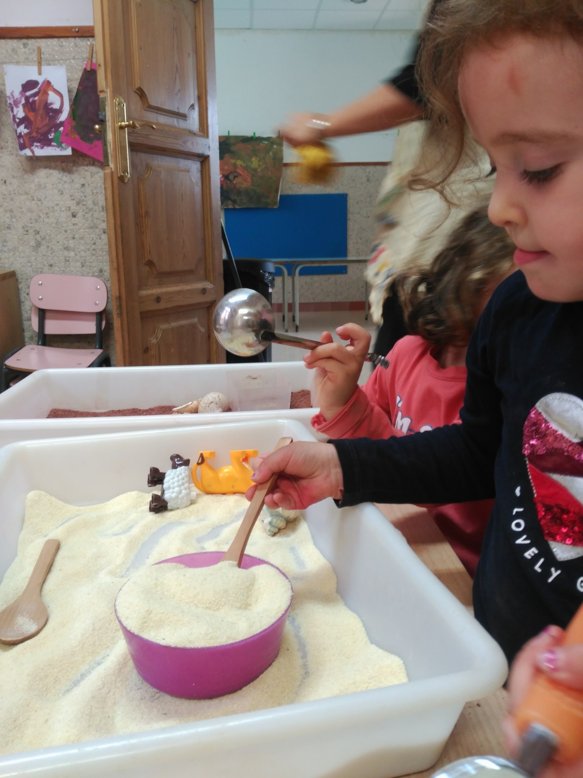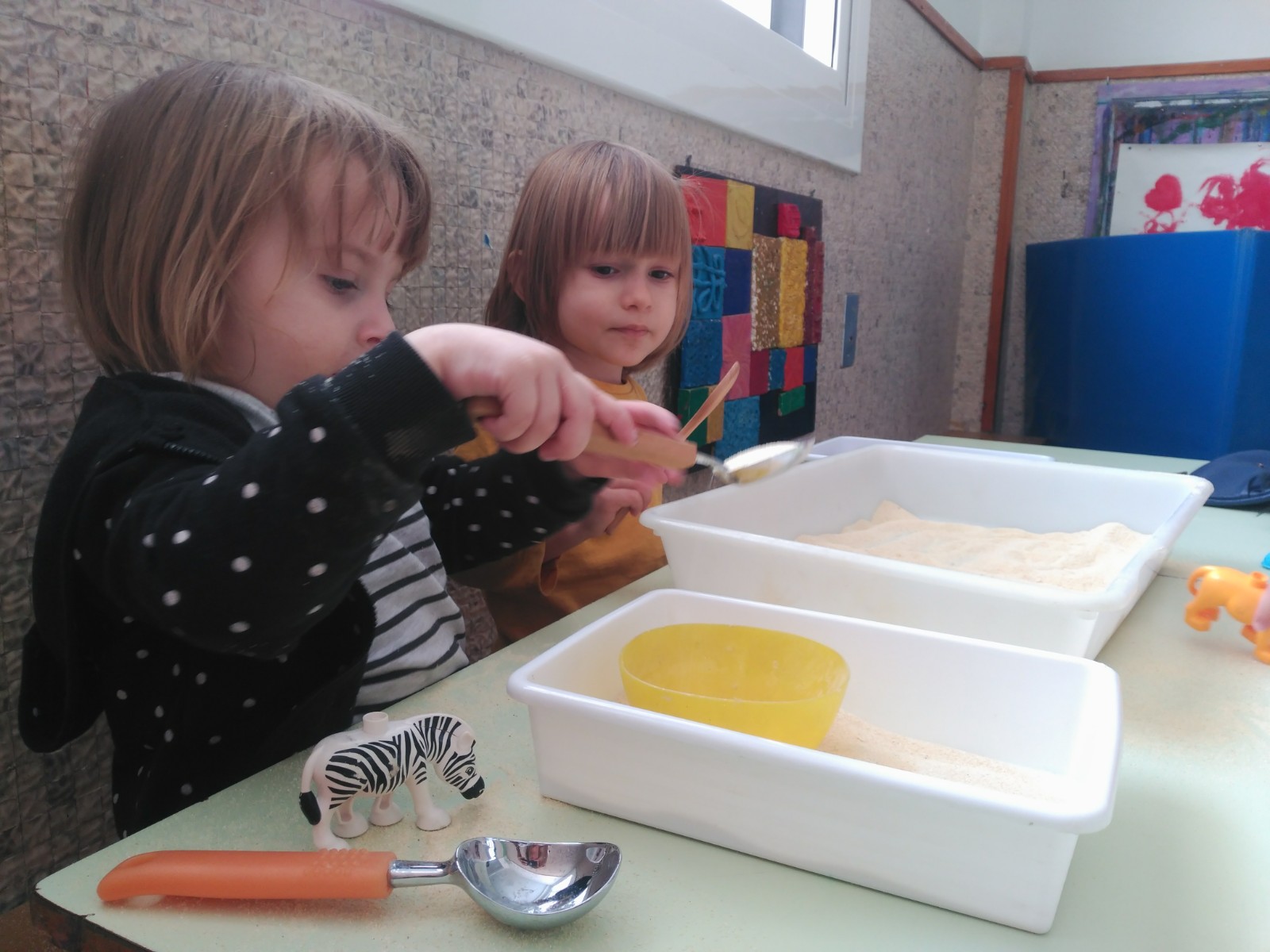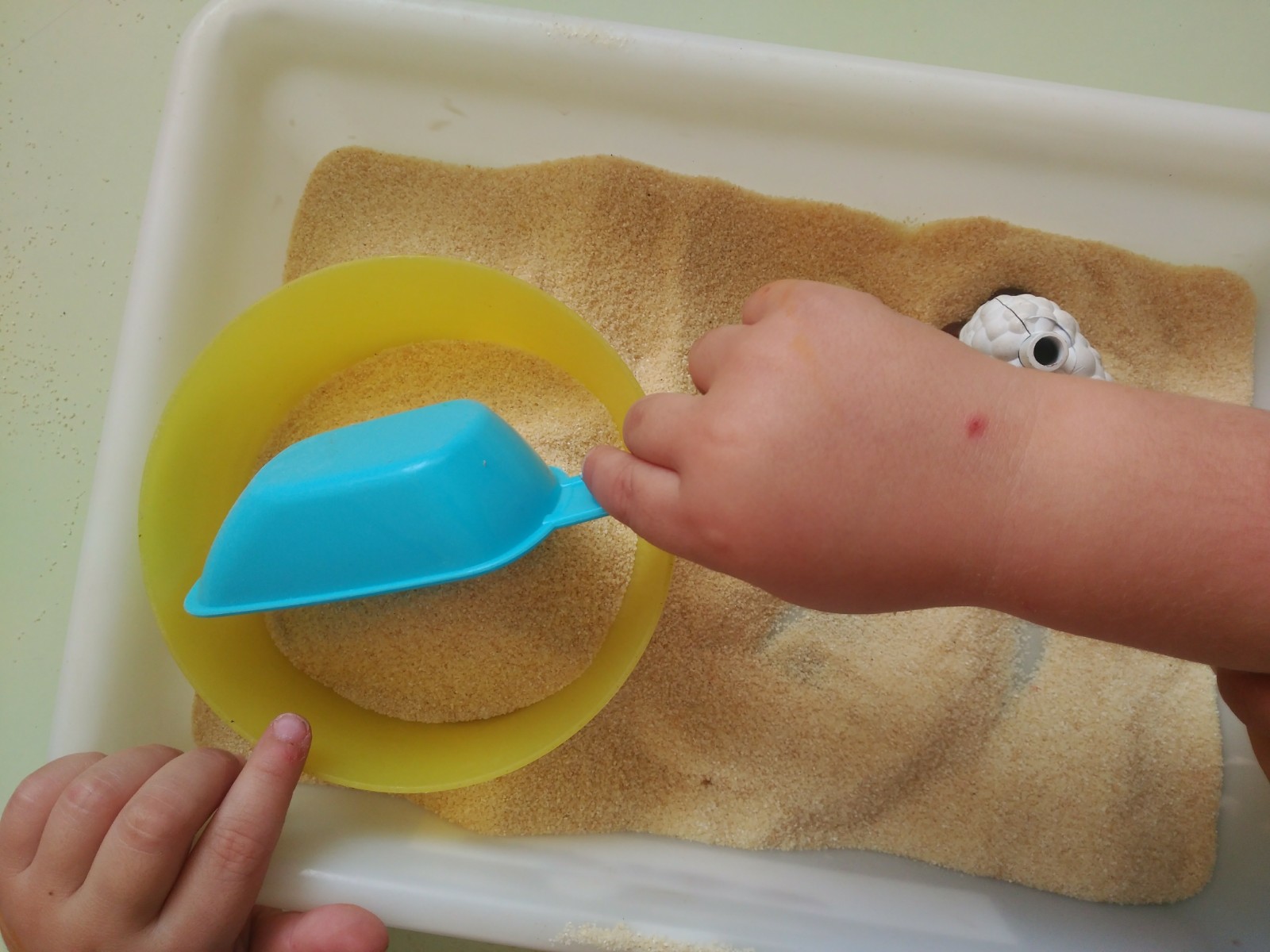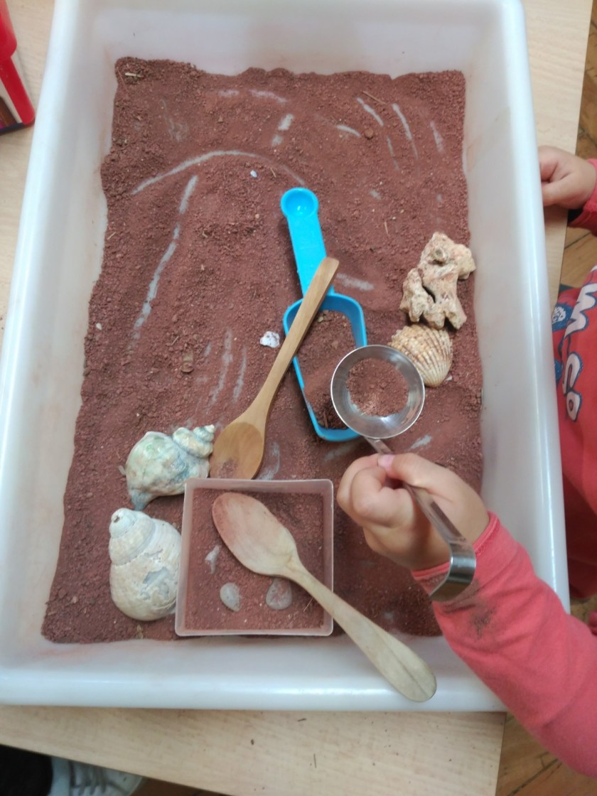 Continuiamo con le esperienze sensoriali di manipolazione toccando e travasando sabbie e terre e giocando con legnetti e conchiglie.