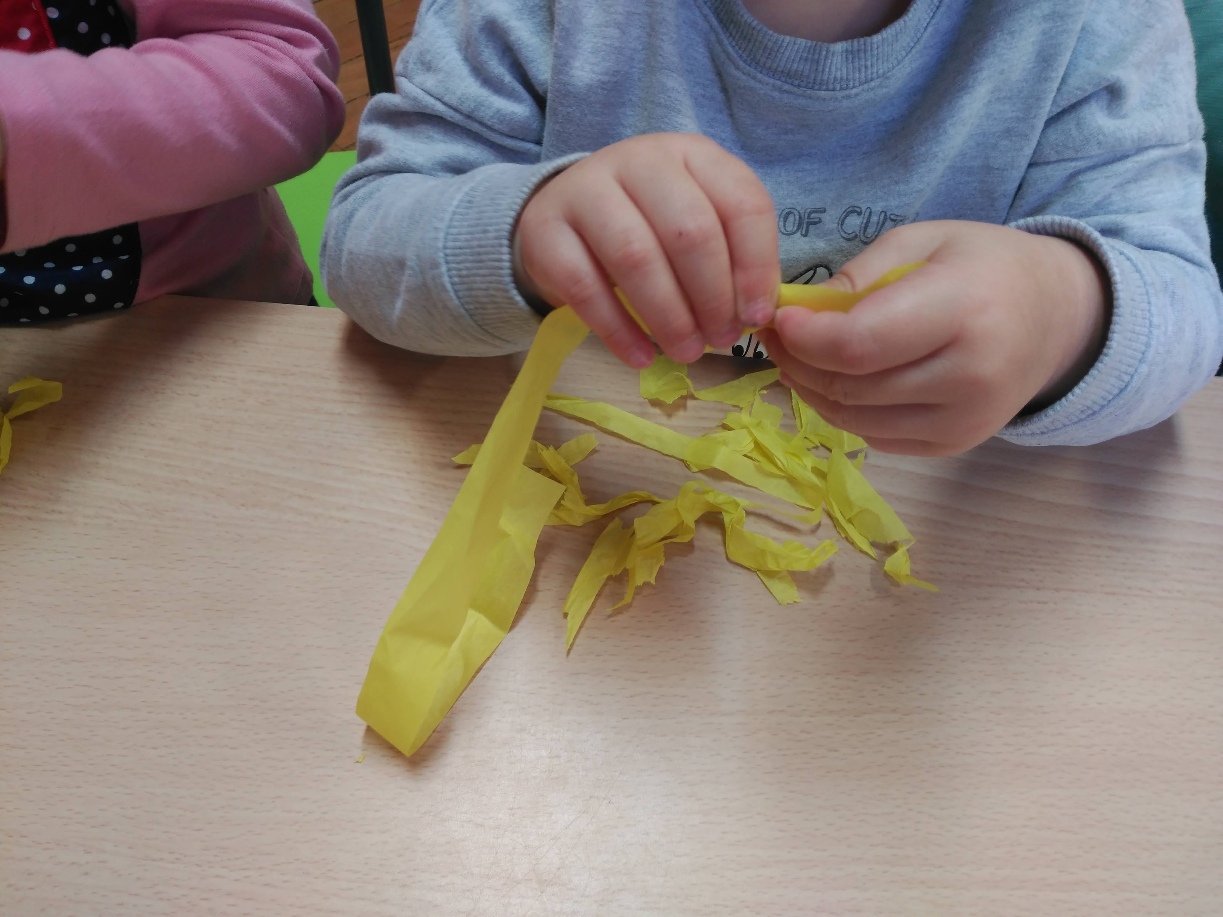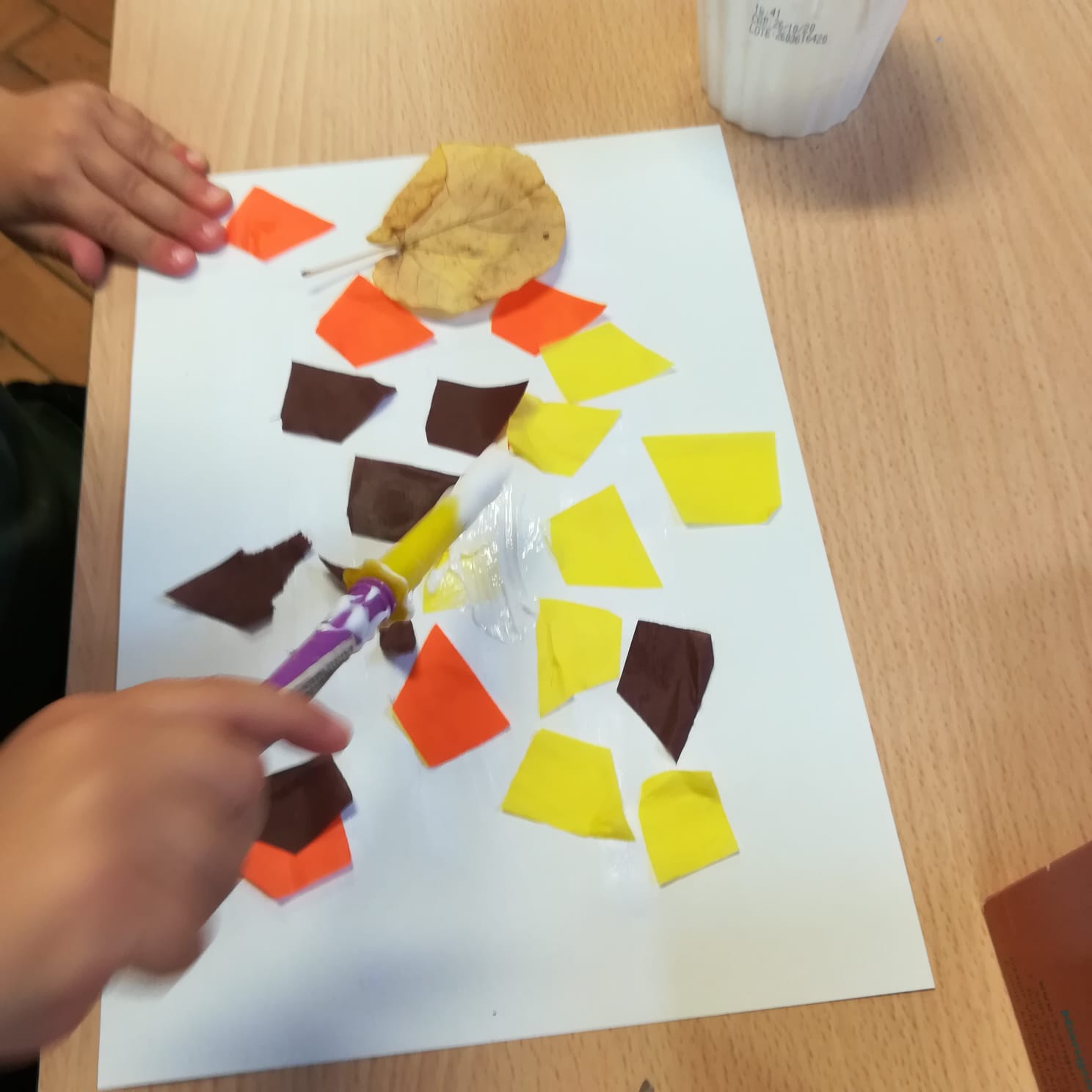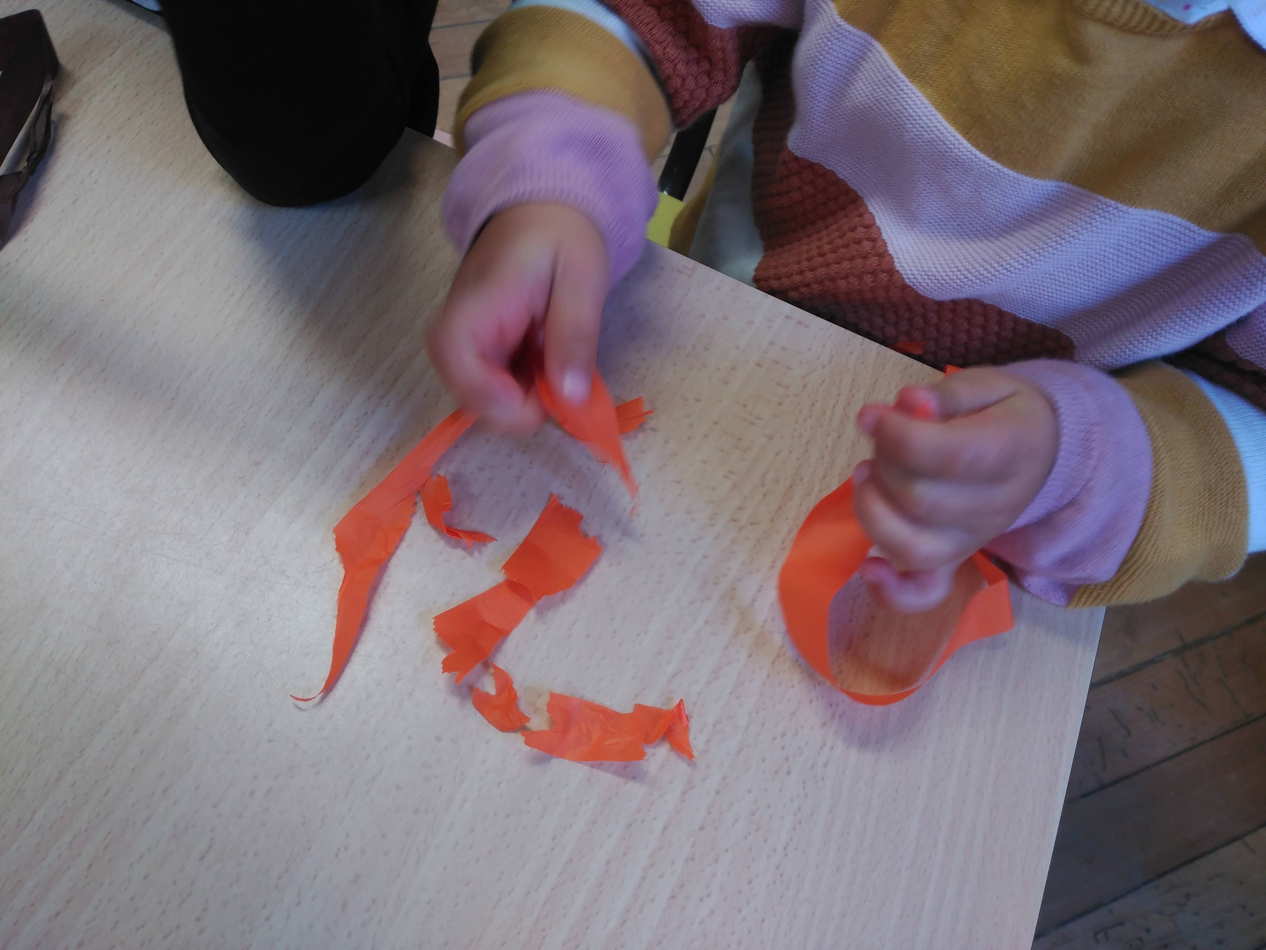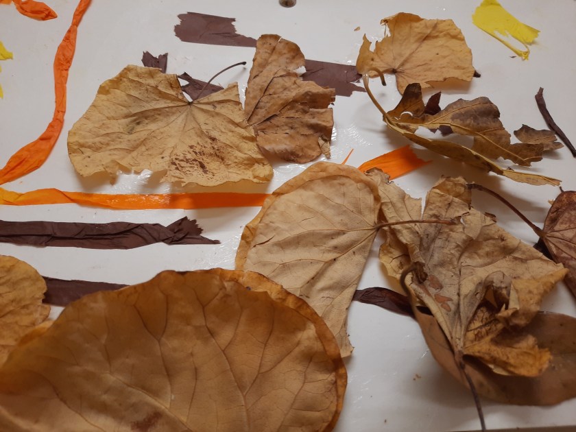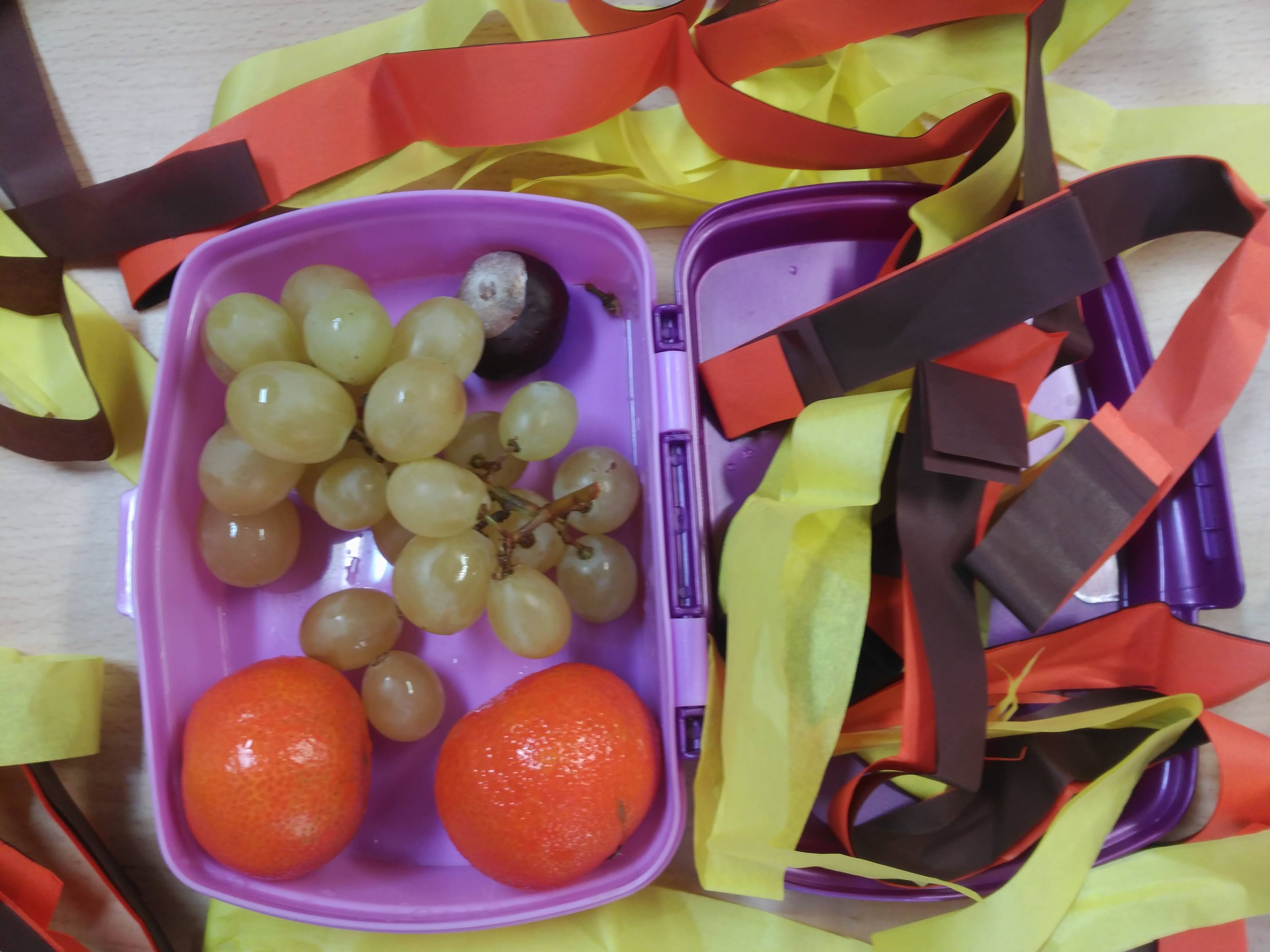 In classe, osserviamo i colori della frutta autunnale, strappiamo e incolliamo carta velina e decoriamo con le foglie raccolte.