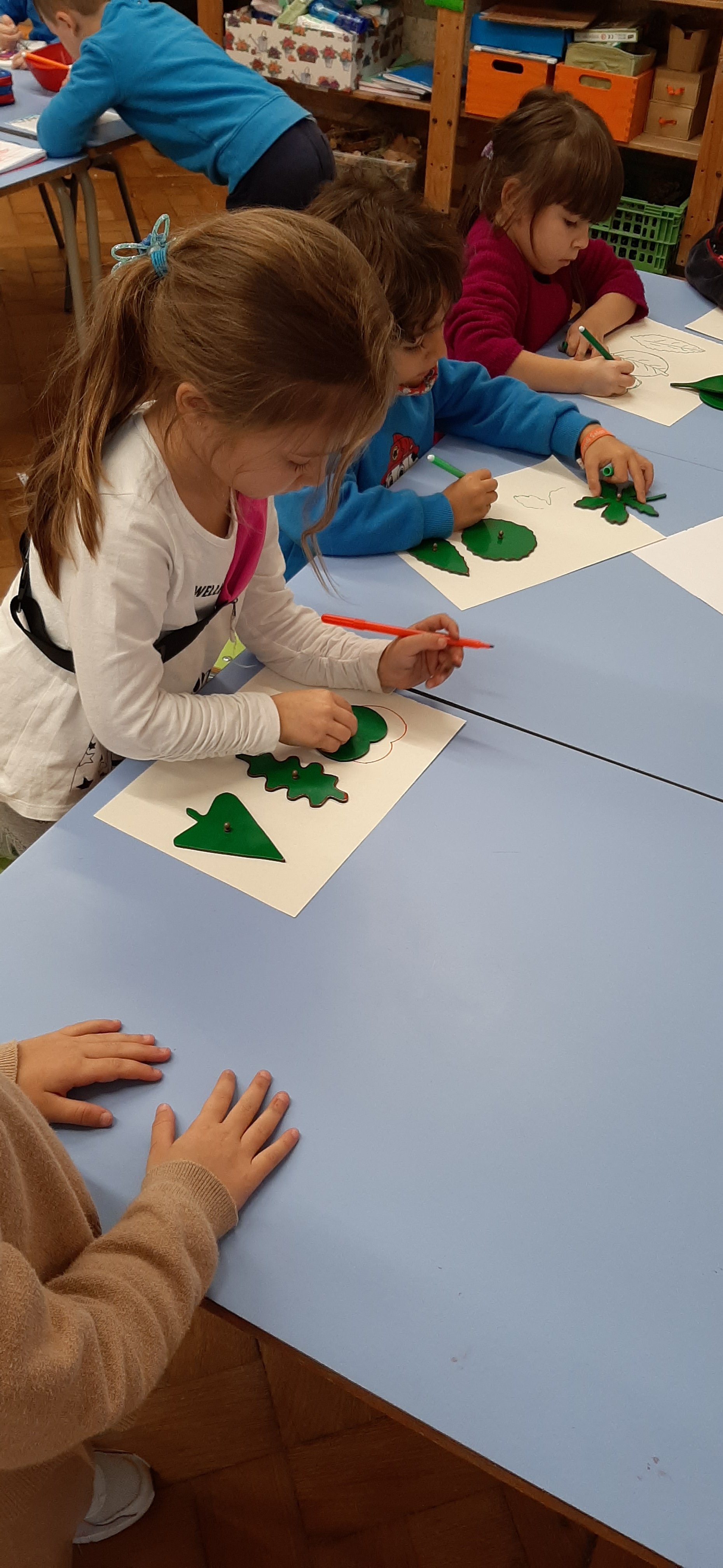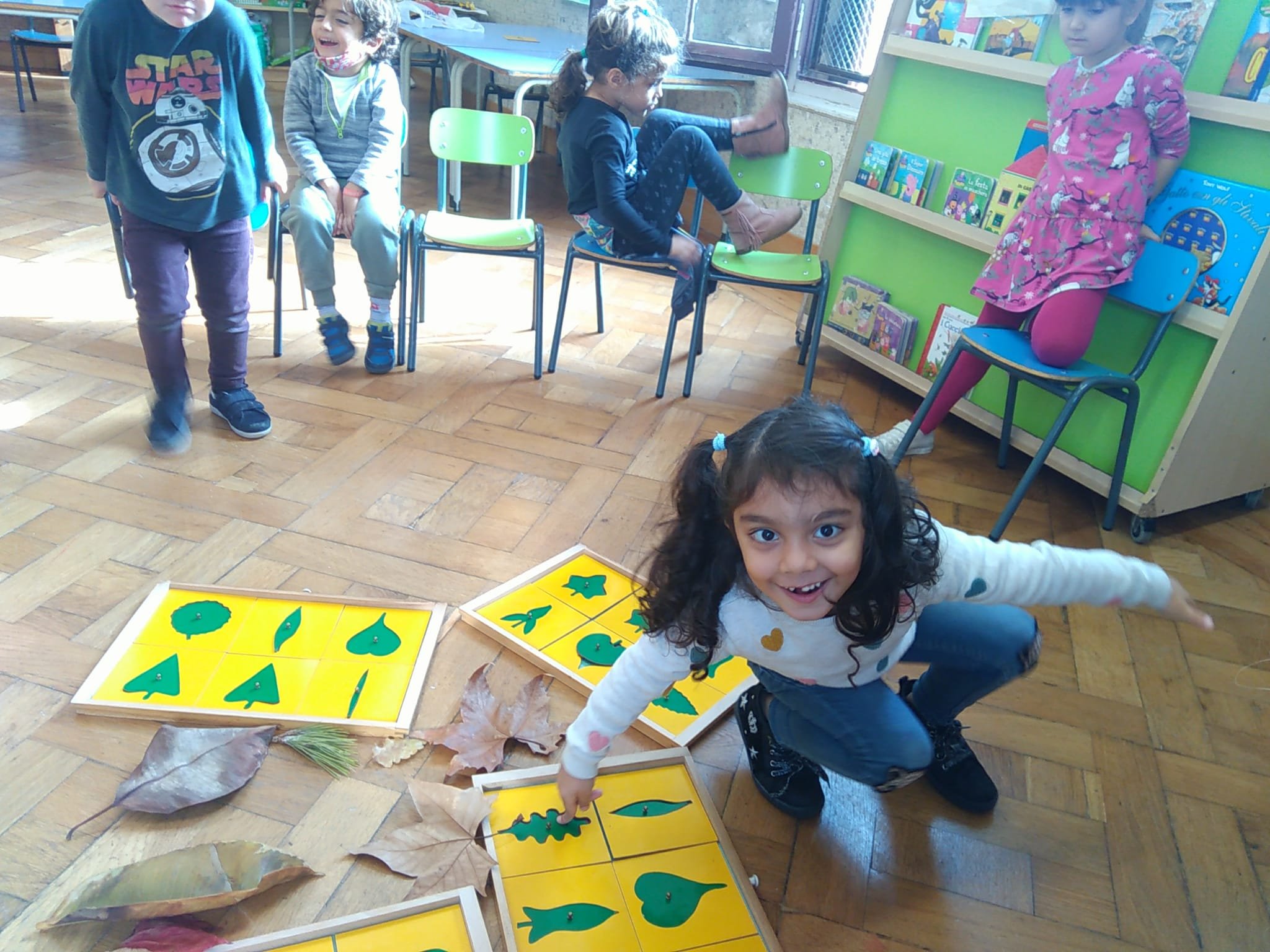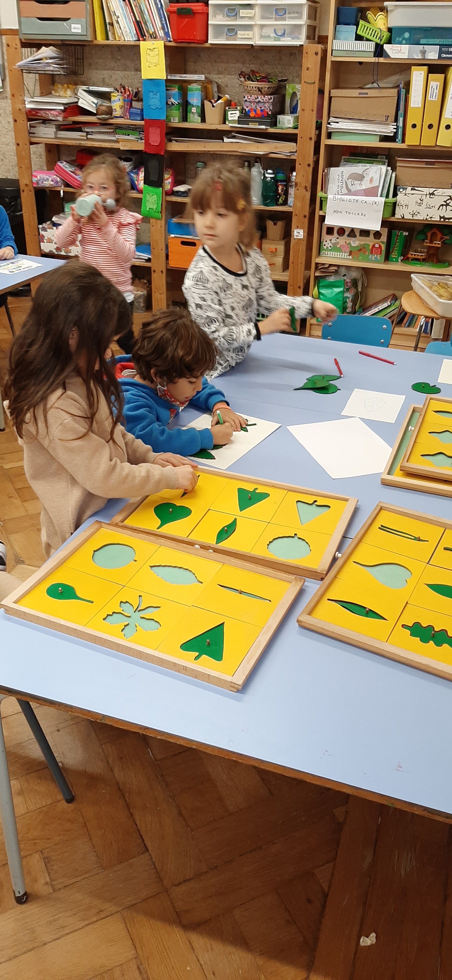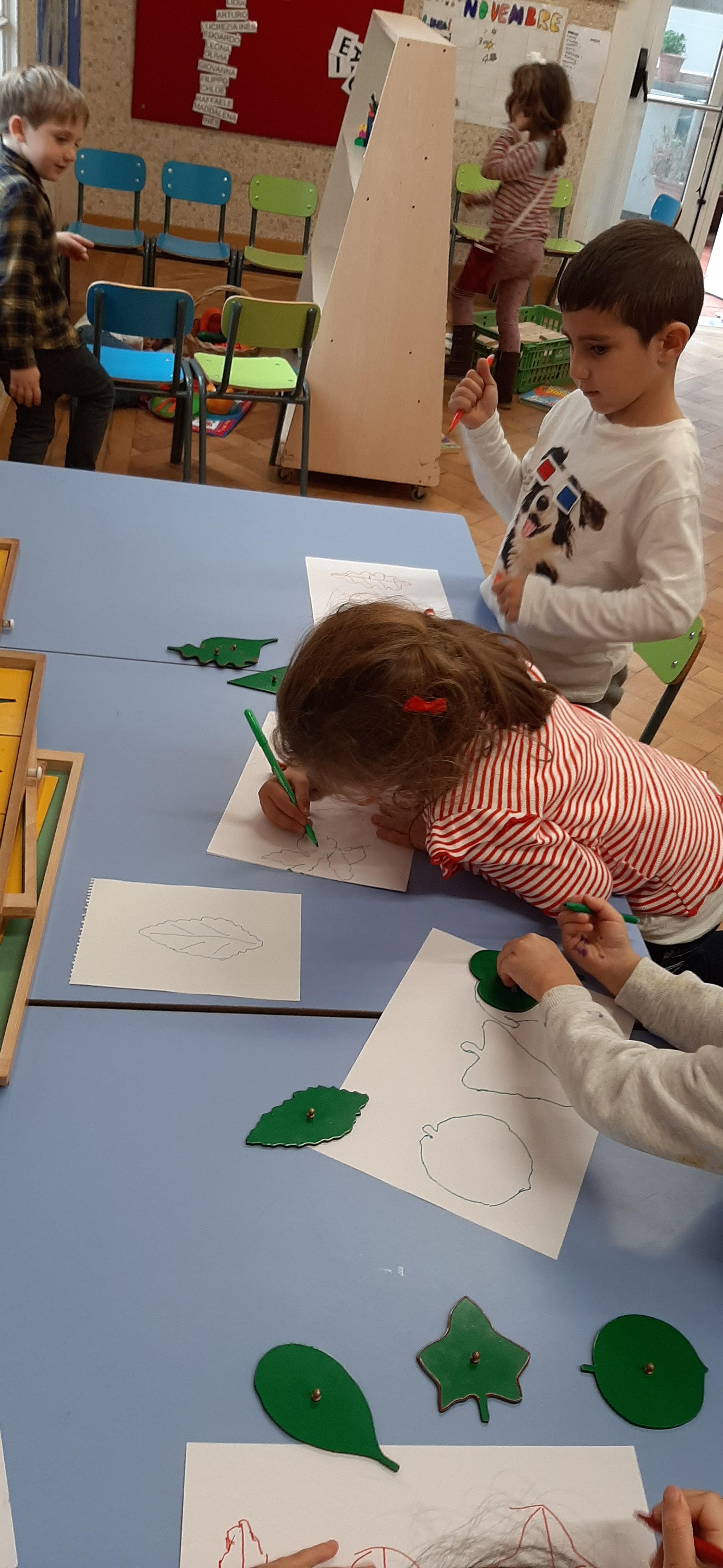 Ascoltando la música delle Quattro Stagioni di Vivaldi ed in particolare l’Autunno, ci siamo soffermati ad osservare le forme e i colori delle foglie in questo periodo dell’anno. Approfittando delle nostre passaggiate nei parchi i lunedi, abbiamo raccolto foglie di varie dimensioni che poi a scuola abbiamo classificato, scoprendo che possono essere palmate, cuoriformi, aghiformi etc. Inoltre le foglie possono anche suddividersi in caduche e sempreverdi. Infine utilizzando autentici materiali montessoriani abbiamo ripassato le differenti sagome.