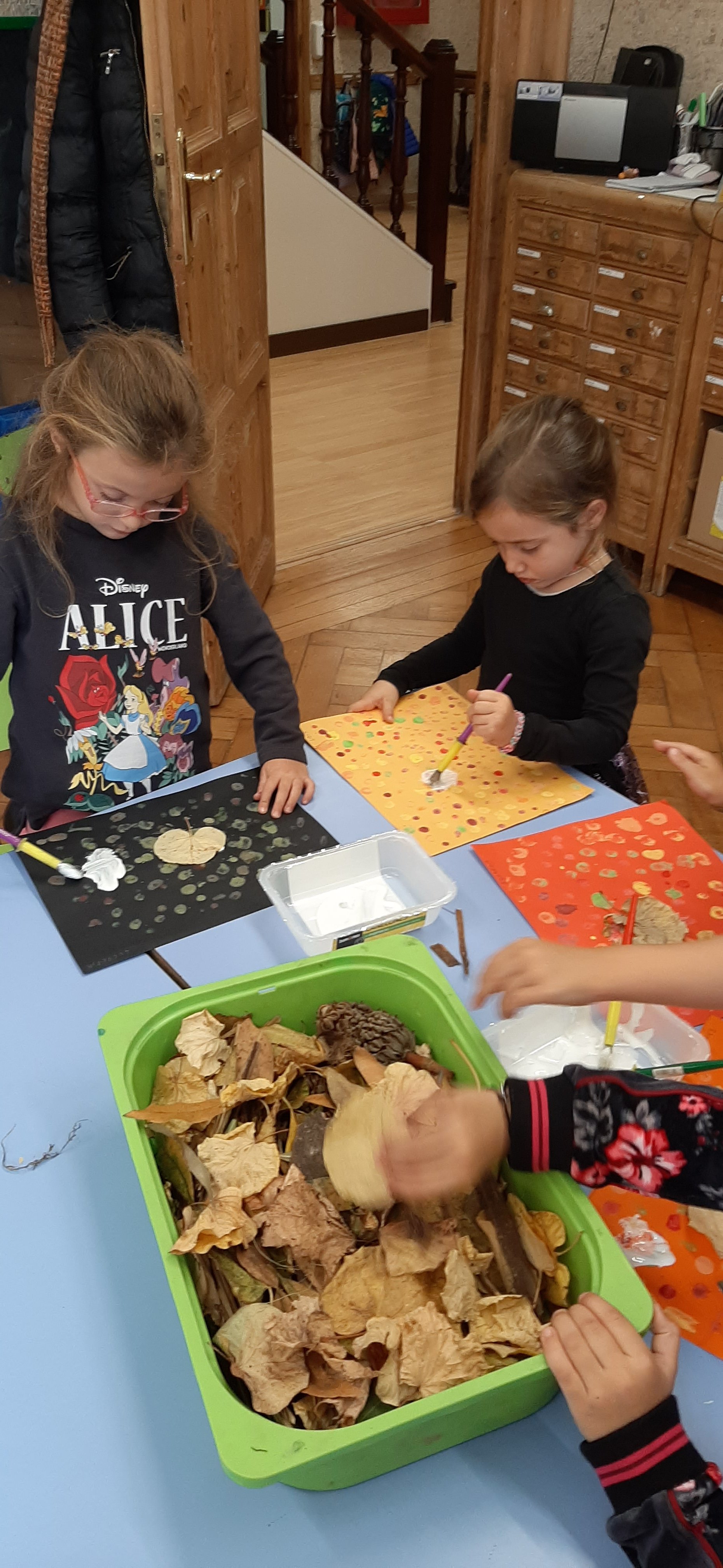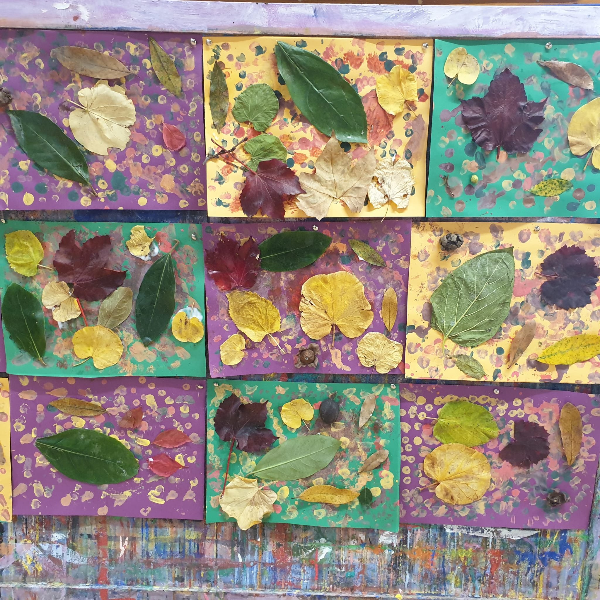 Ci siamo inoltre divertiti a fare frottage in rilievo con le cere, scoprendo i caldi colori d’autunno e le loro sfumature. Con le pigne, foglie, cortecce e bacche, raccolte nei parchi abbiamo creato dei meravigliosi collage con elementi naturali, incollati su degli sfondi dipinti da noi con la técnica del puntinismo.
