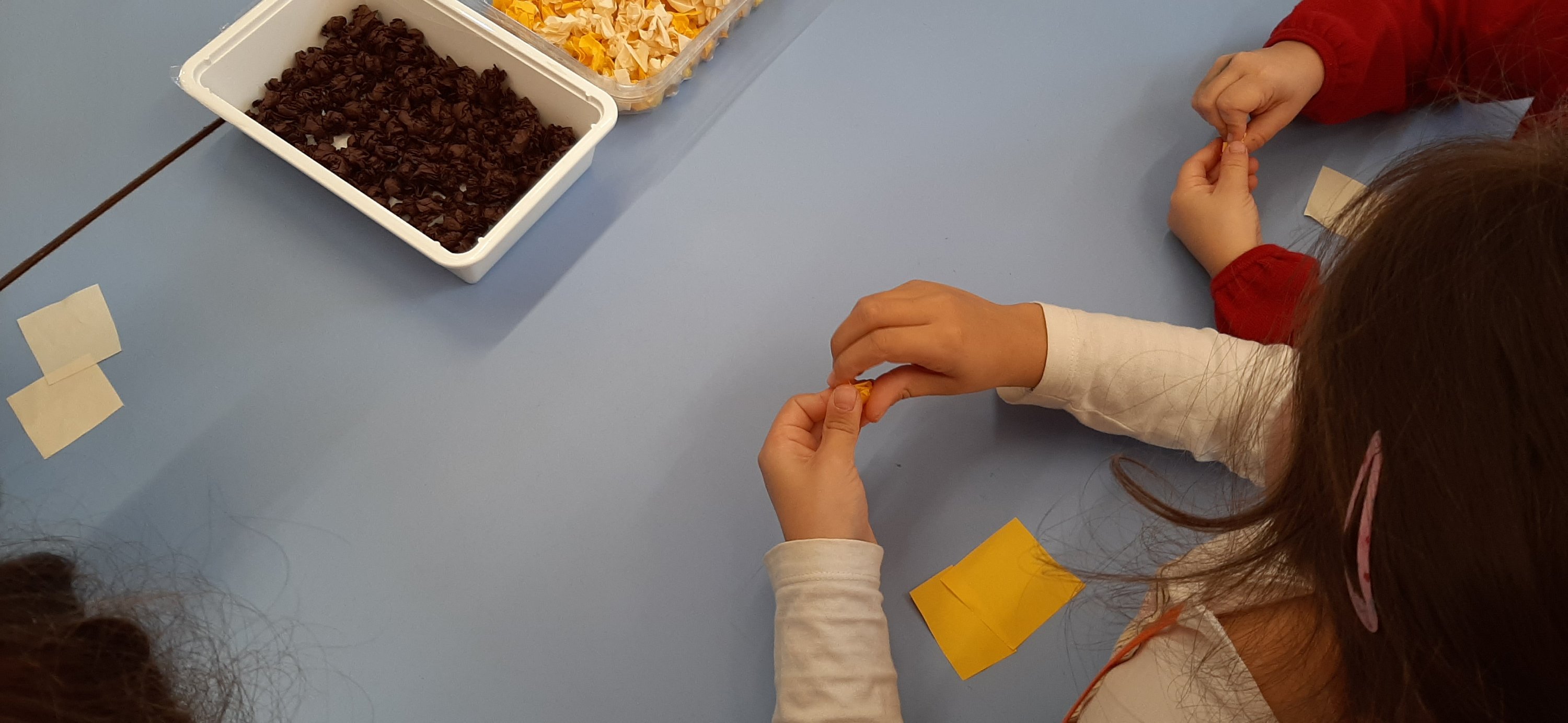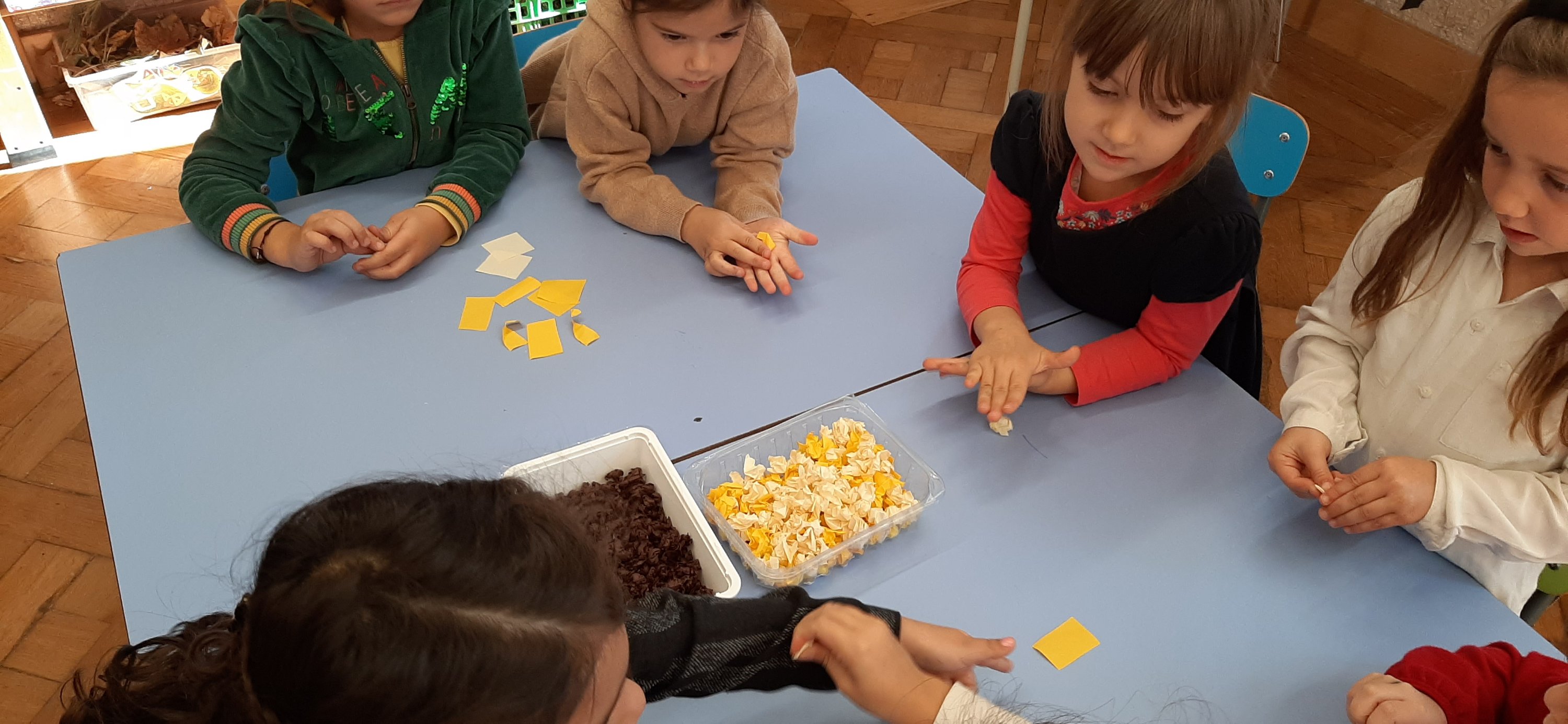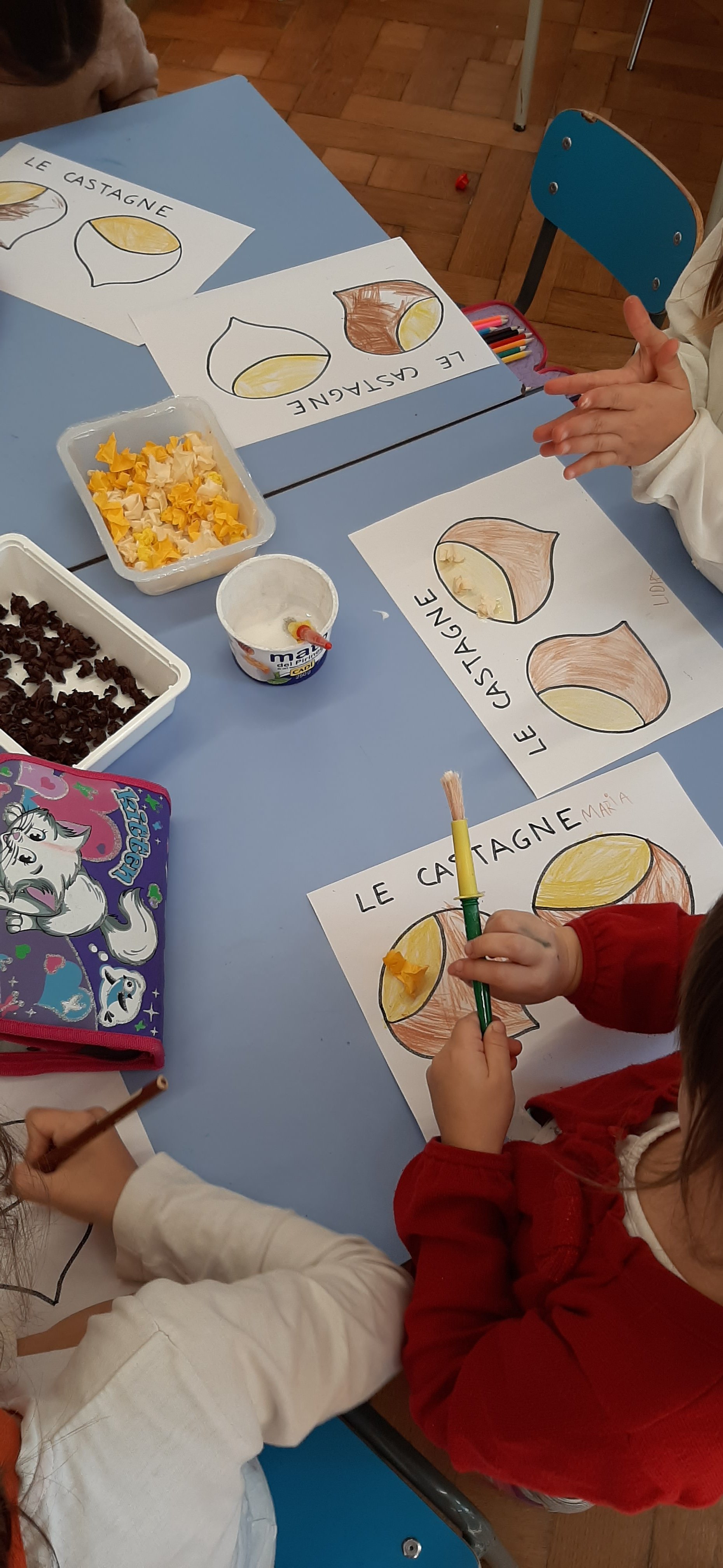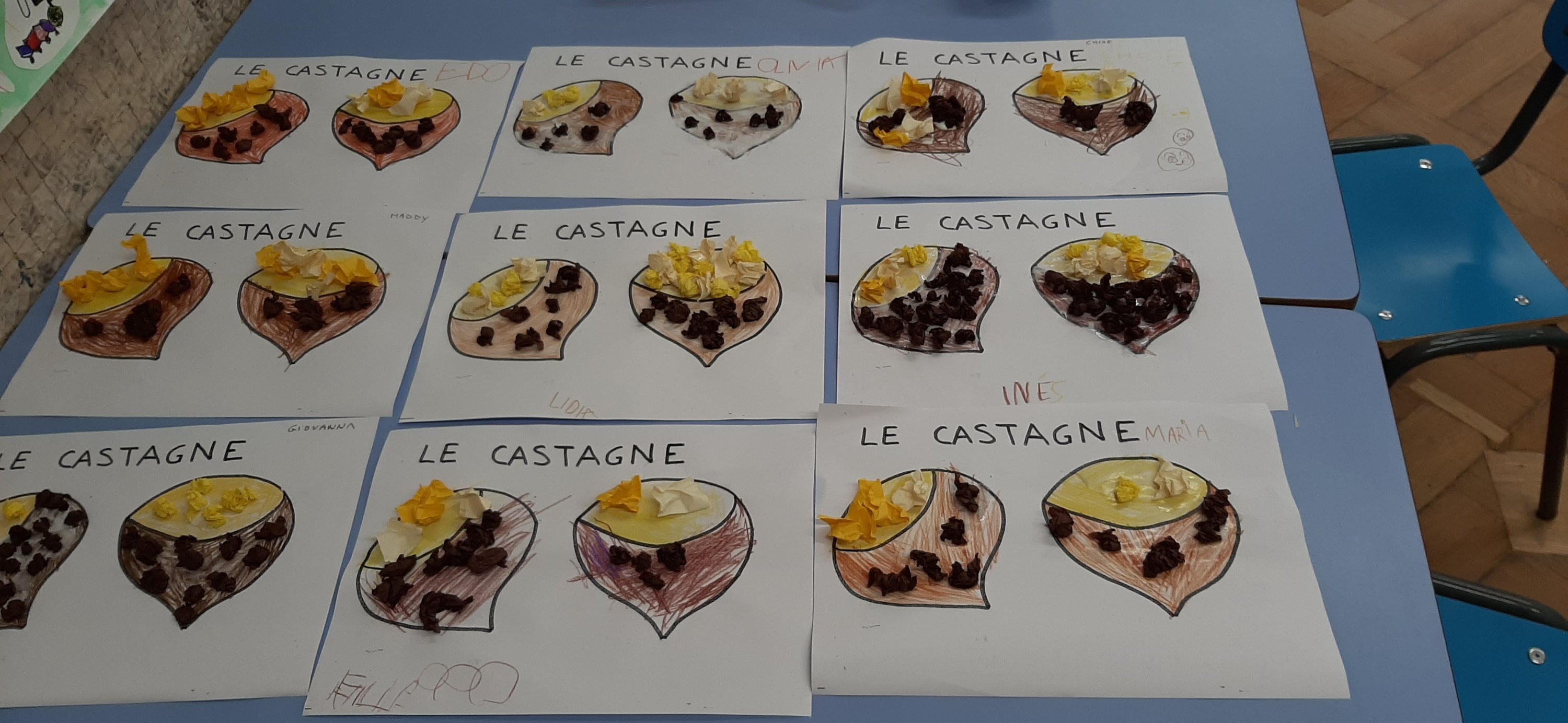 Con la storia di “Riccio Spinoso, dal cuore generoso”, abbiamo continuato a scoprire i buoni frutti d’autunno, come le castagne che sebbene nascoste dentro un riccio protettivo, hanno un ottimo sapore. Poi con matite e carta velina abbiamo ricreato le nostre castagne.