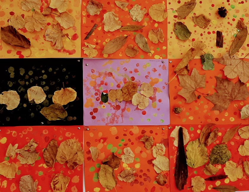 Ci siamo inoltre divertiti a fare frottage in rilievo con le cere, scoprendo i caldi colori d’autunno e le loro sfumature. Con le pigne, foglie, cortecce e bacche, raccolte nei parchi abbiamo creato dei meravigliosi collage con elementi naturali, incollati su degli sfondi dipinti da noi con la técnica del puntinismo.