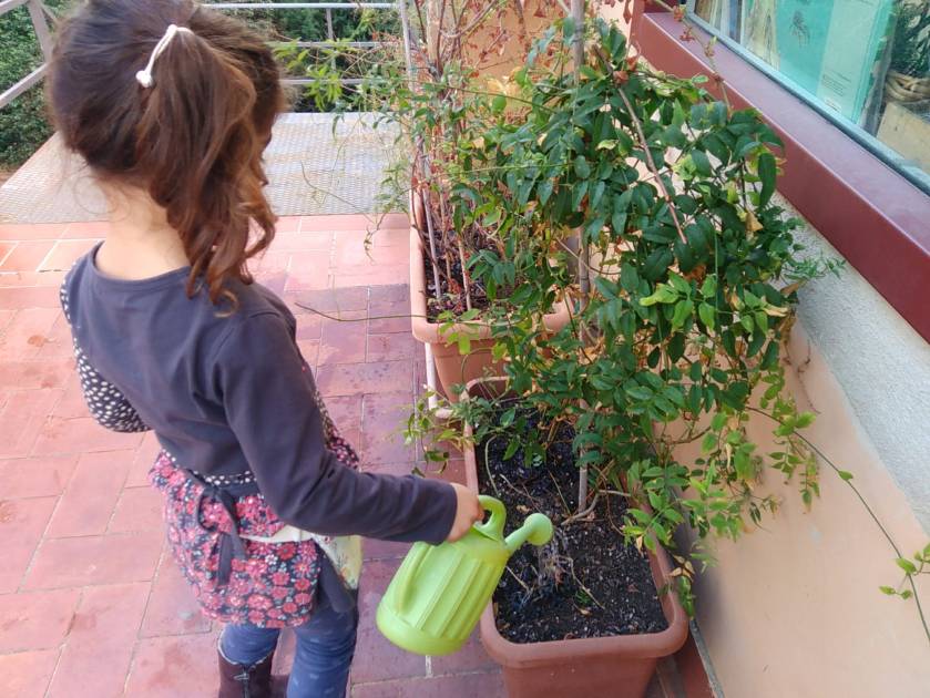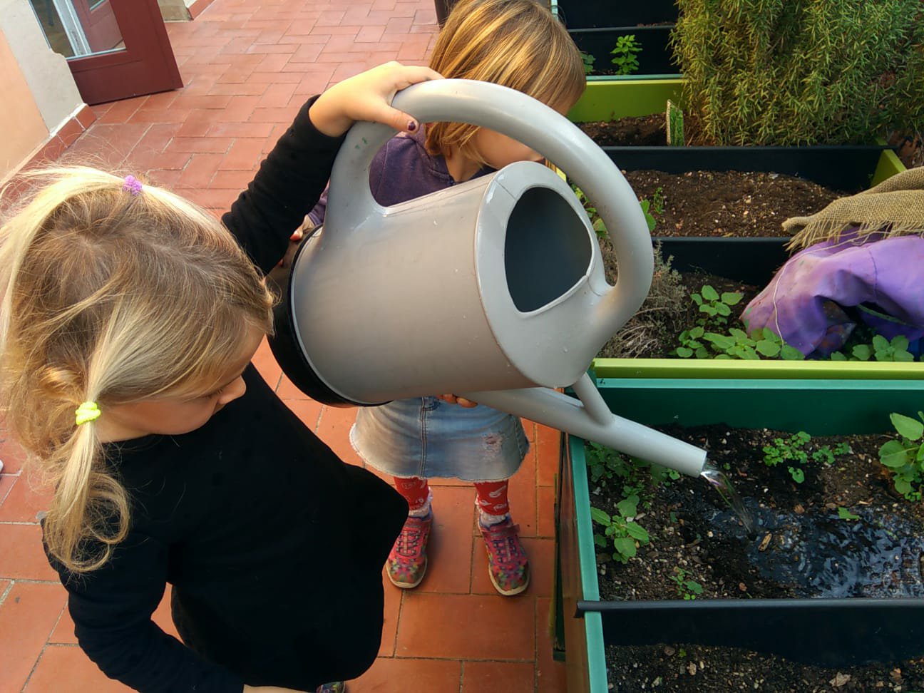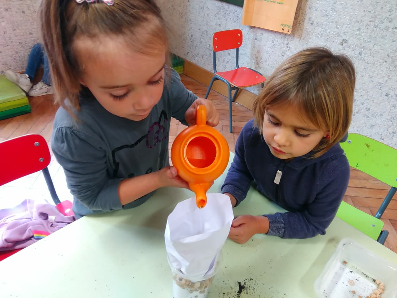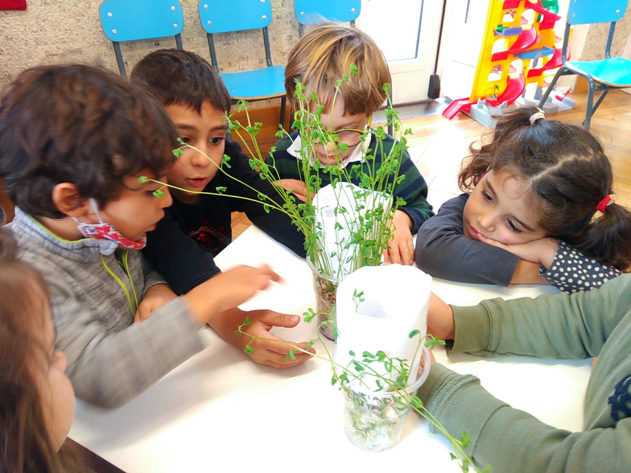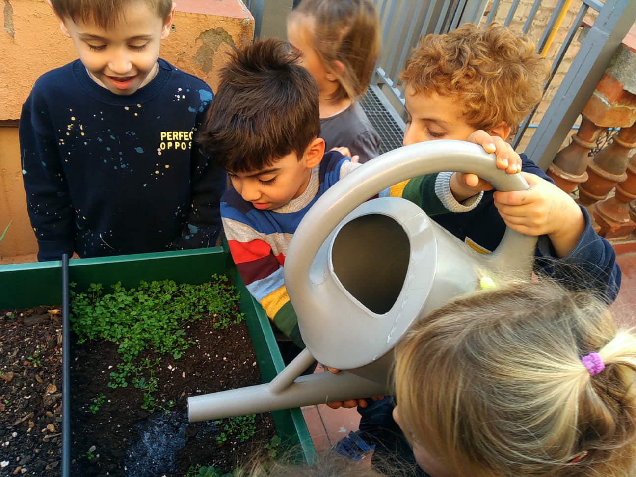 Con molto entusiasmo ci prendiamo cura del nostro orto. Dopo averlo ripulito per bene, piantiamo semini ed ortaggi. Annaffiamo i fiori e le erbe aromatiche. Scopriamo che legumi, tuberi e bulbi, se lasciati riposare con umiditá, generano verdi germogli che daranno poi origine a nuove piantine.