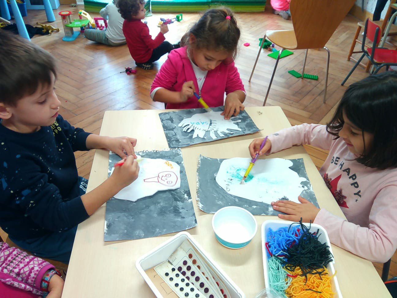 Sulle tracce della girandola delle emozioni di Aleandro, abbiamo ripreso il filo conduttore, parlando della paura e di tutto ció che ci spaventa. Prendendo spunto dalle letture: ” Io e la mía paura” di F. Sanna e ” Non dormi piccolo orso?” di M. Waddell, abbiamo raccontato di quello che ci fa paura. Mostri, fantasmi, ragni, streghe, polpi, serpenti, e perfino dottori e uomini del sacco, ci spaventano. Peró, parlando insieme, abbiamo capito che in realtá anche la paura serve. Infatti proviamo questa emozione di fronte a possibili pericoli o a qualcosa che non vediamo o conosciamo. Abbiamo scoperto che tutti proviamo piccole paure, che pian piano si possono vincere.