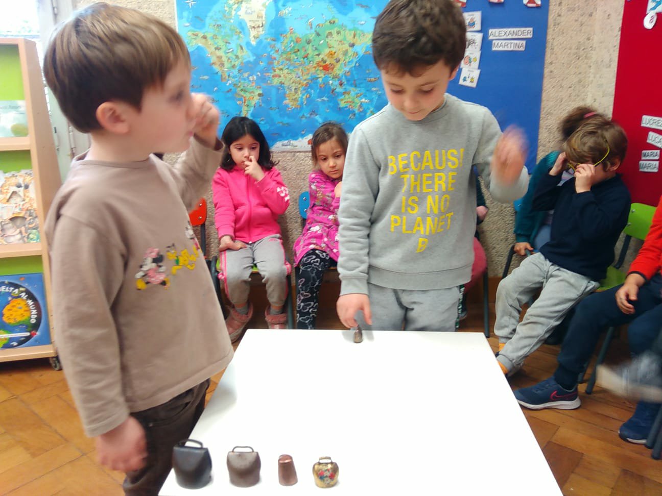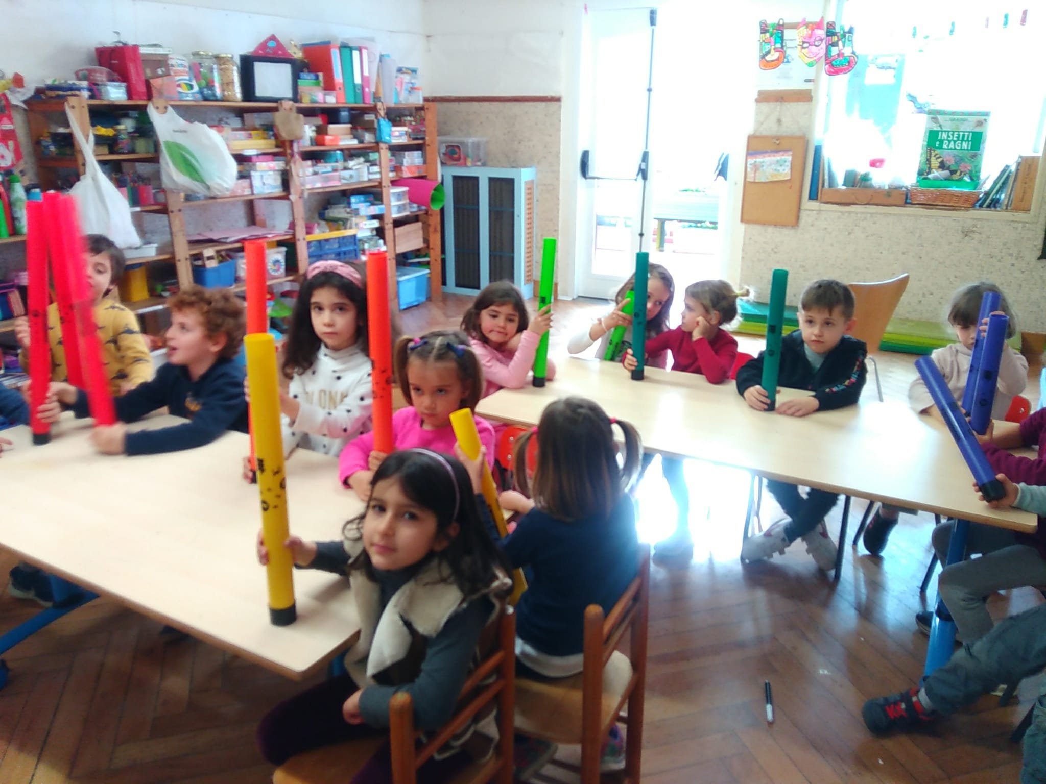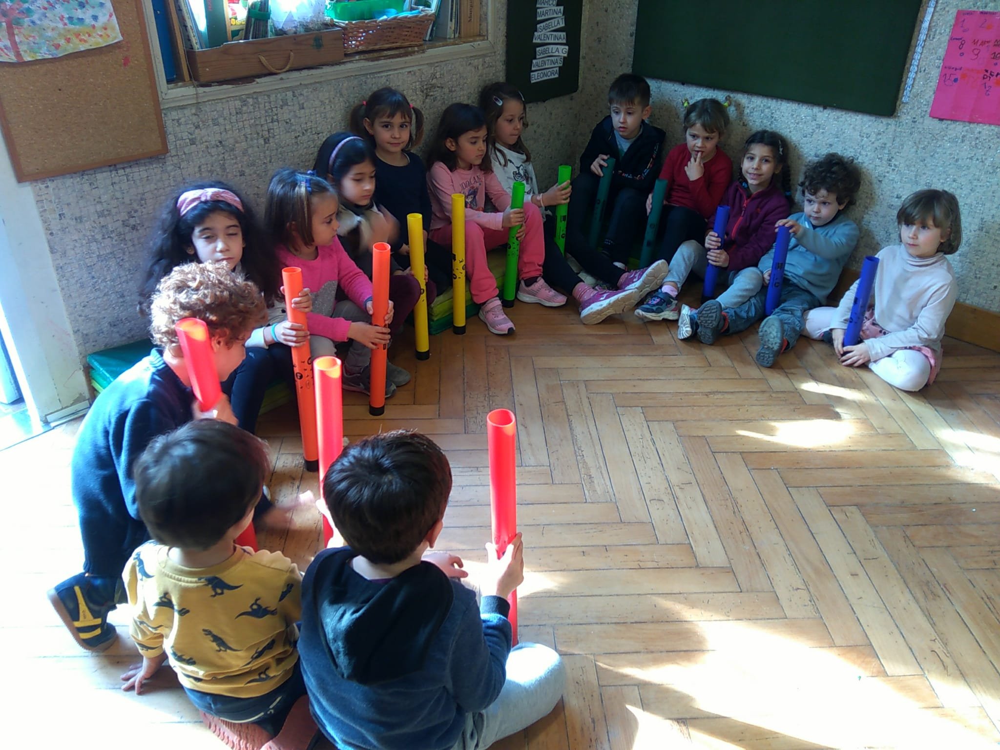 I bambini e le bambine dei 5 anni stanno continuando il loro percorso nell’apprendimento della musica. Stanno imparando insieme i ritmi e la scala musicale, attraverso il gioco dei campanellini da ordinare. Inoltre si stanno divertendo ad eseguire piccole melodie con i Boomwhackers.