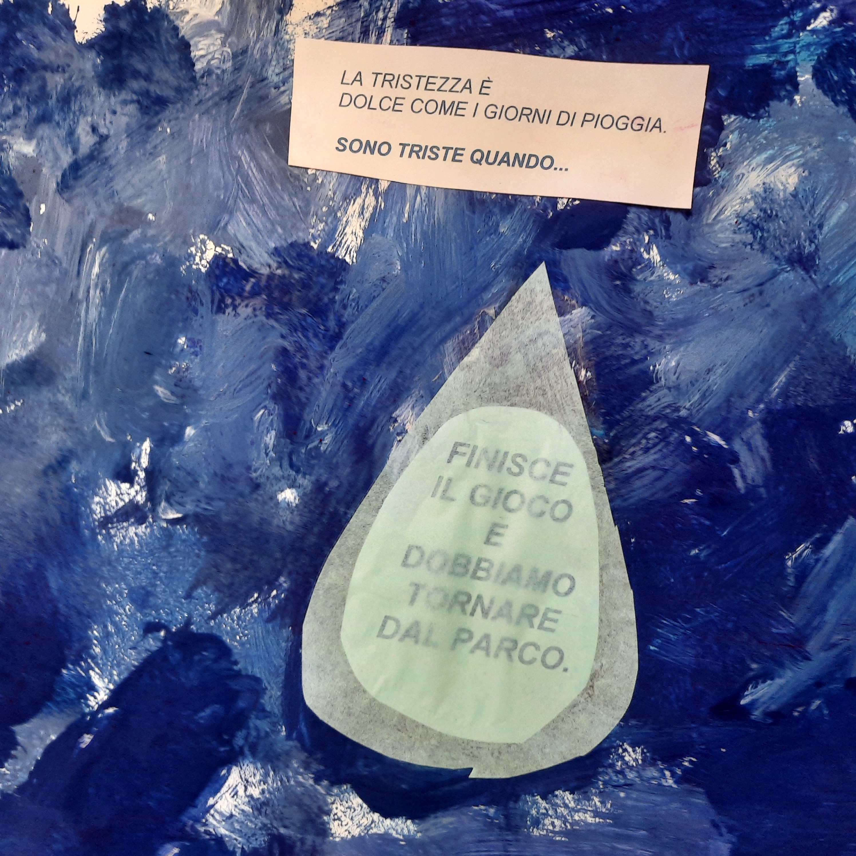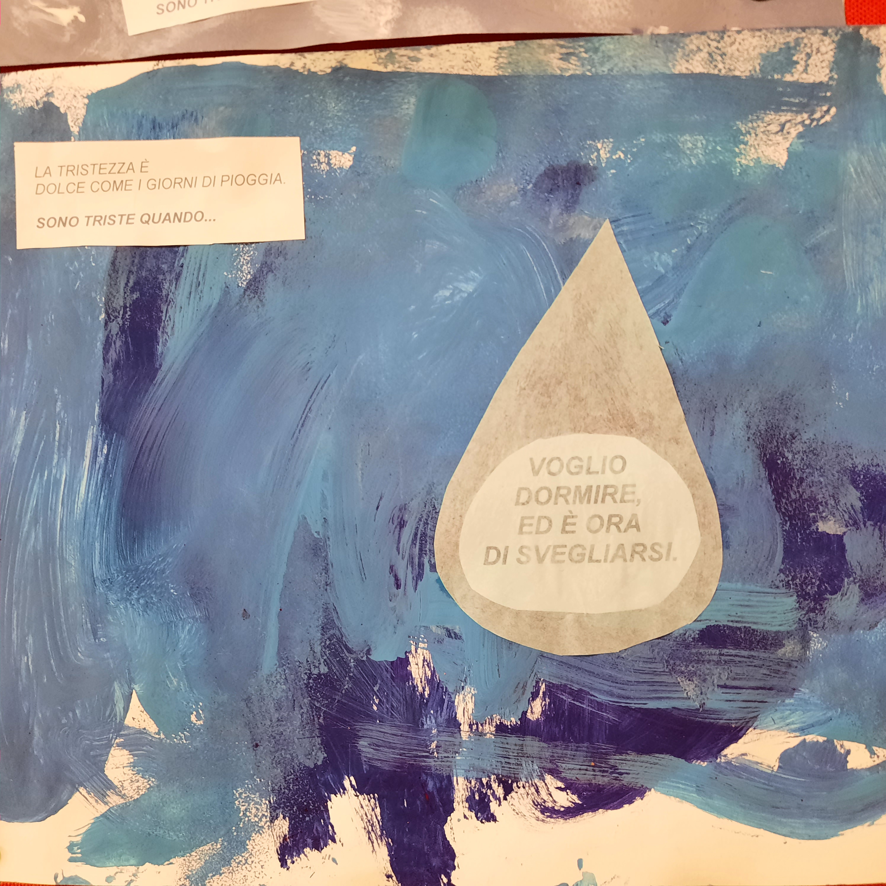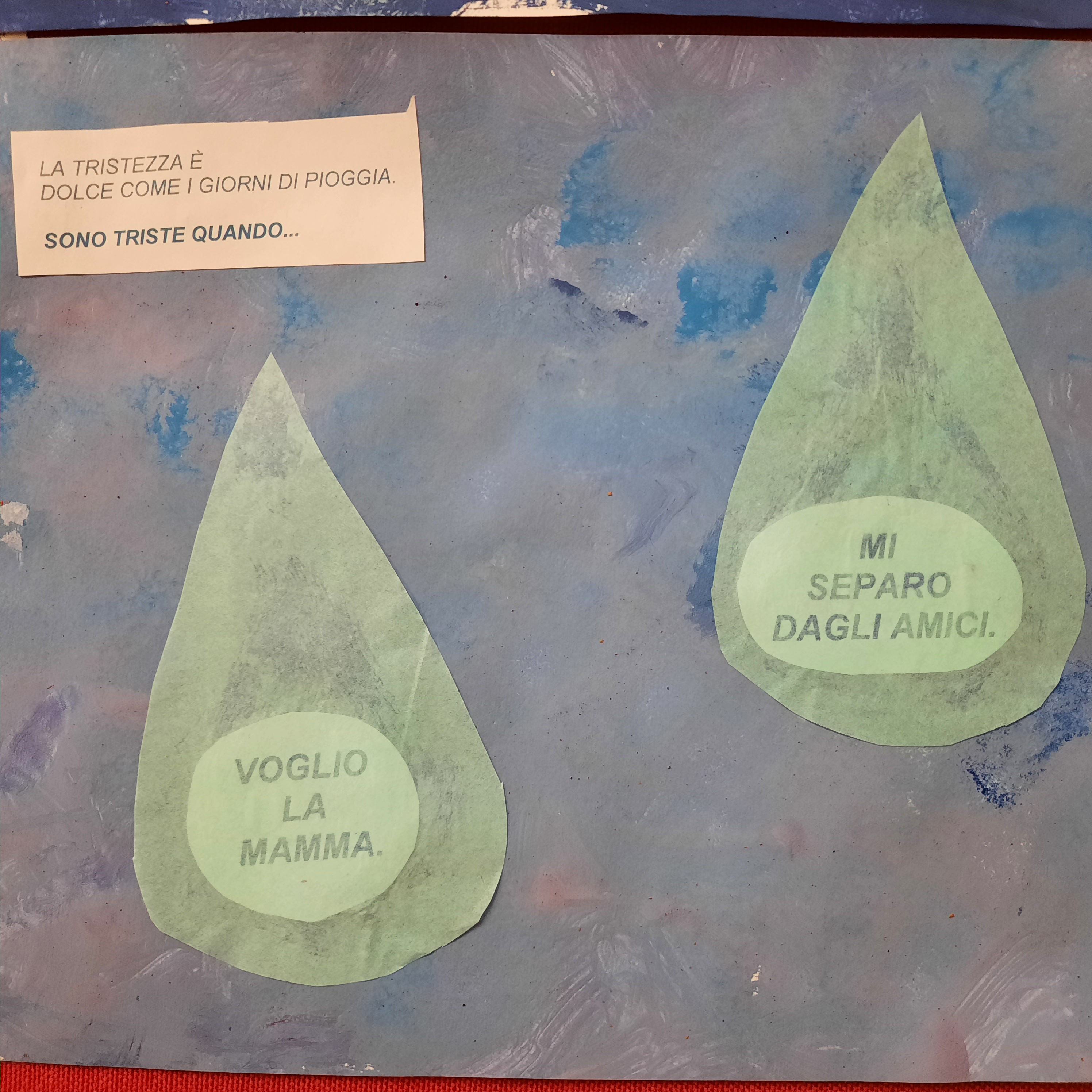 Nel libro: “I colori delle emozioni” la tristezza è blu, ed è così che le bambine ed i bambini dei P3 hanno amato rappresentarla, blu come una gocciolina di pioggia triste, che contiene la loro esperienza personale.