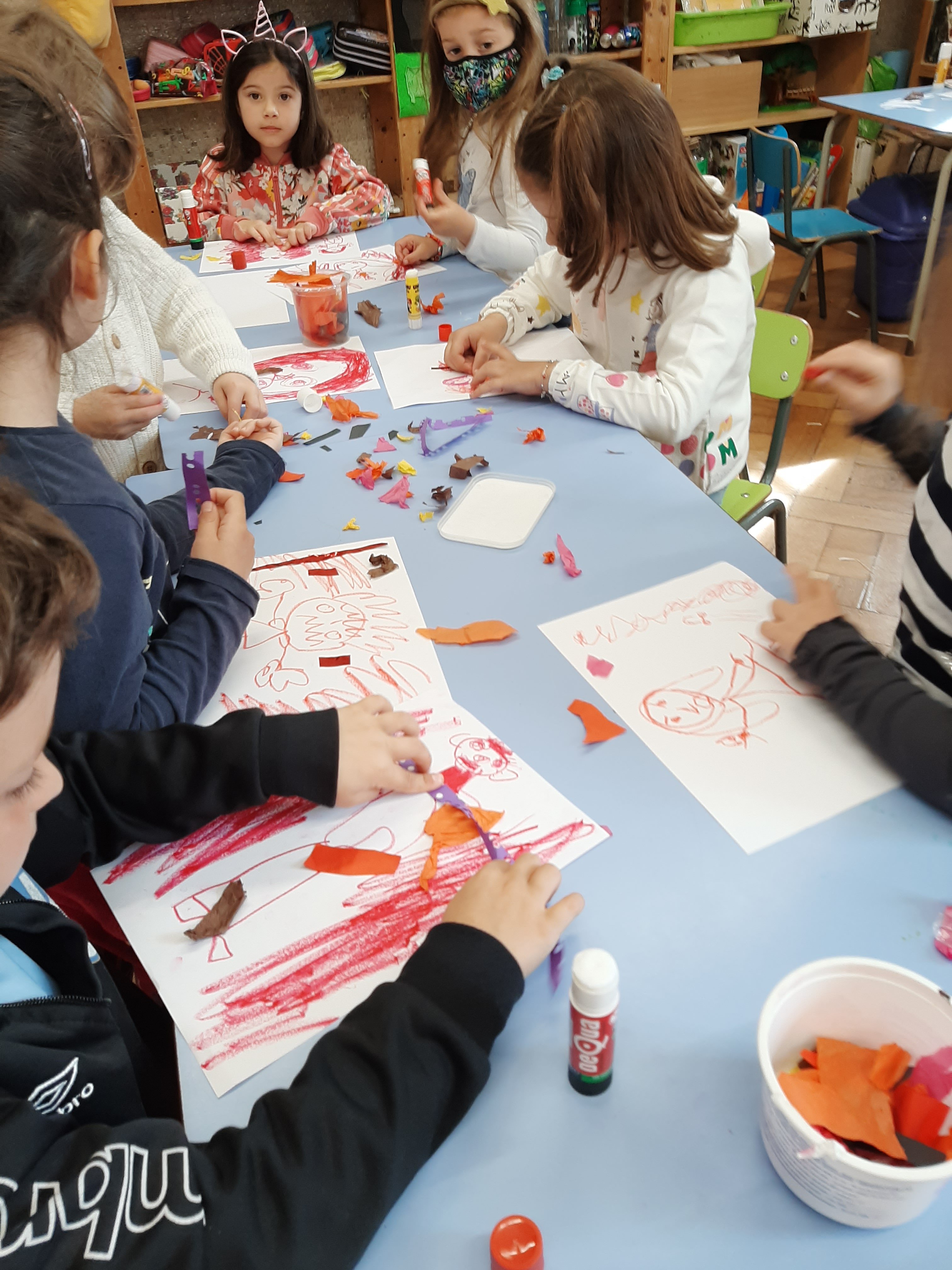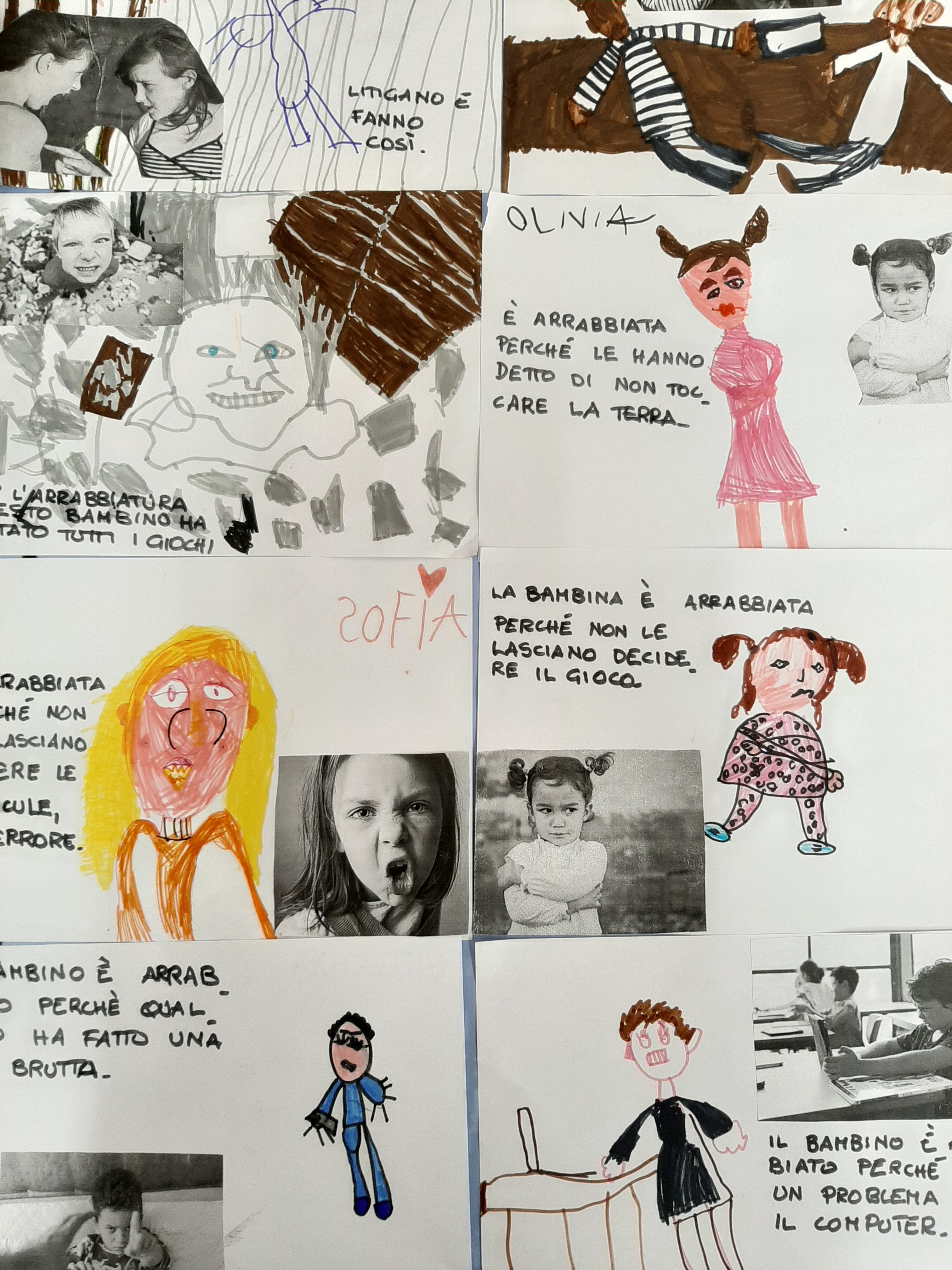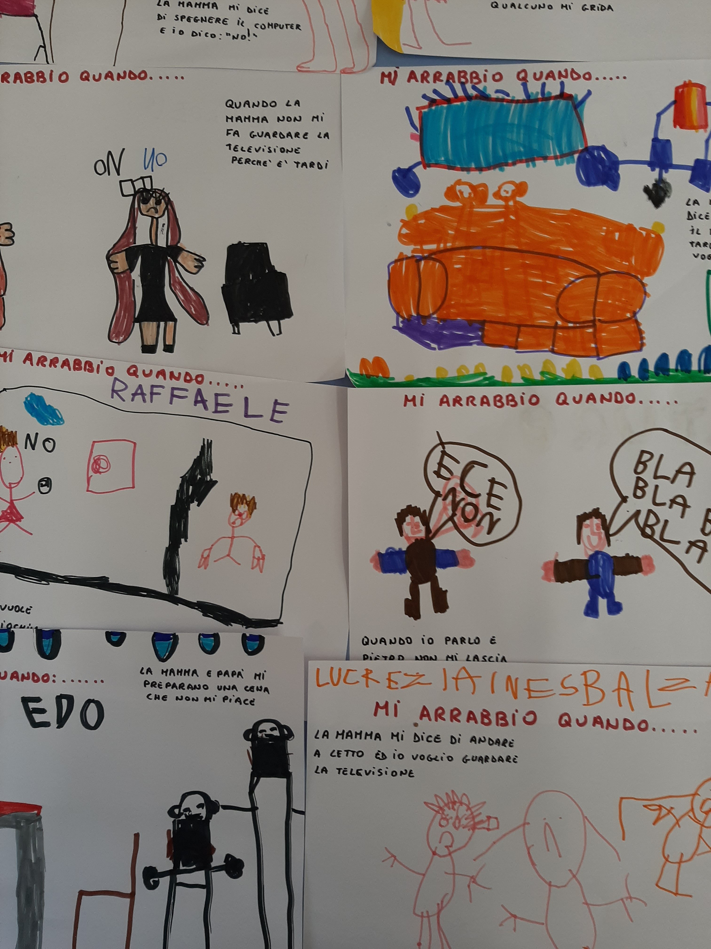 Quindi abbiamo discusso delle cose che ci fanno arrabbiare. Perché e in che modo ci arrabbiamo e poi cosa facciamo per calmarci. “Mi arrabbio quando mío fratello non mi fa parlare”,”Quando la mamma mi dice di andare a letto ed io voglio ancora guardare la televisione”, ” Quando mia sorella non mi fa giocare”. Con fogli e pennarelli abbiamo riprodotto i momenti in cui ci arrabbiamo. Attraverso delle foto abbiamo riconosciuto le espressioni della rabbia e abbiamo giocato a rifarle attraverso la mímica facciale e la postura del nostro corpo.