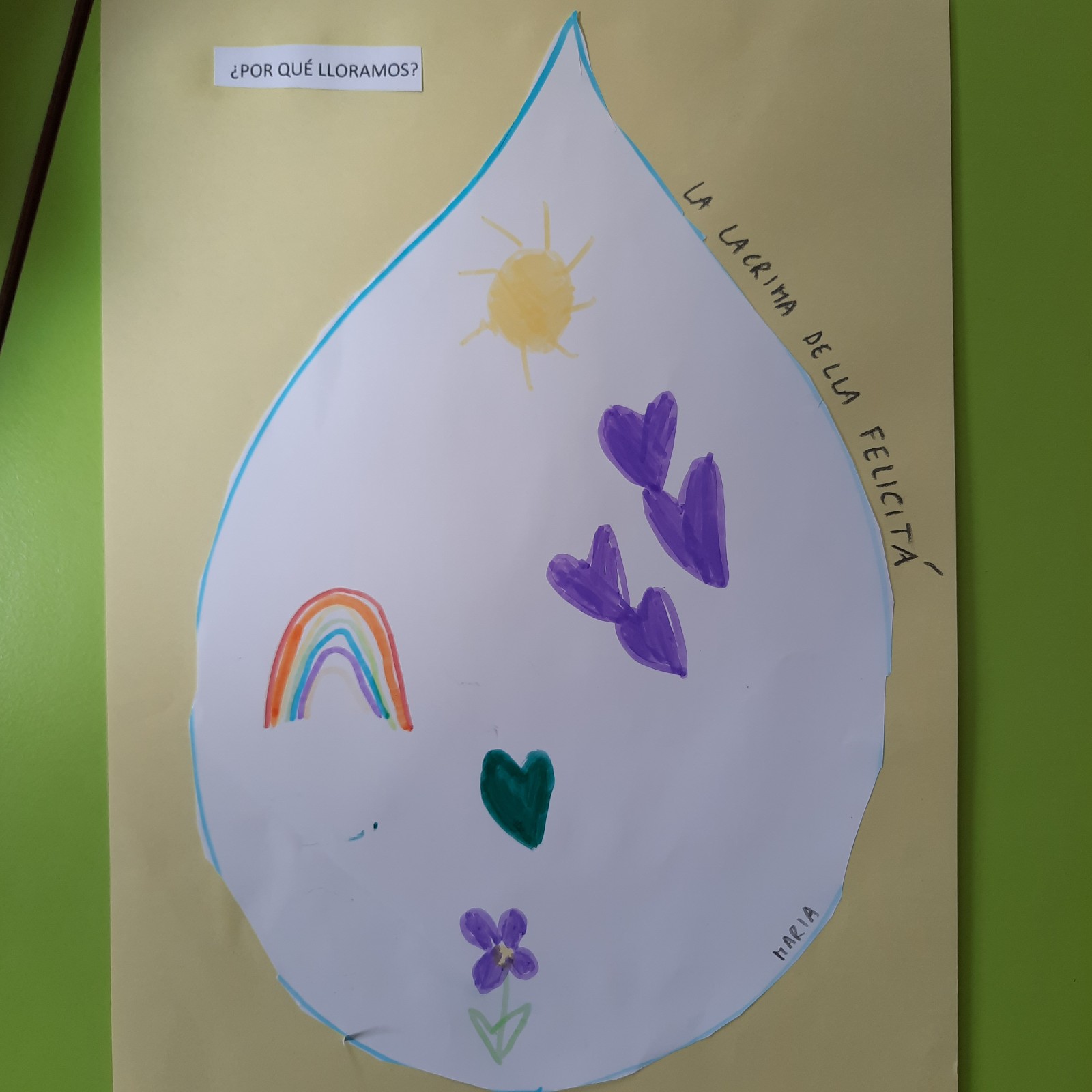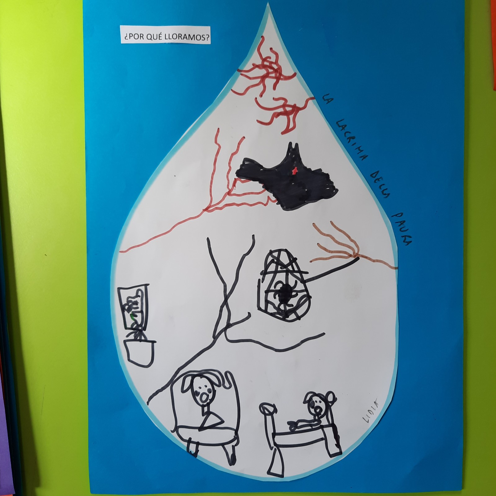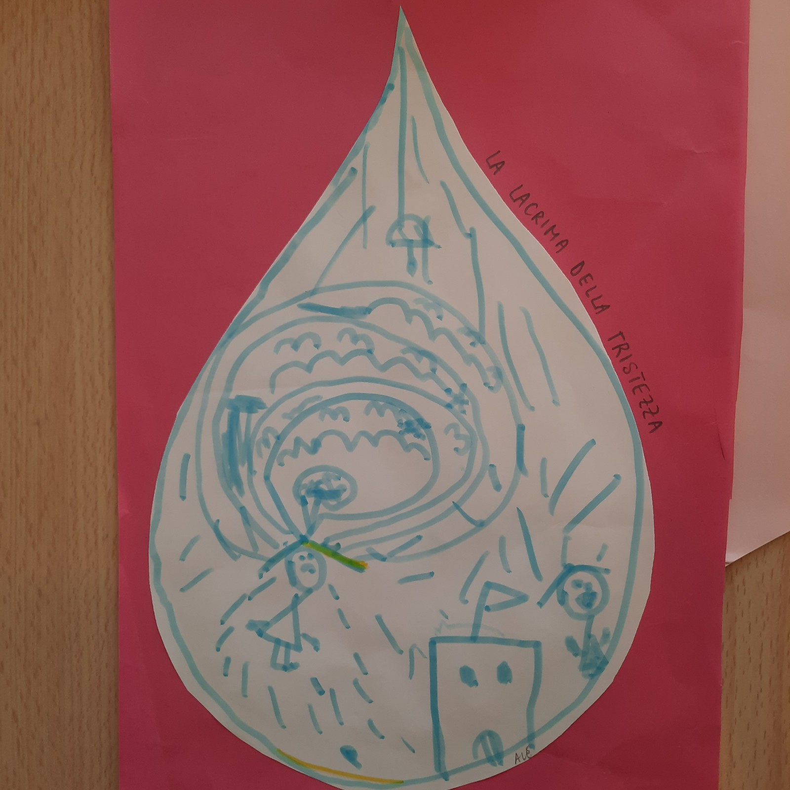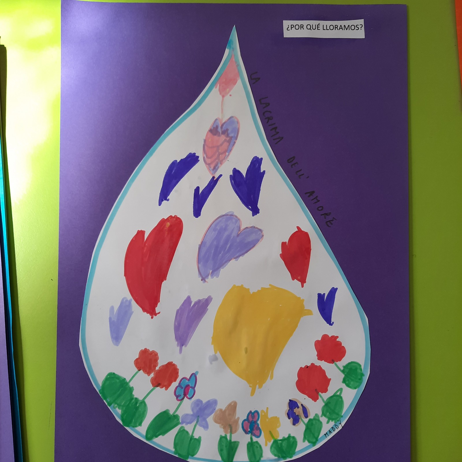 Dopo la lettura, le bambine e i bambini di 4 e 5 anni hanno provato ad immaginare e a rappresentare la composizione di una lacrima, come se la vedessero al microscopio. Che aspetto potrebbe presentare, a seconda dell’emozione che l’ha fatta scaturire?