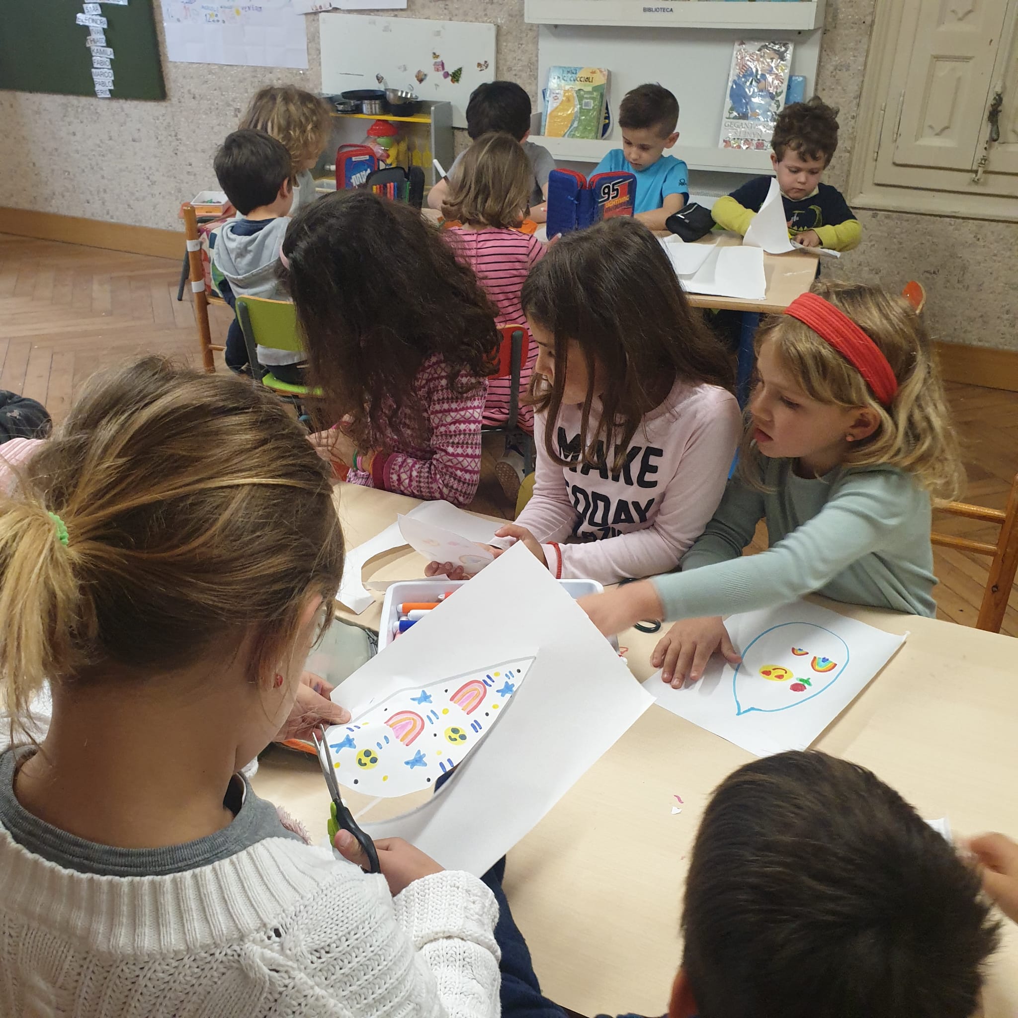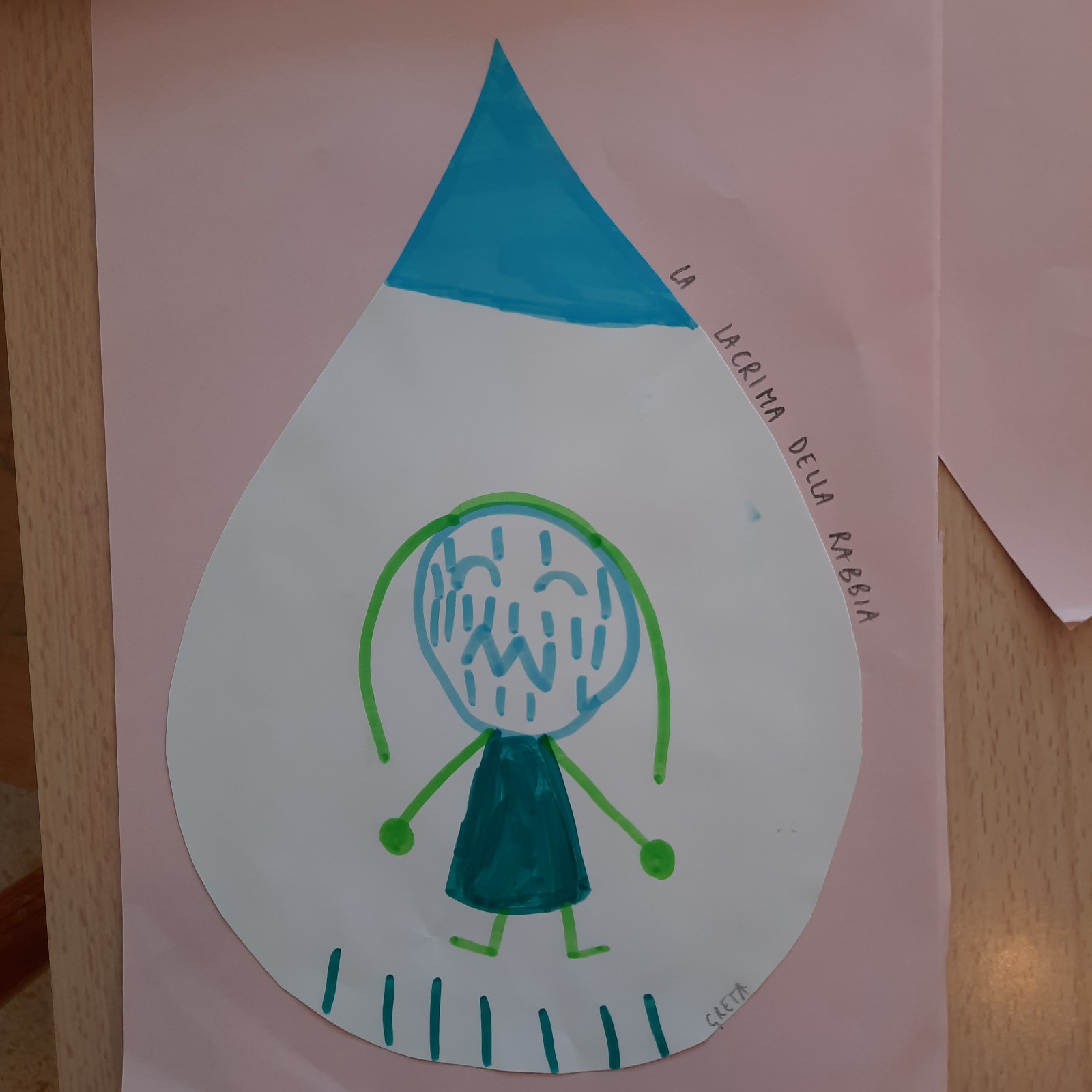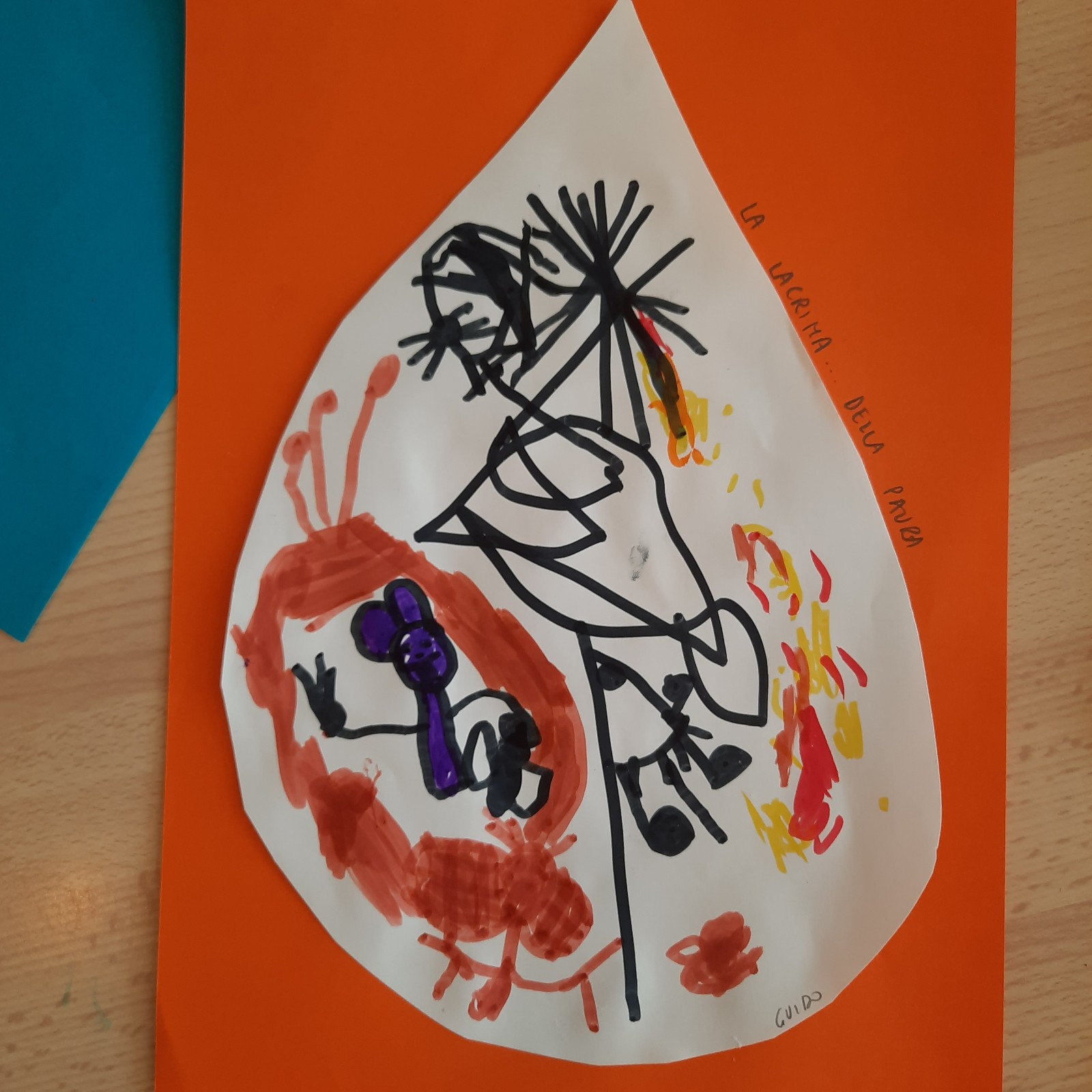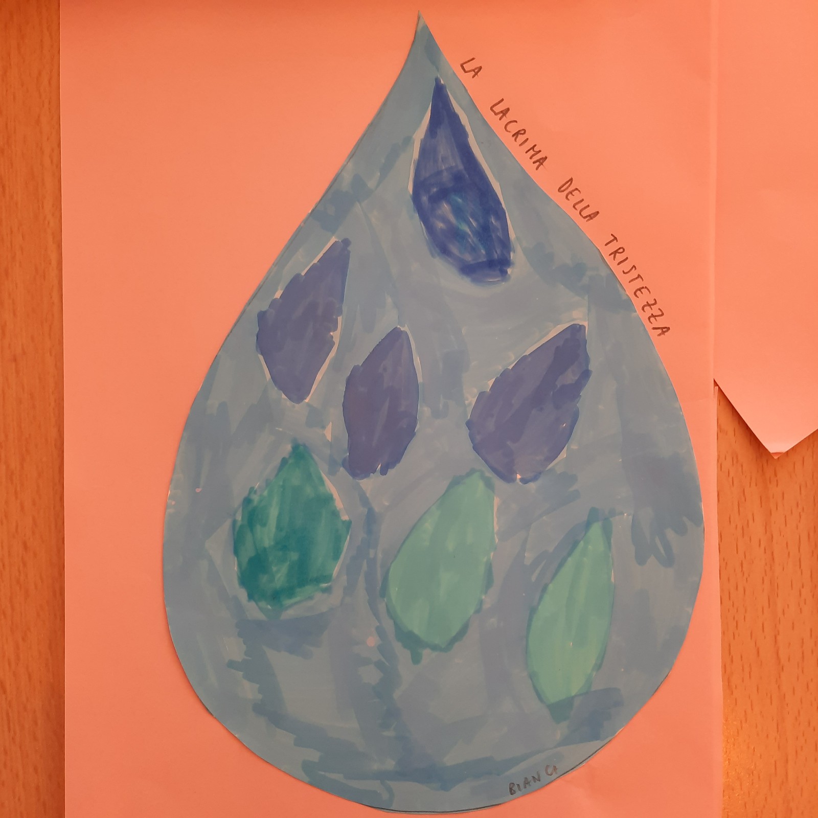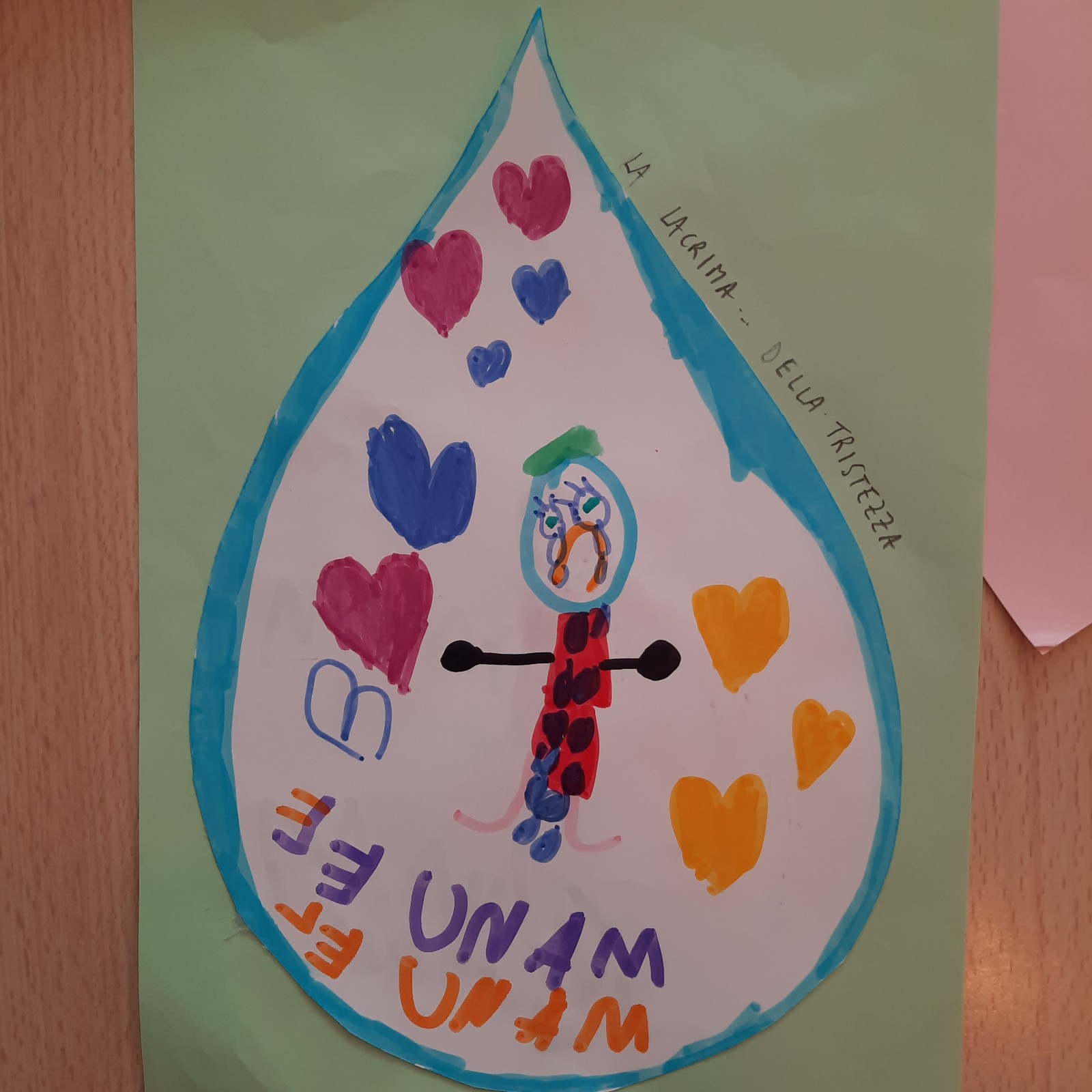 Dopo la lettura, le bambine e i bambini di 4 e 5 anni hanno provato ad immaginare e a rappresentare la composizione di una lacrima, come se la vedessero al microscopio. Che aspetto potrebbe presentare, a seconda dell’emozione che l’ha fatta scaturire?
