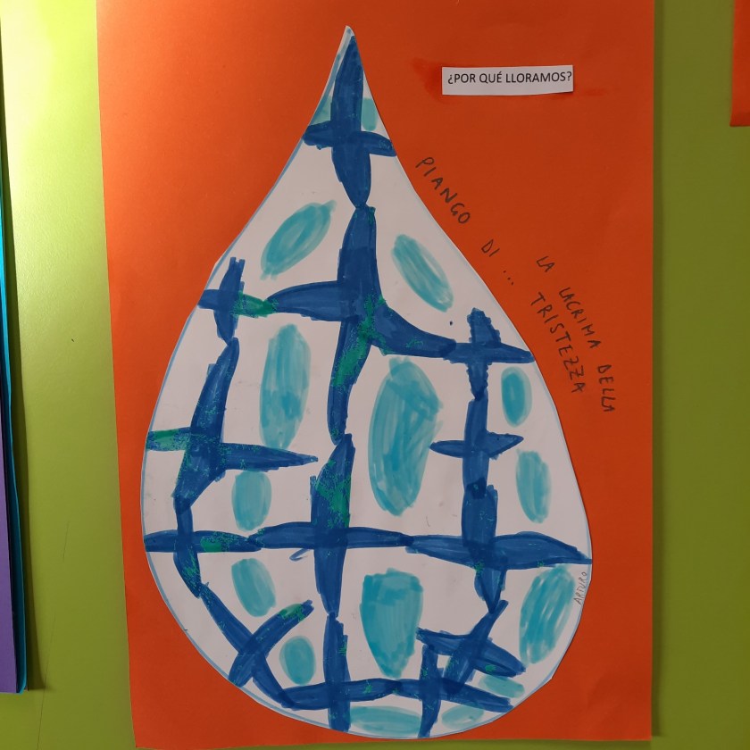 Dopo la lettura, le bambine e i bambini di 4 e 5 anni hanno provato ad immaginare e a rappresentare la composizione di una lacrima, come se la vedessero al microscopio. Che aspetto potrebbe presentare, a seconda dell’emozione che l’ha fatta scaturire?