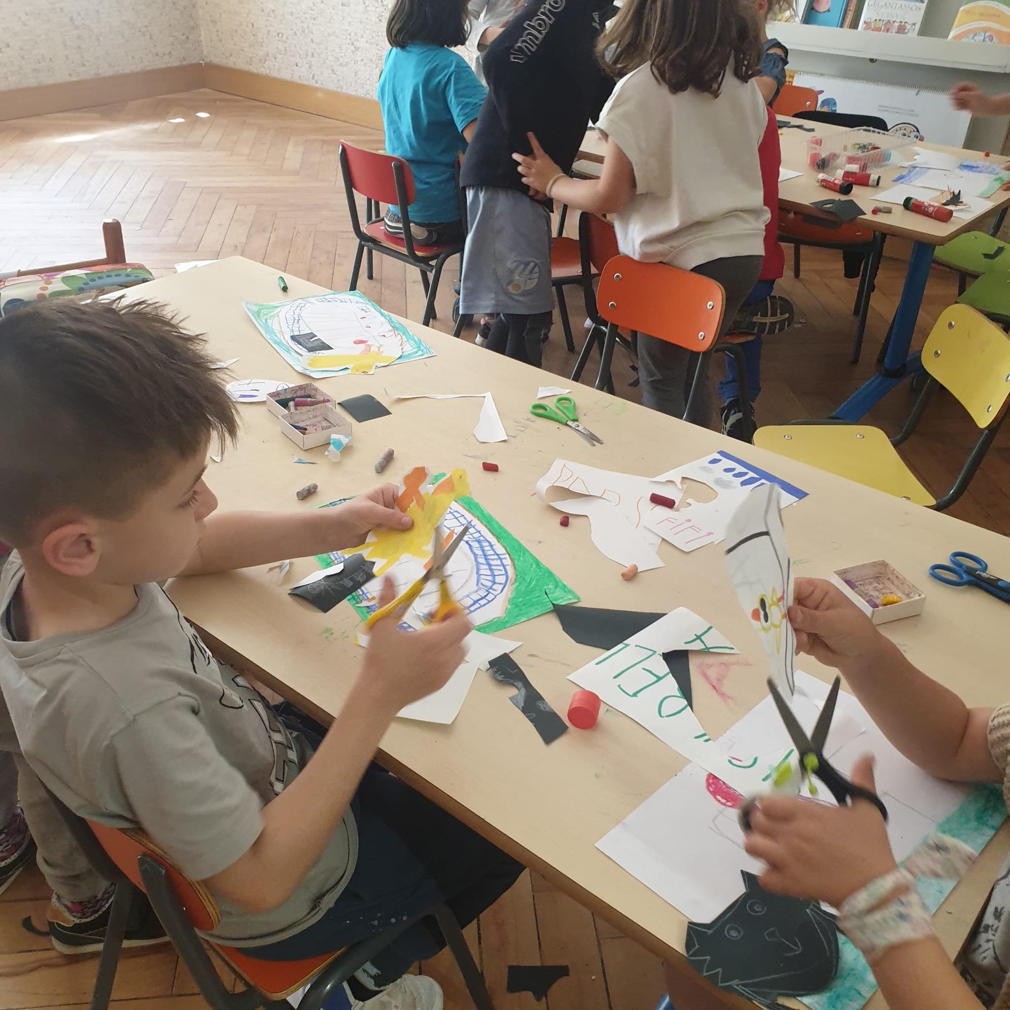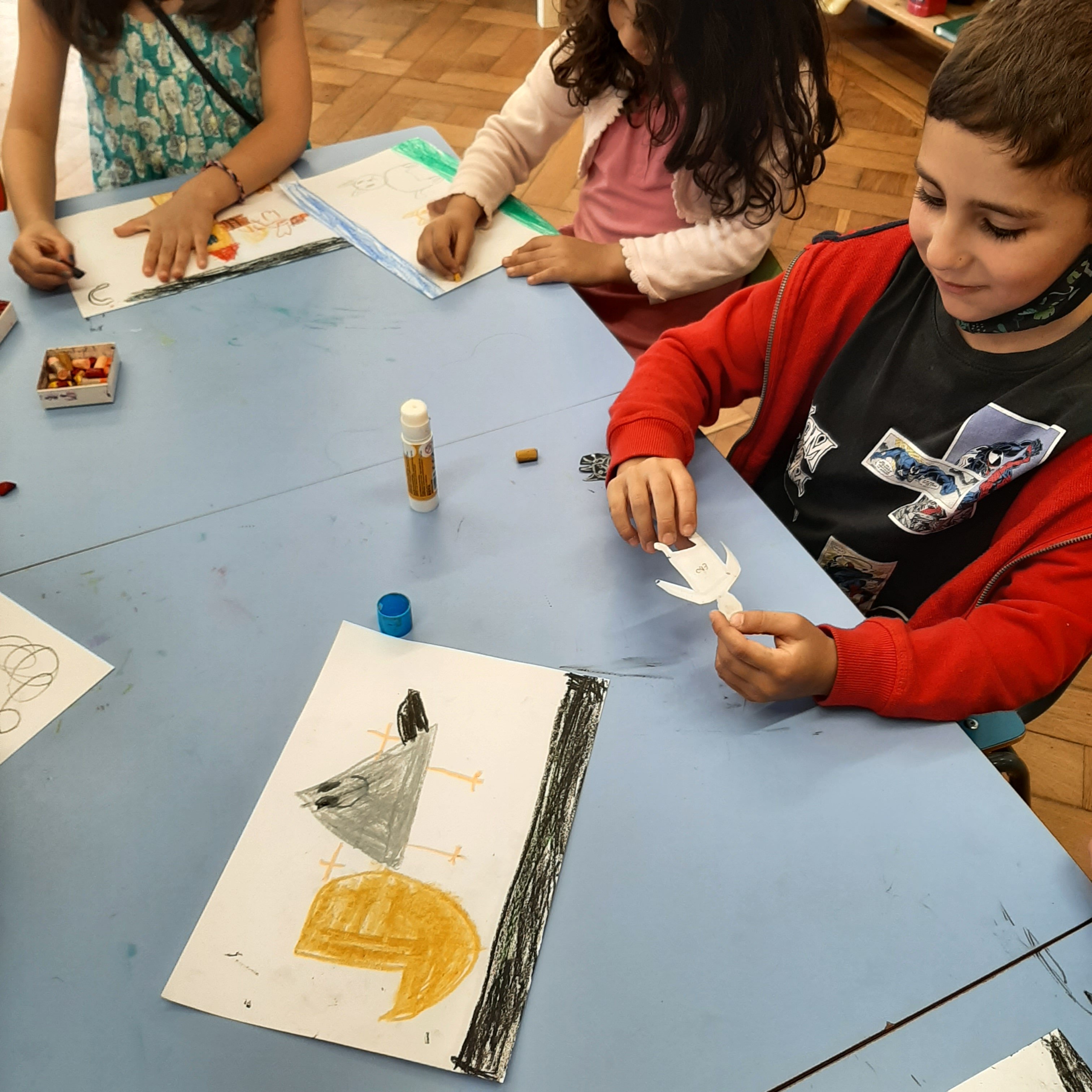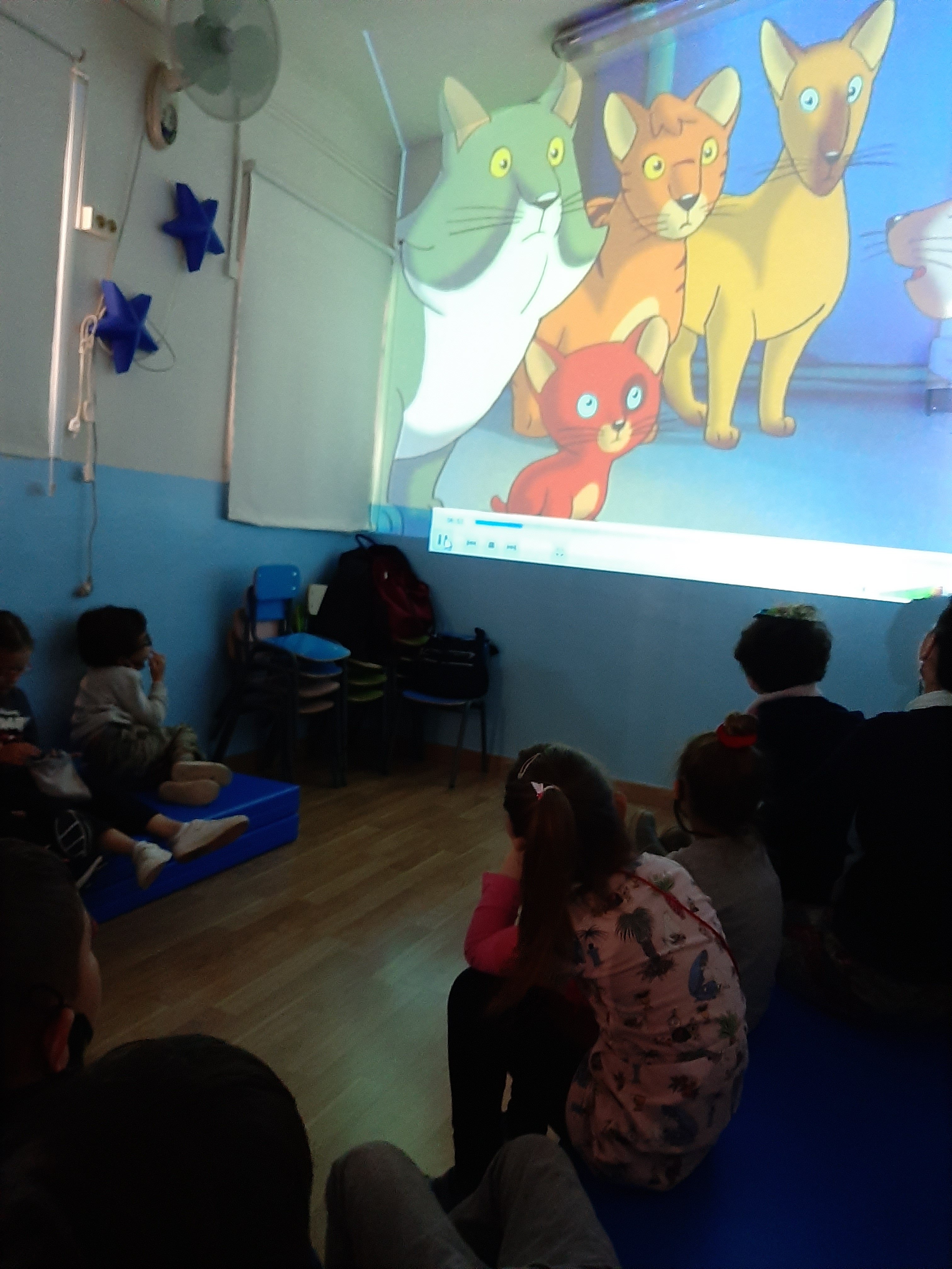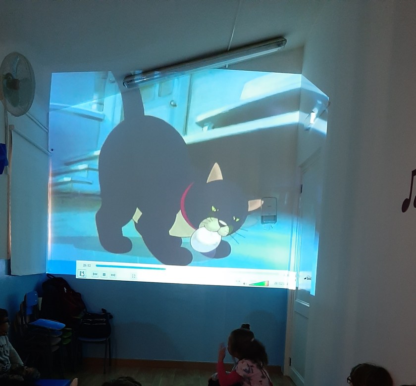 Dopo la visione, nei rispettivi gruppi dei gialli e dei verdi, é seguita una conversazione con i bambini e le bambine che hanno condiviso le loro impressioni sul film, ecco cosa hanno detto: “Le navi hanno messo il petrolio e per questo la mamma(Gabbiana) non puó respirare e neanche volare. ” Il gatto non mangia l’uovo perché si prende cura del piccolo, e ha fatto una promessa e le promesse si mantengono perché é un cuore leale”. “I gatti studiano nei libri perché non sanno, perché la mamma gabbiana é morta e loro non sanno! Per questo studiano! Hanno la mente aperta come gli esploratori e le esploratrici! ” Non mi sono piaciuti i topi, perché erano brutti e hanno preso la gabbianella, ma poi il film mi é piaciuto. “Ma poi i gatti l’hanno liberata”. “Il gatto piccolo prima era geloso, ma poi é stato amico della gabbianella “. ” Mi é piaciuto quando il gatto si prende cura della gabbianella e mi é piaciuto quando la gabbianella ha imparato a volare ma non mi é piaciuto quando la gabbianella ha detto addio a Zorba, perché vola e si separano”.” Ma maestra esiste il petrolio qui?”