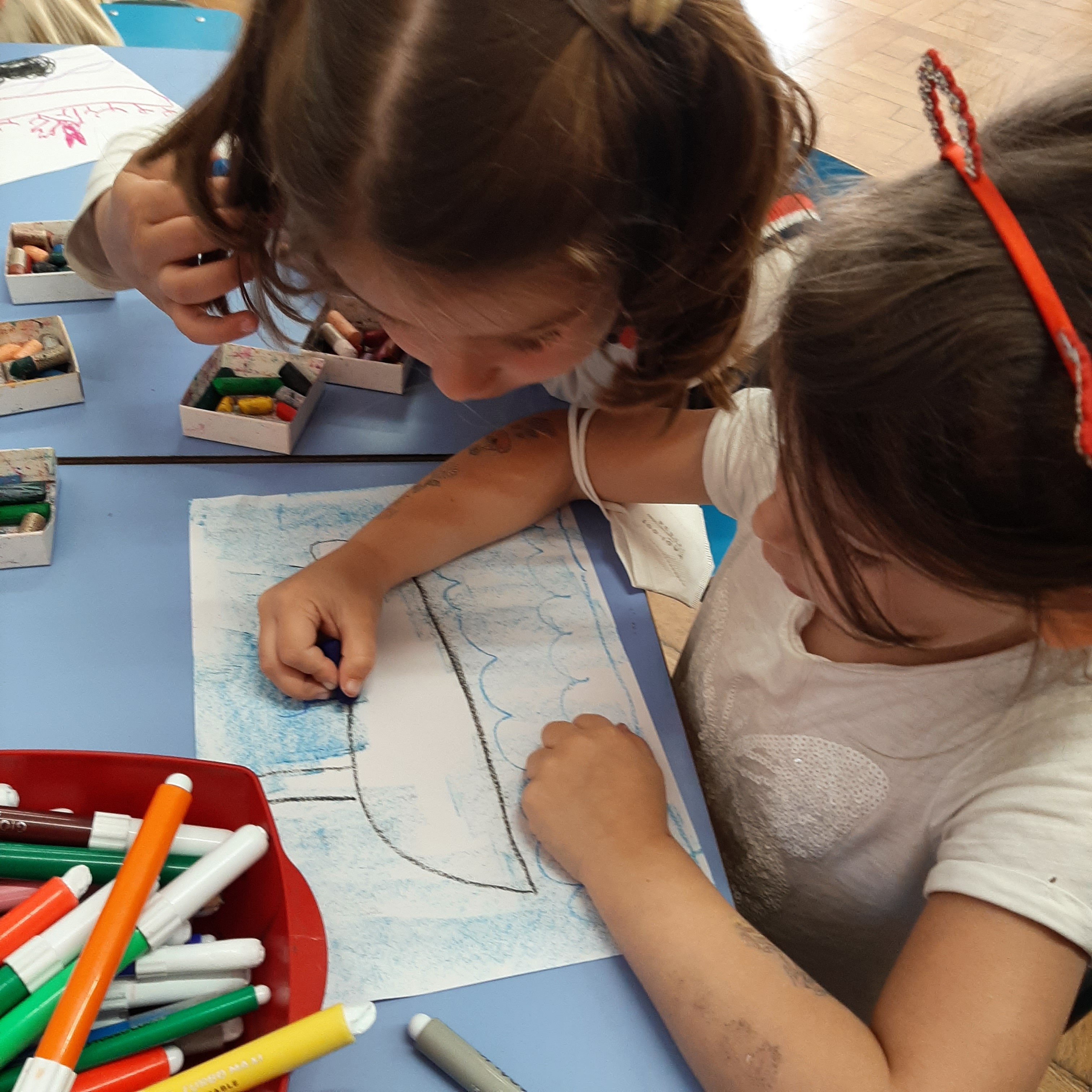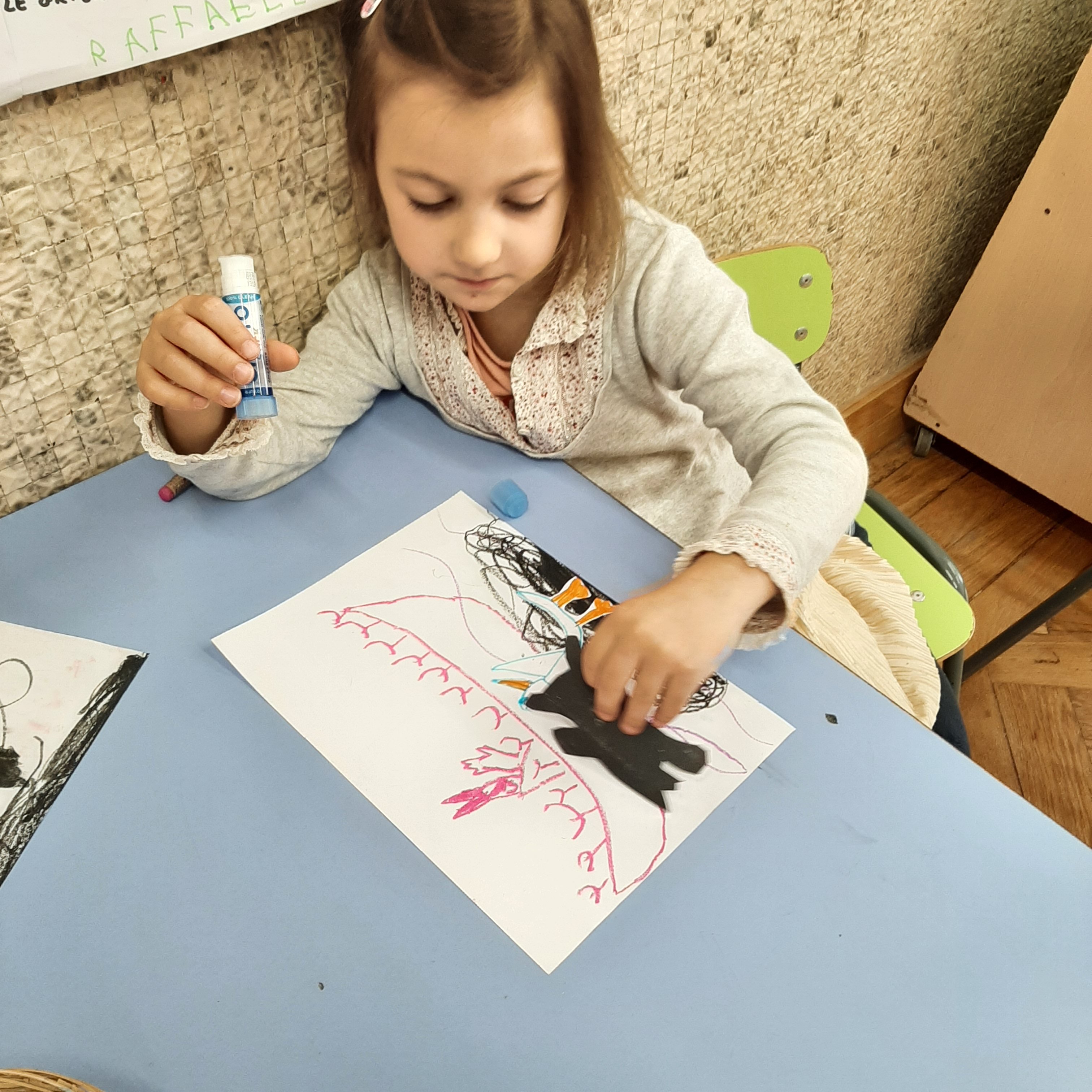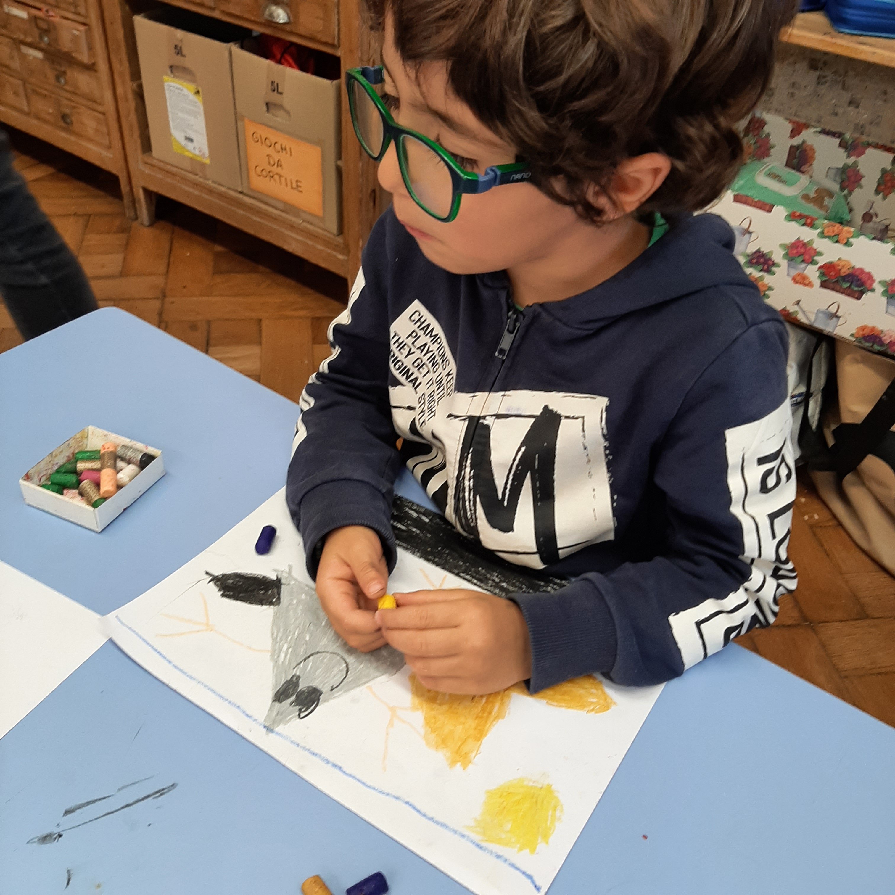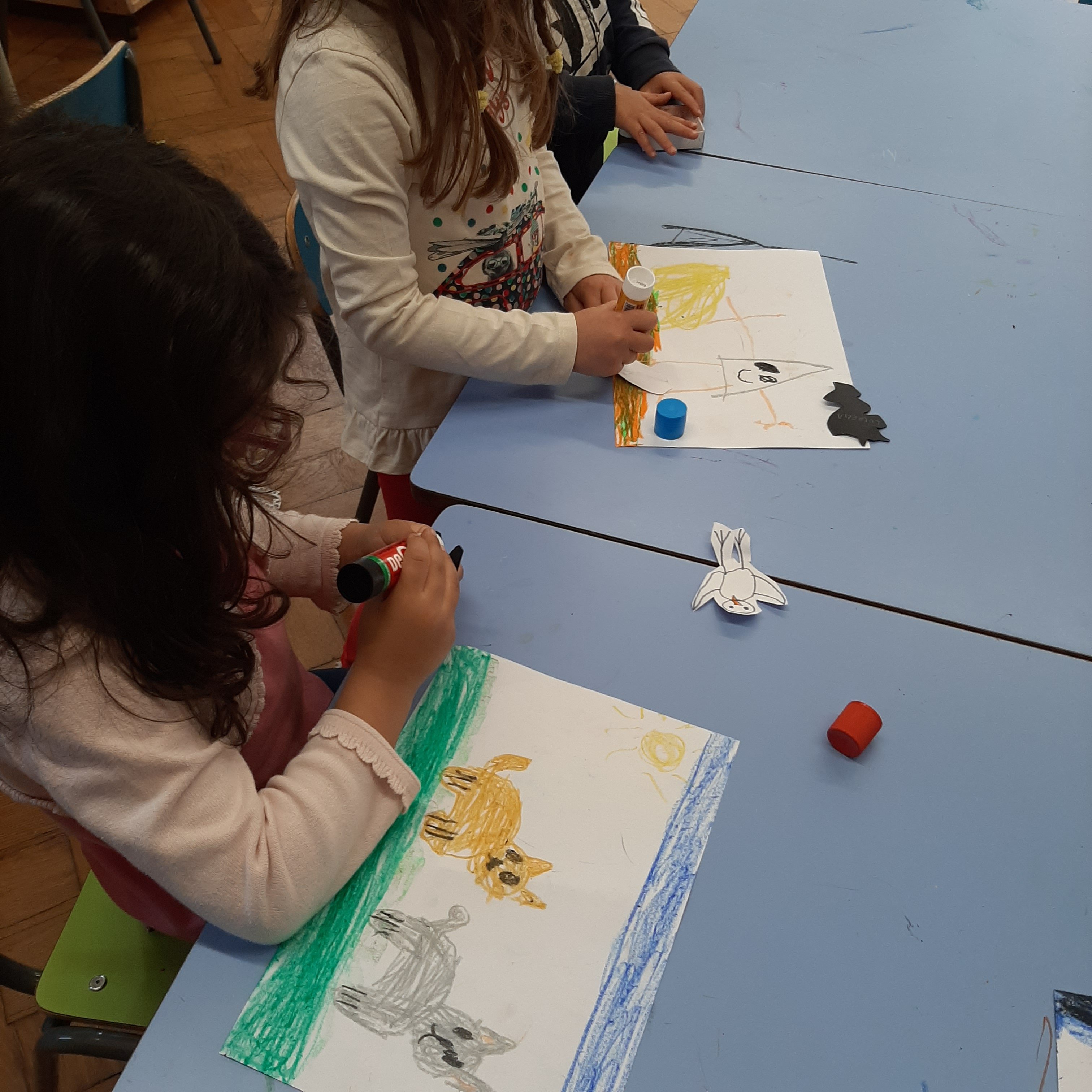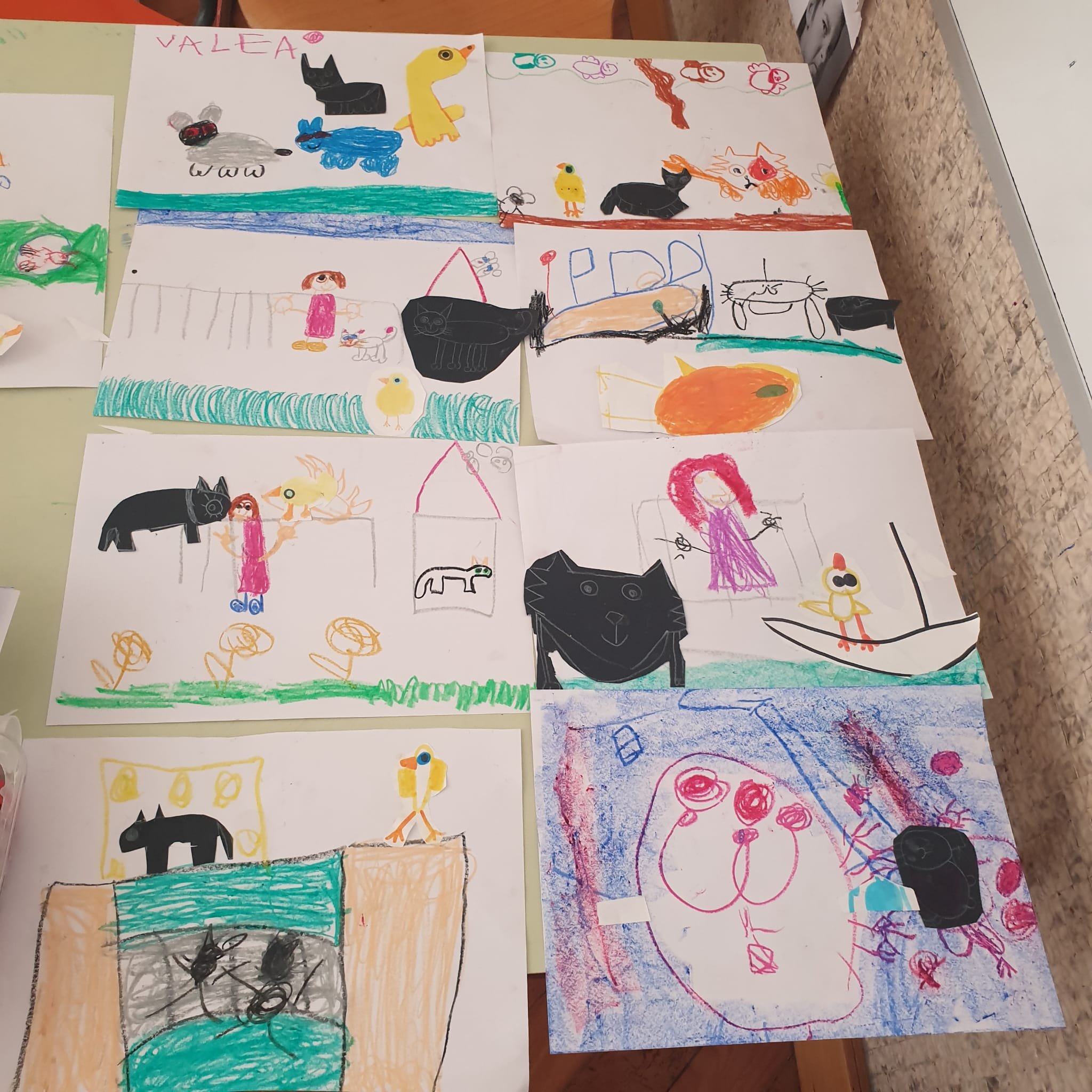 A conclusione abbiamo fatto una bella attivitá di collage utilizzando cere, pennarelli e cartoncini sulla storia della gabbianella e il gatto.
