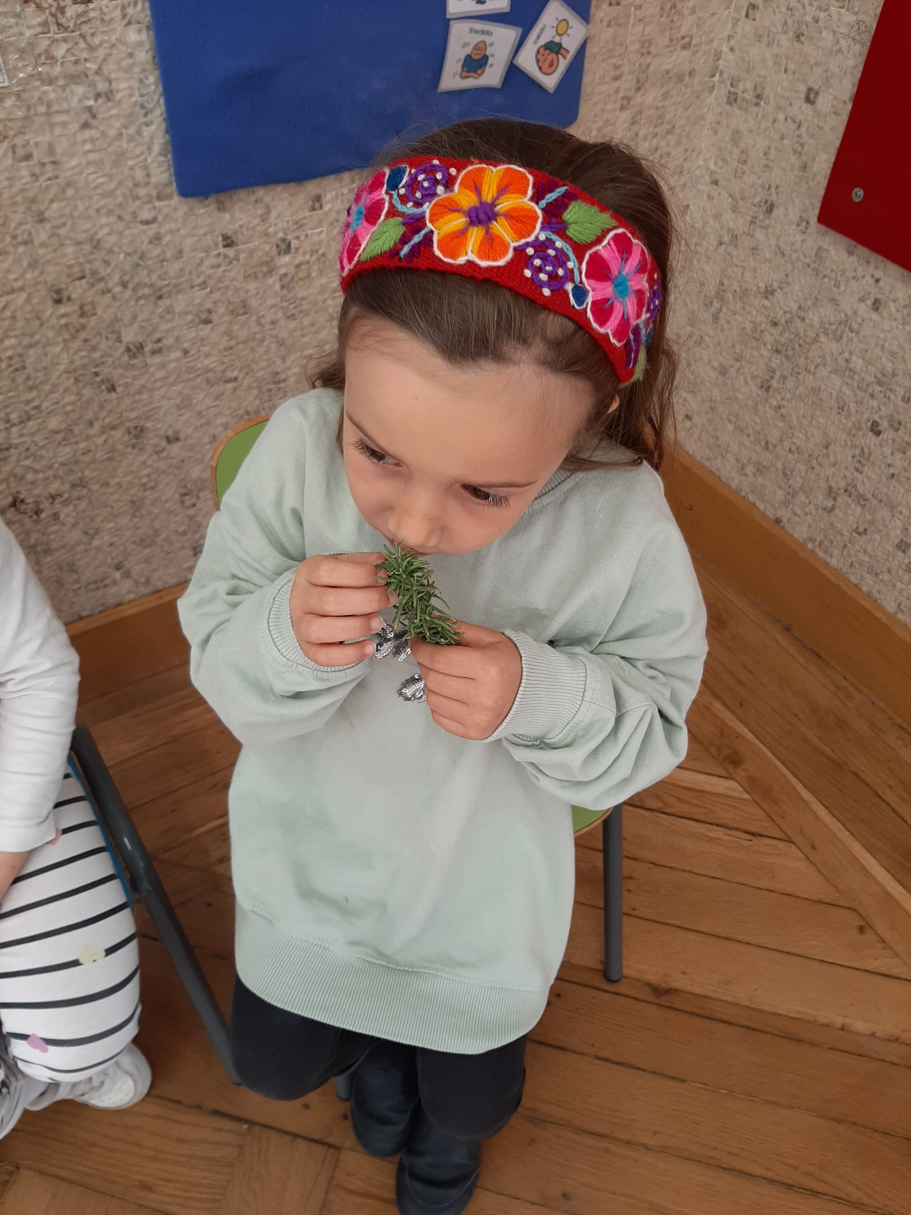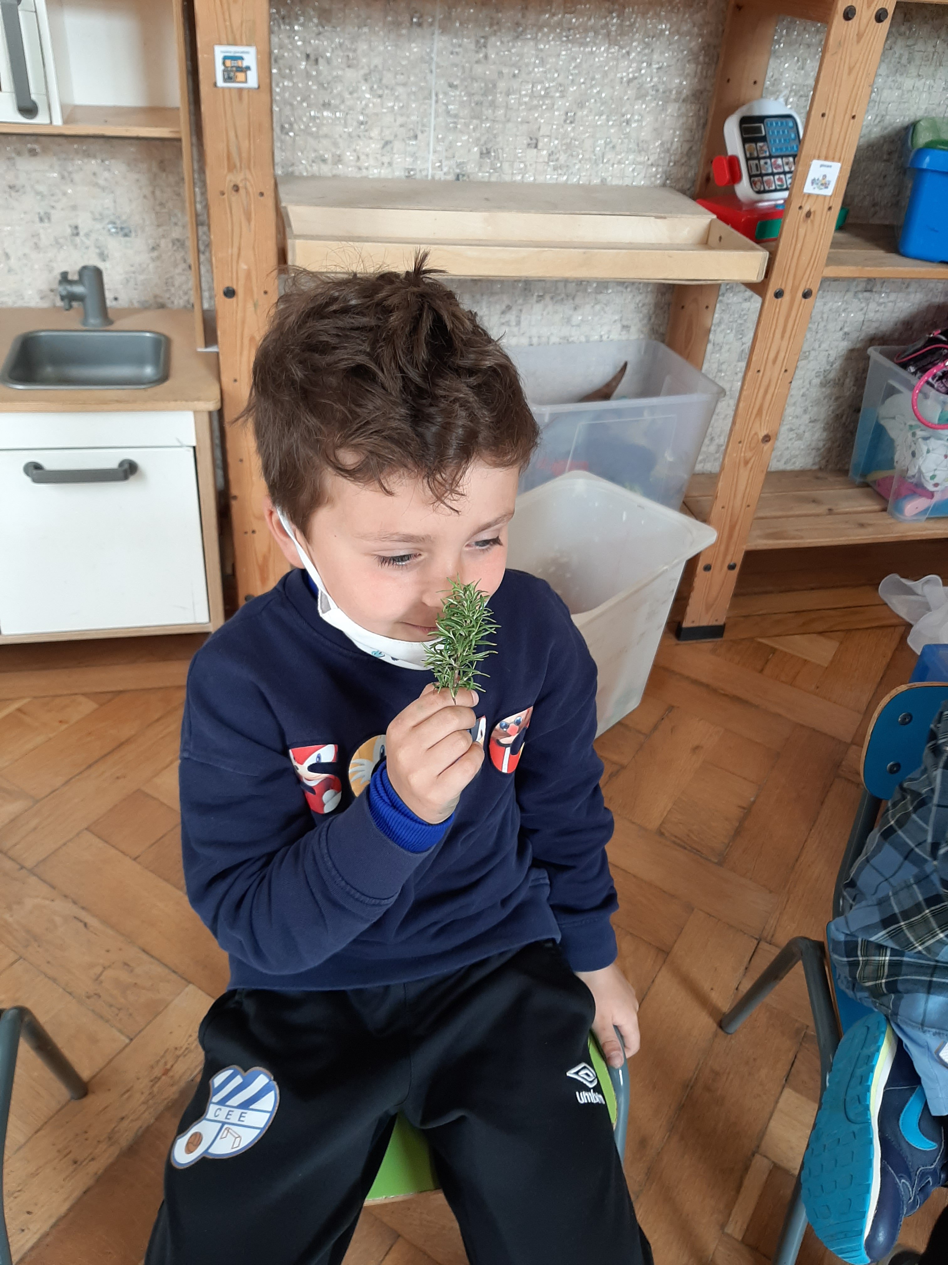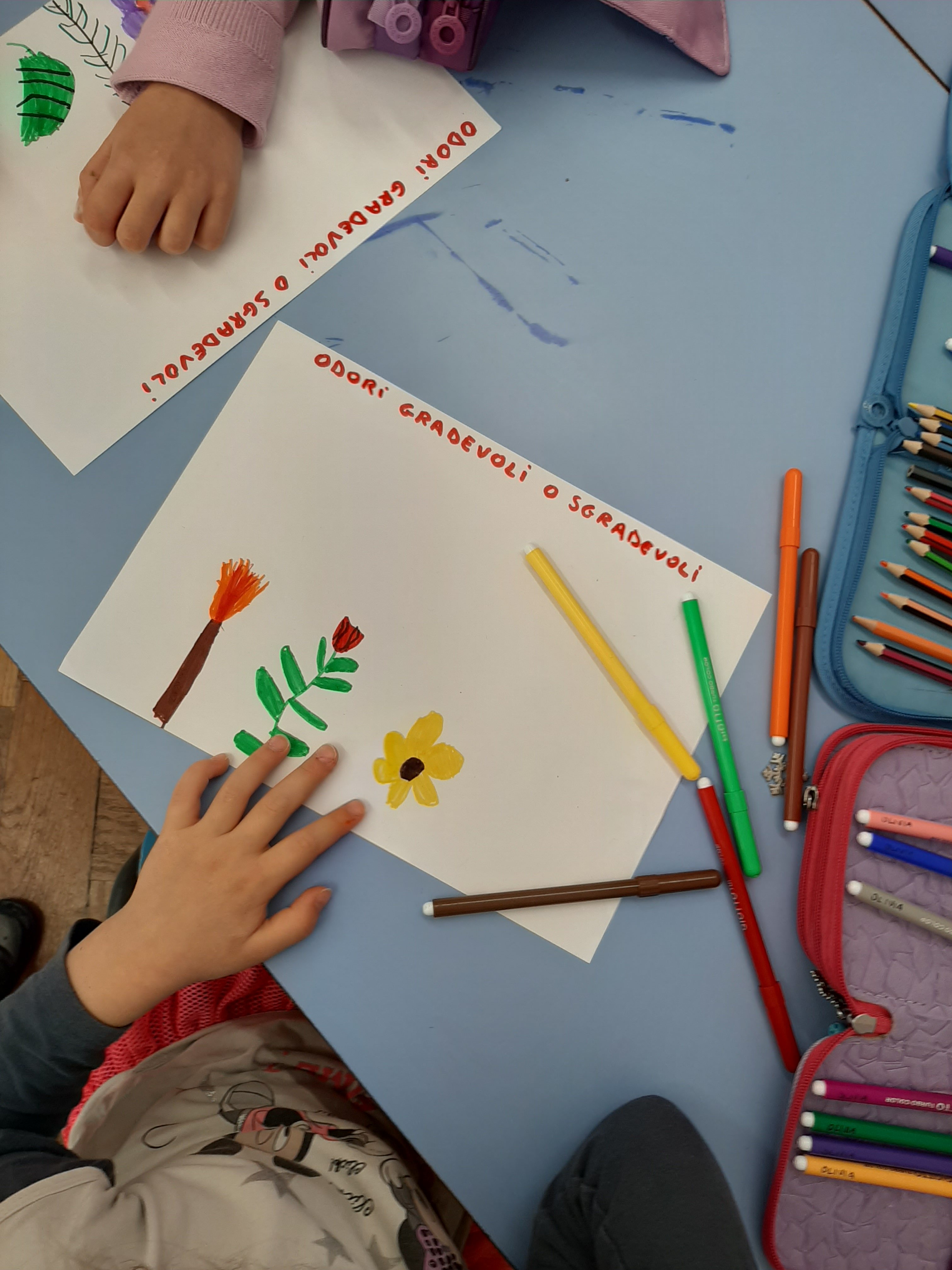 Ci soffermiamo ad osservare l’aria e la sua dolce brezza. L’aria é intorno a noi, non si vede ma si sente, é fondamentale per respirare e vivere. L’aria trasporta profumi o puzze che ci avvertono anche di pericoli (bruciato). Insieme facciamo il gioco degli odori e con gli occhi chiusi proviamo a scoprire di cosa si tratta e se sono odori gradevoli o sgradevoli. Sul foglio con i pennarelli riproduciamo gli elementi che abbiamo annusato.