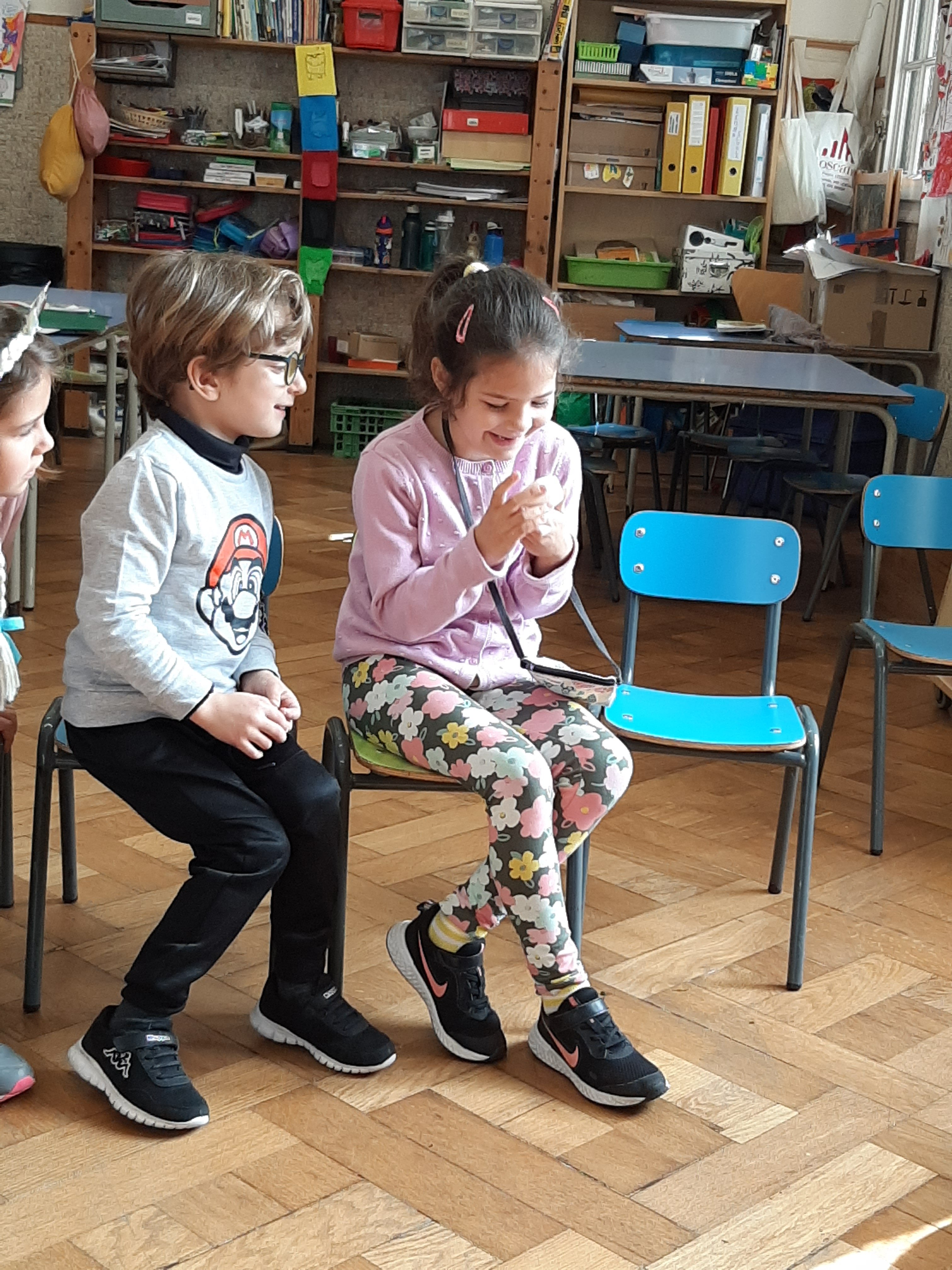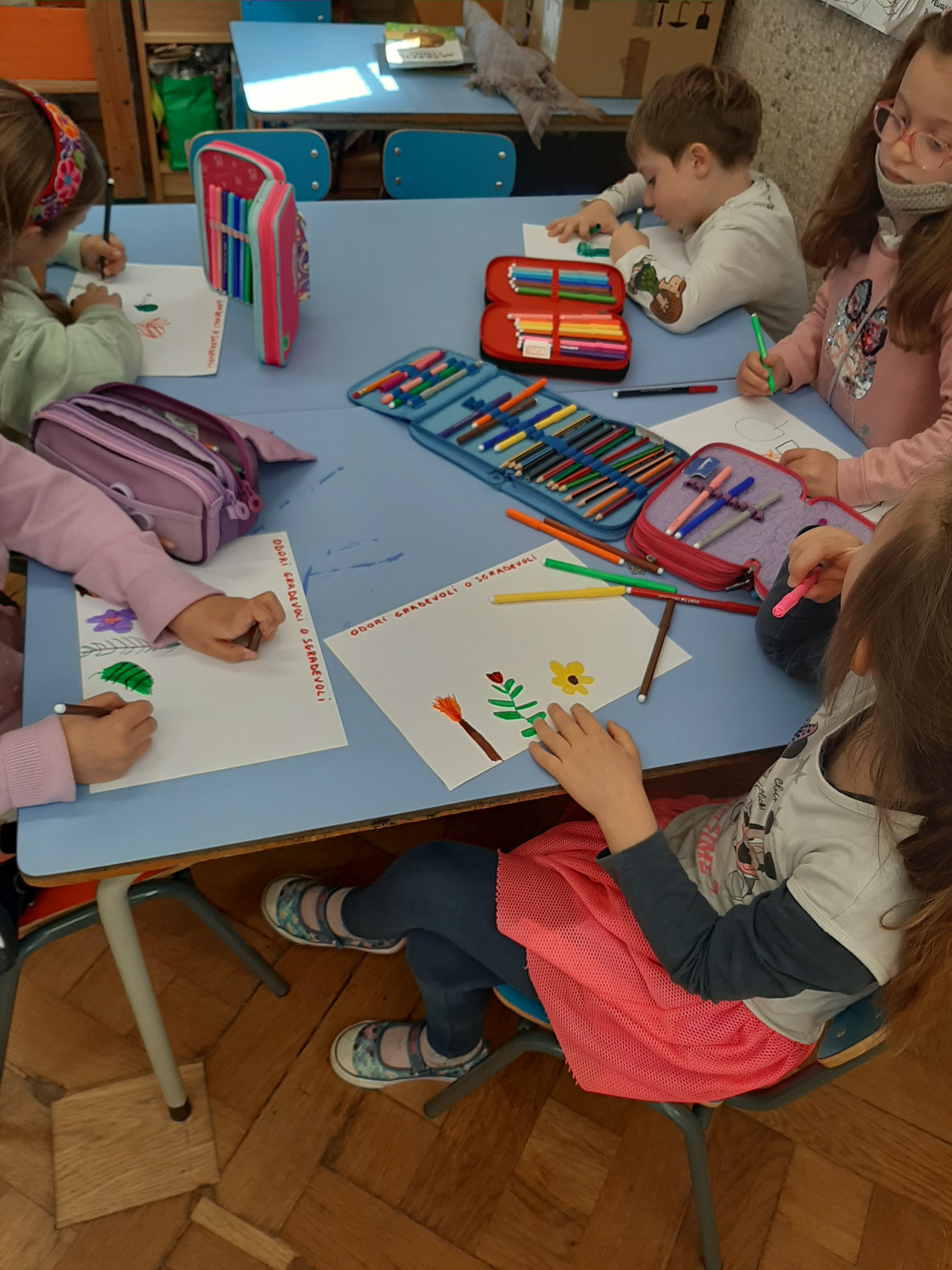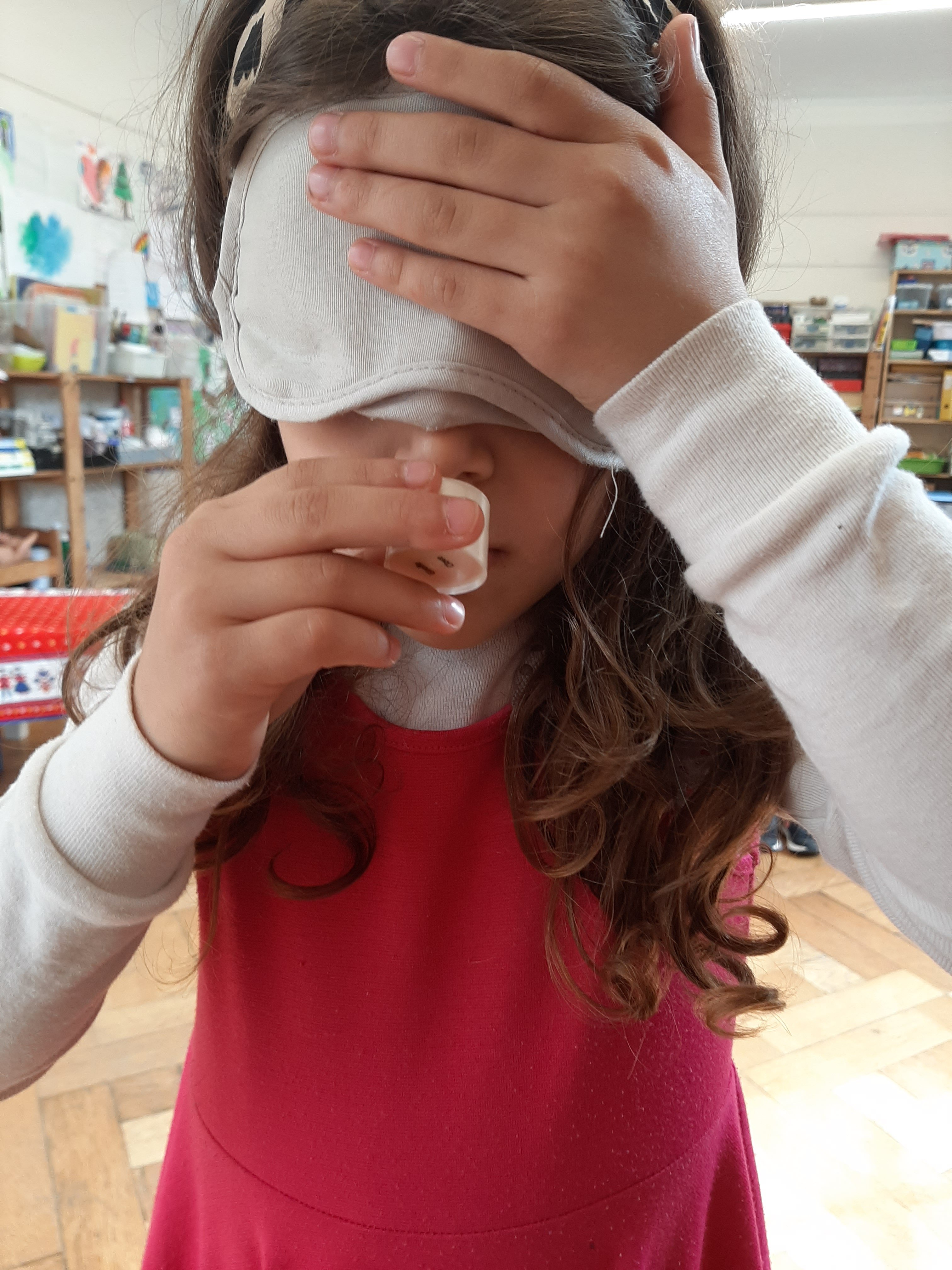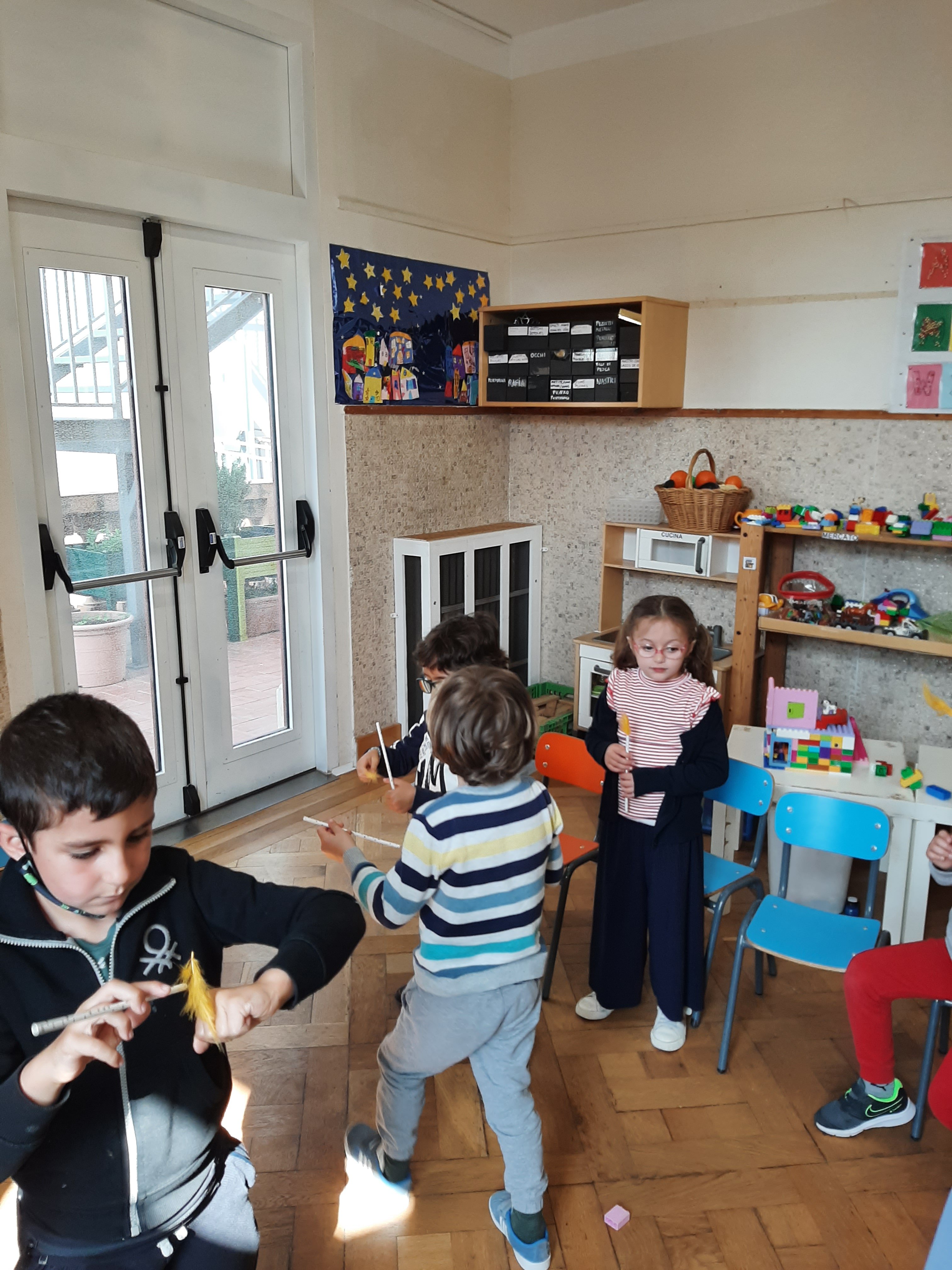 Ci soffermiamo ad osservare l’aria e la sua dolce brezza. L’aria é intorno a noi, non si vede ma si sente, é fondamentale per respirare e vivere. L’aria trasporta profumi o puzze che ci avvertono anche di pericoli (bruciato). Insieme facciamo il gioco degli odori e con gli occhi chiusi proviamo a scoprire di cosa si tratta e se sono odori gradevoli o sgradevoli. Sul foglio con i pennarelli riproduciamo gli elementi che abbiamo annusato.