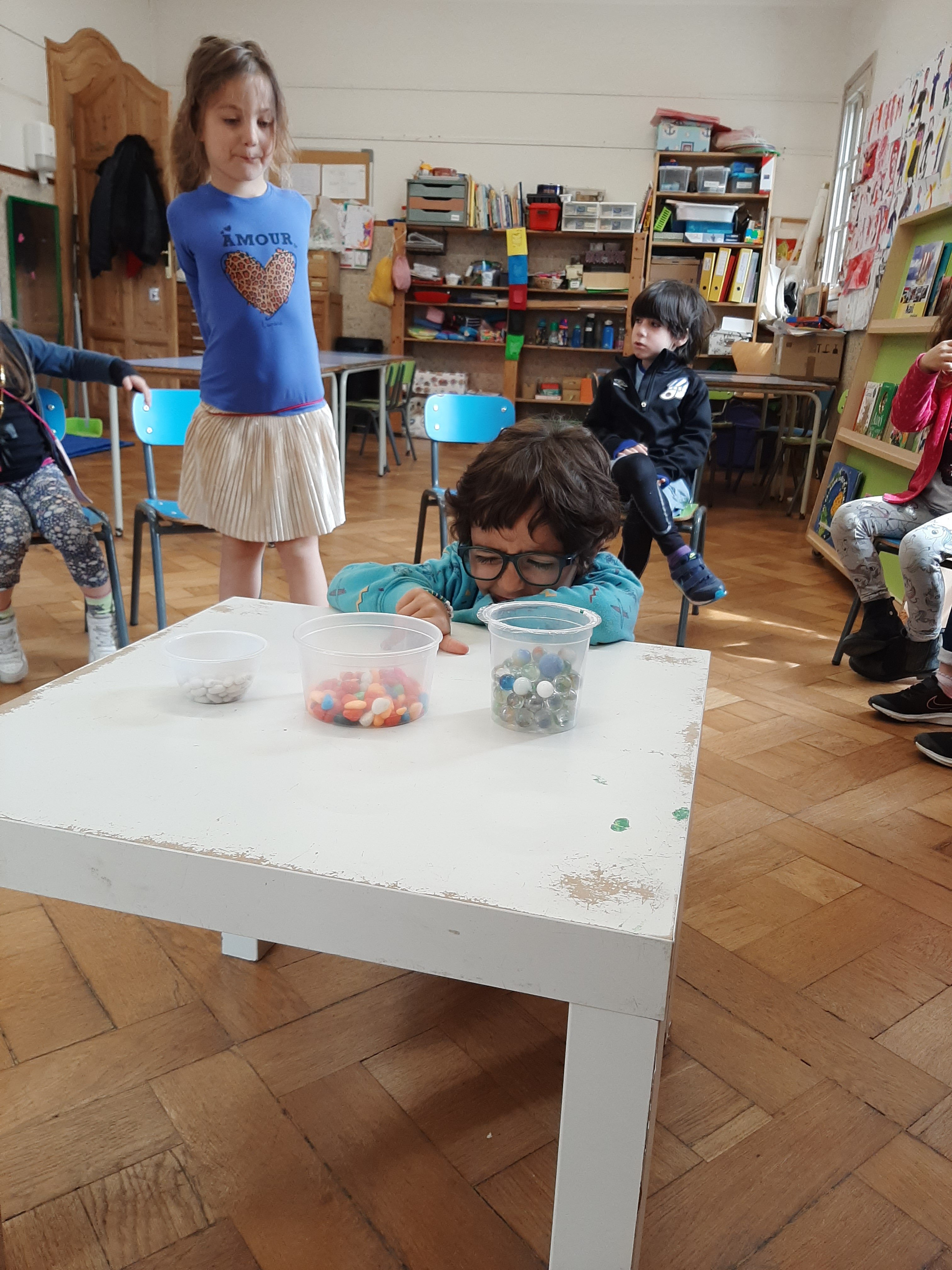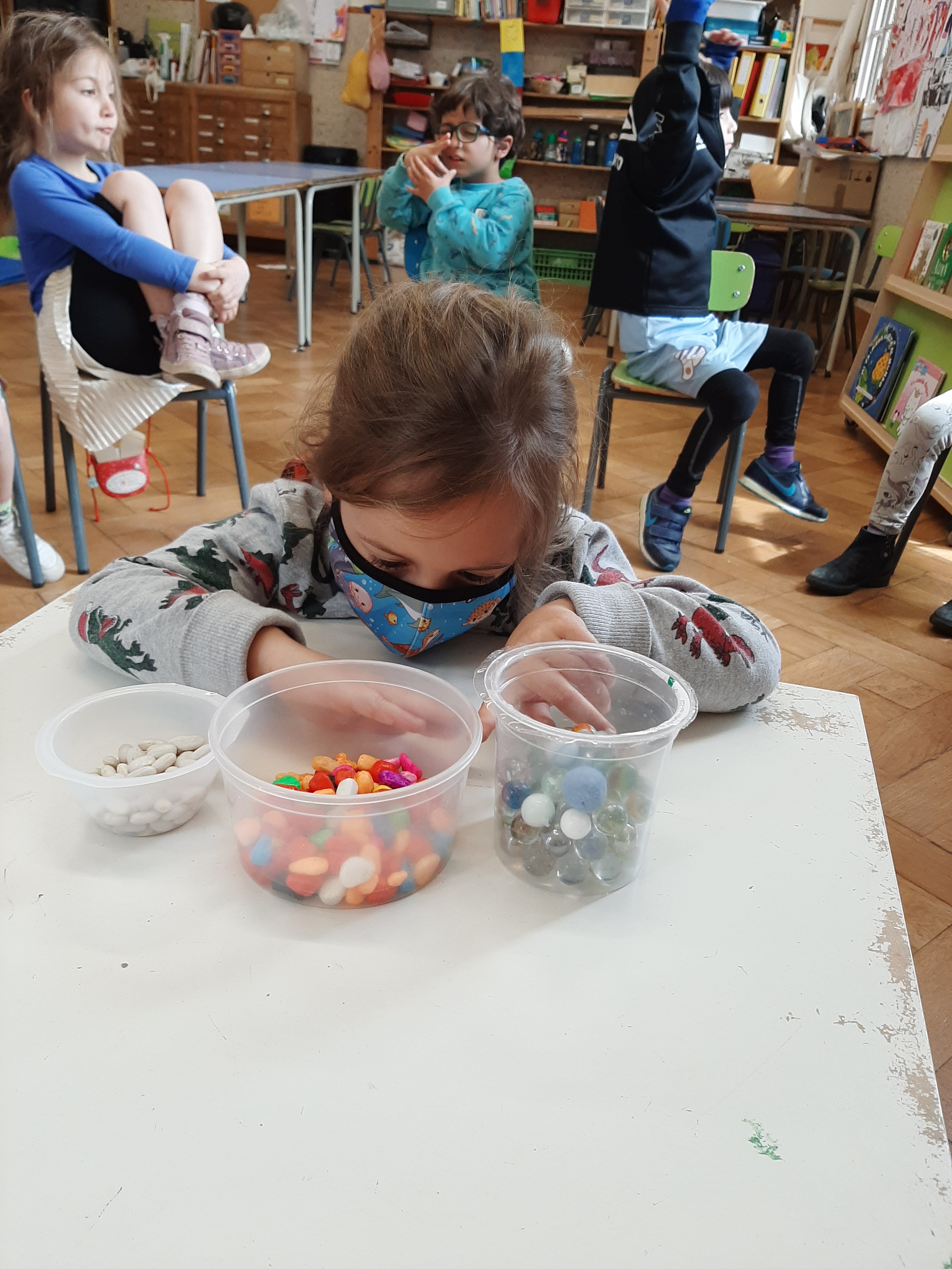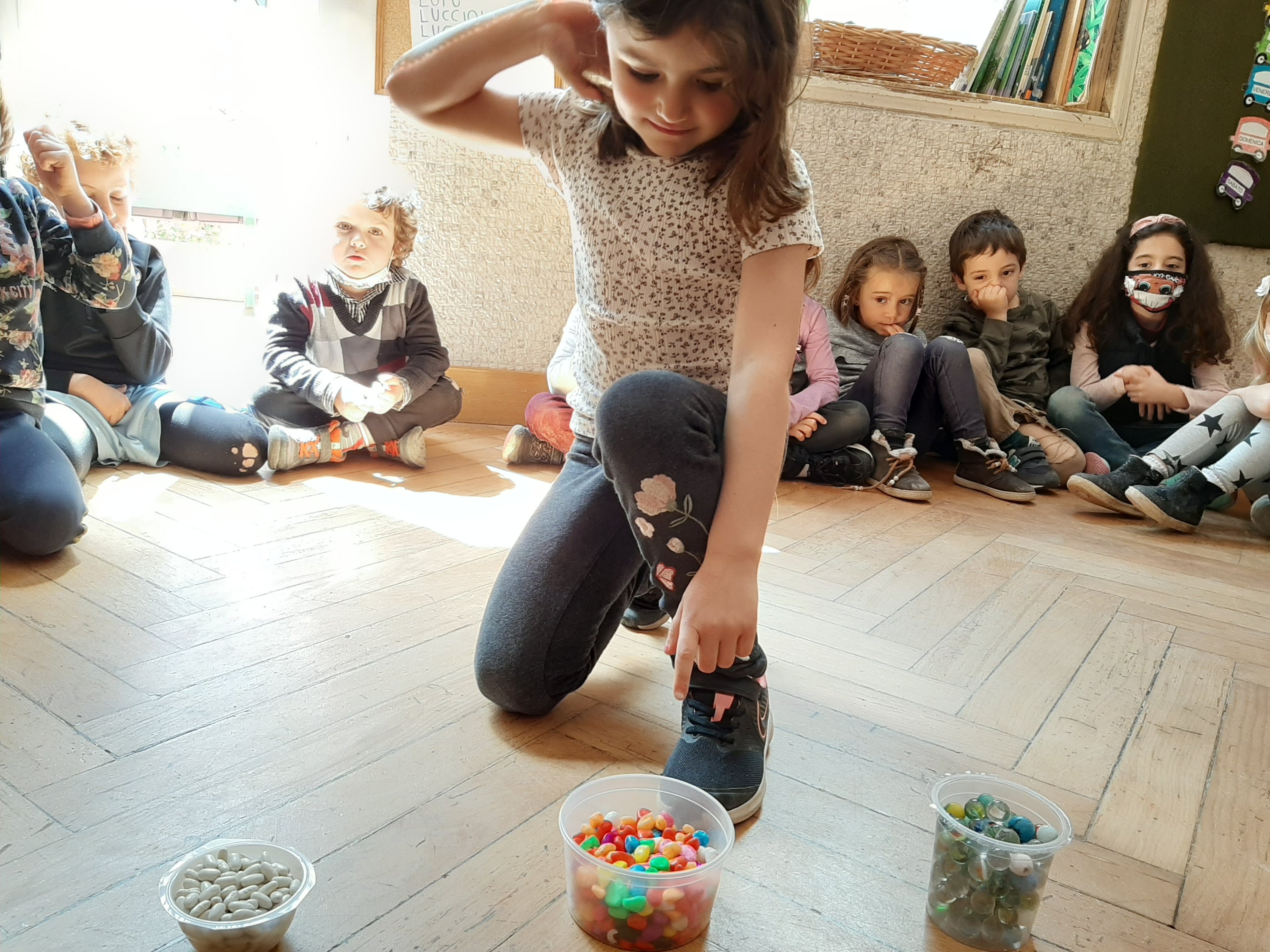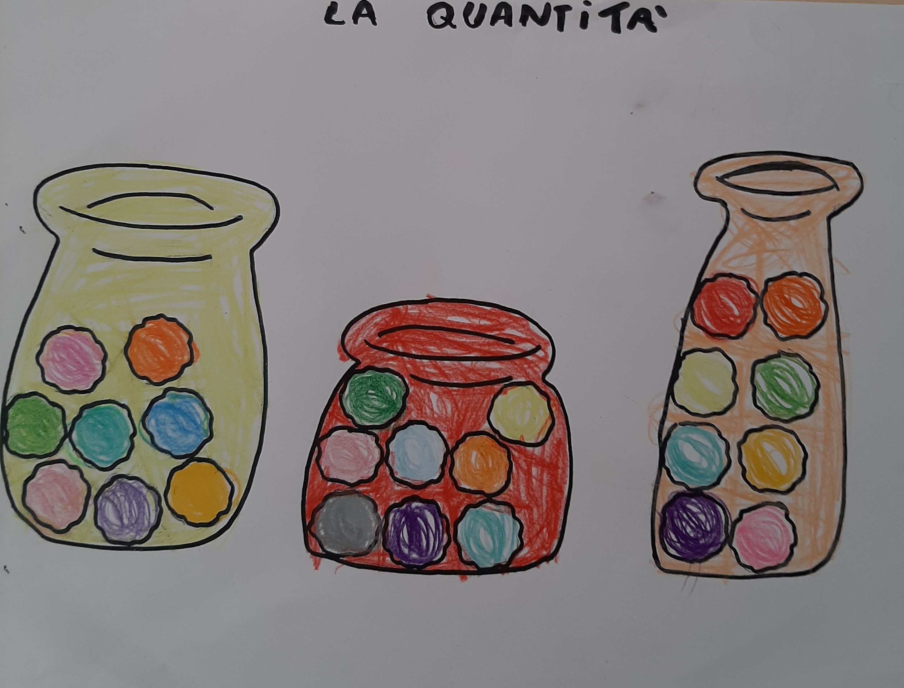 Utilizzando differenti materiali come biglie, sassolini, acqua o sabbia abbiamo fatto degli esperimenti con contenitori di diverse forme e dimensioni. Cosí abbiamo scoperto che, per esempio, la stessa quantitá di biglie, di acqua o di sabbia sembra di piú o di meno a seconda della grandezza o altezza del barattolino che la contiene. Che buffo effetto ottico! Quindi abbiamo capito l’importanza delle misure di capacitá!