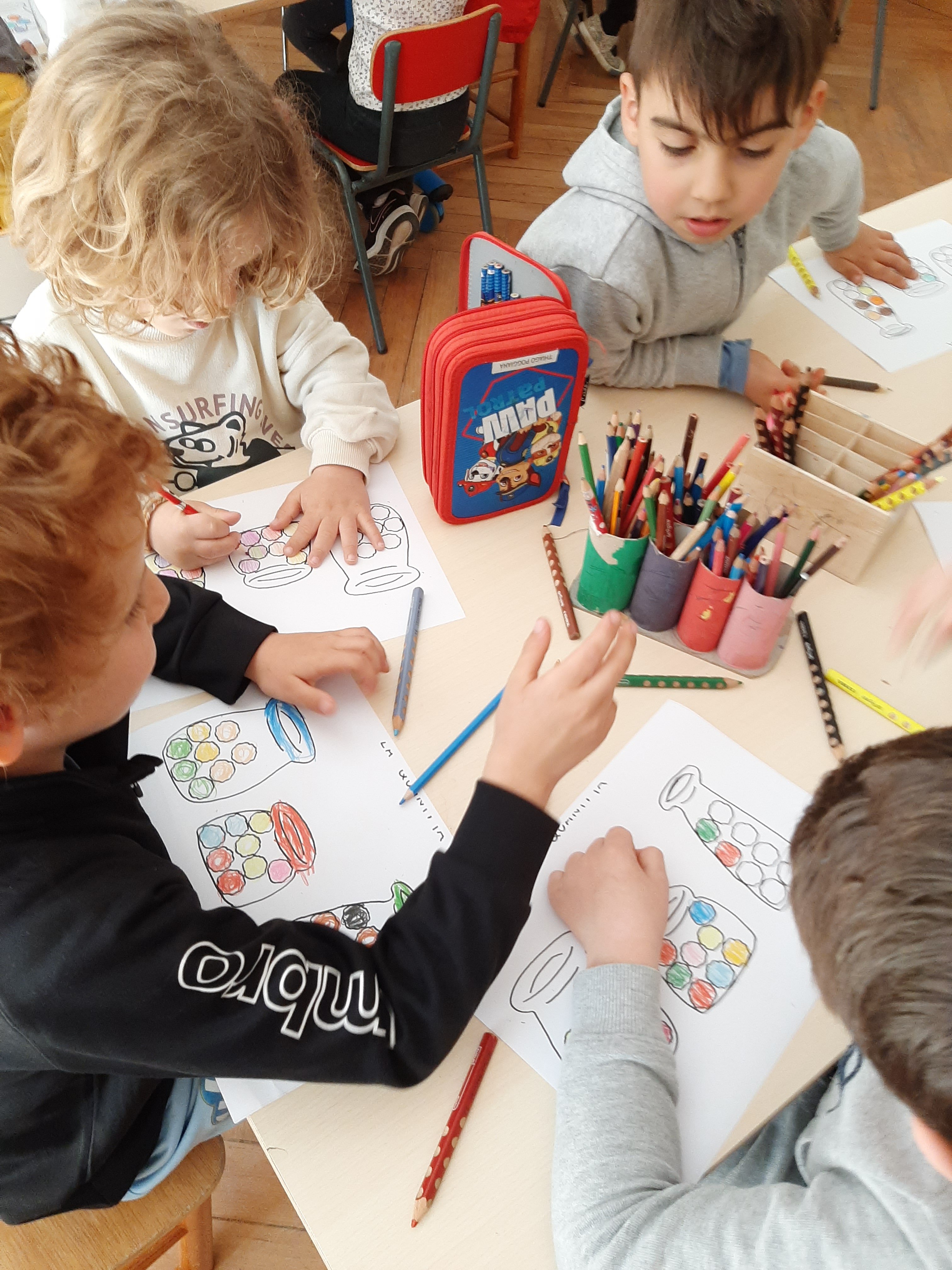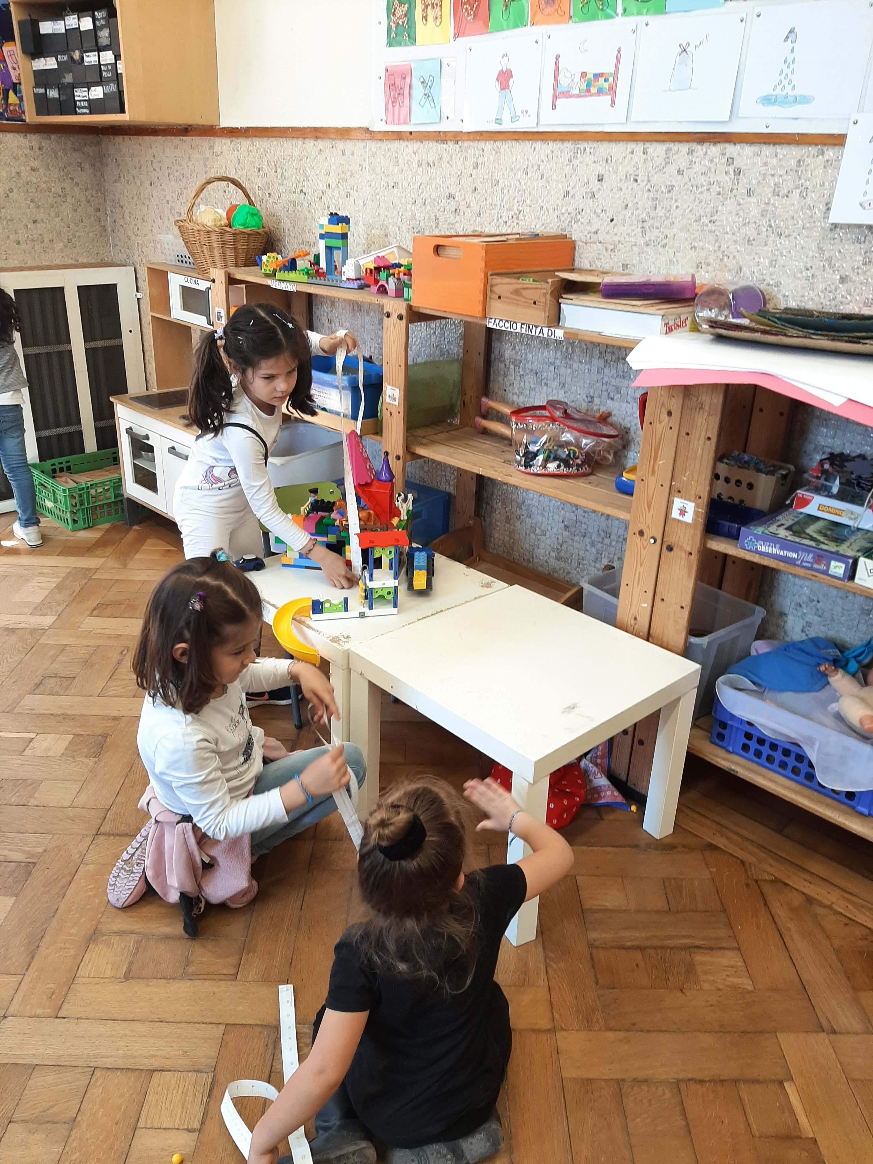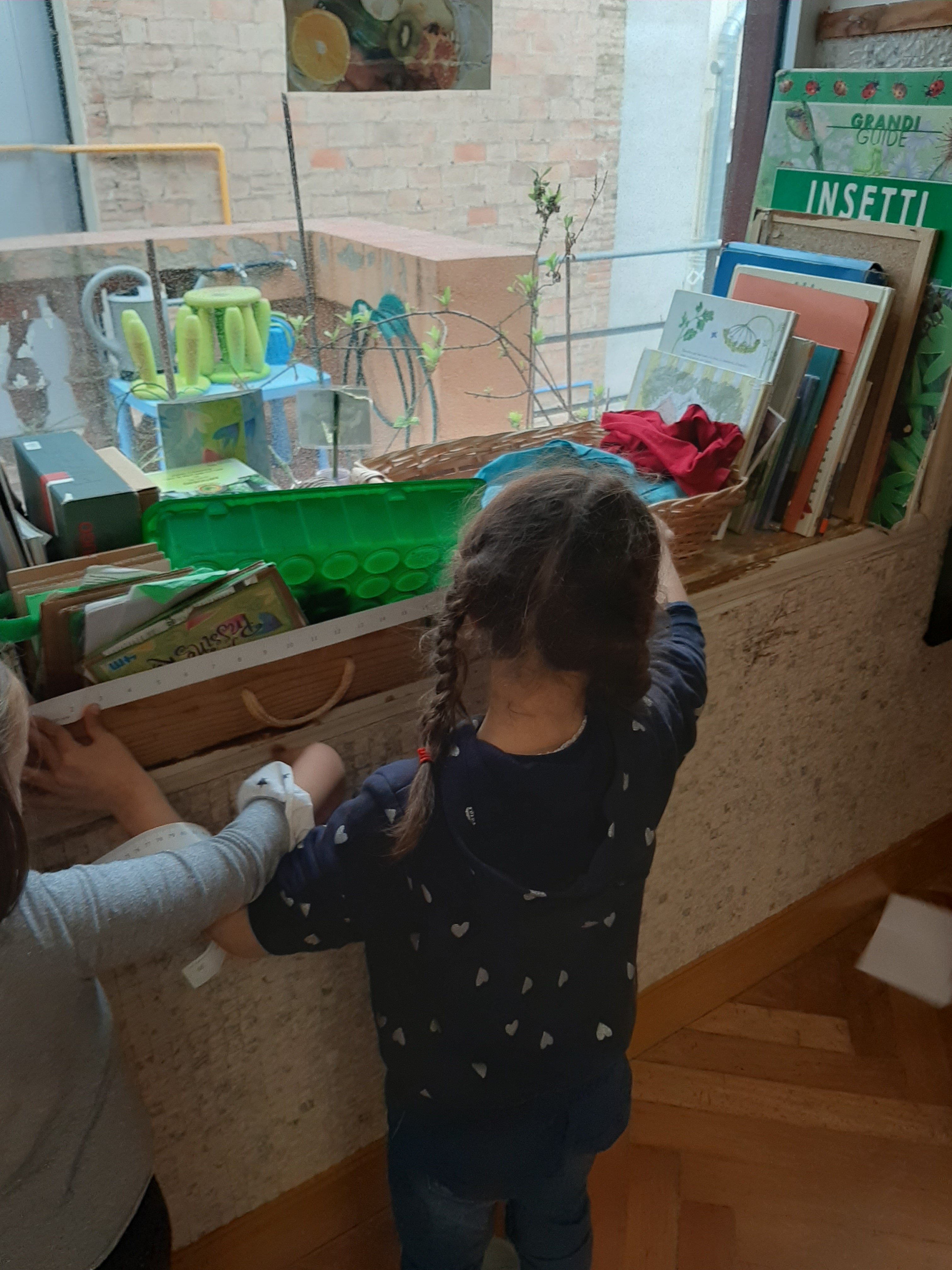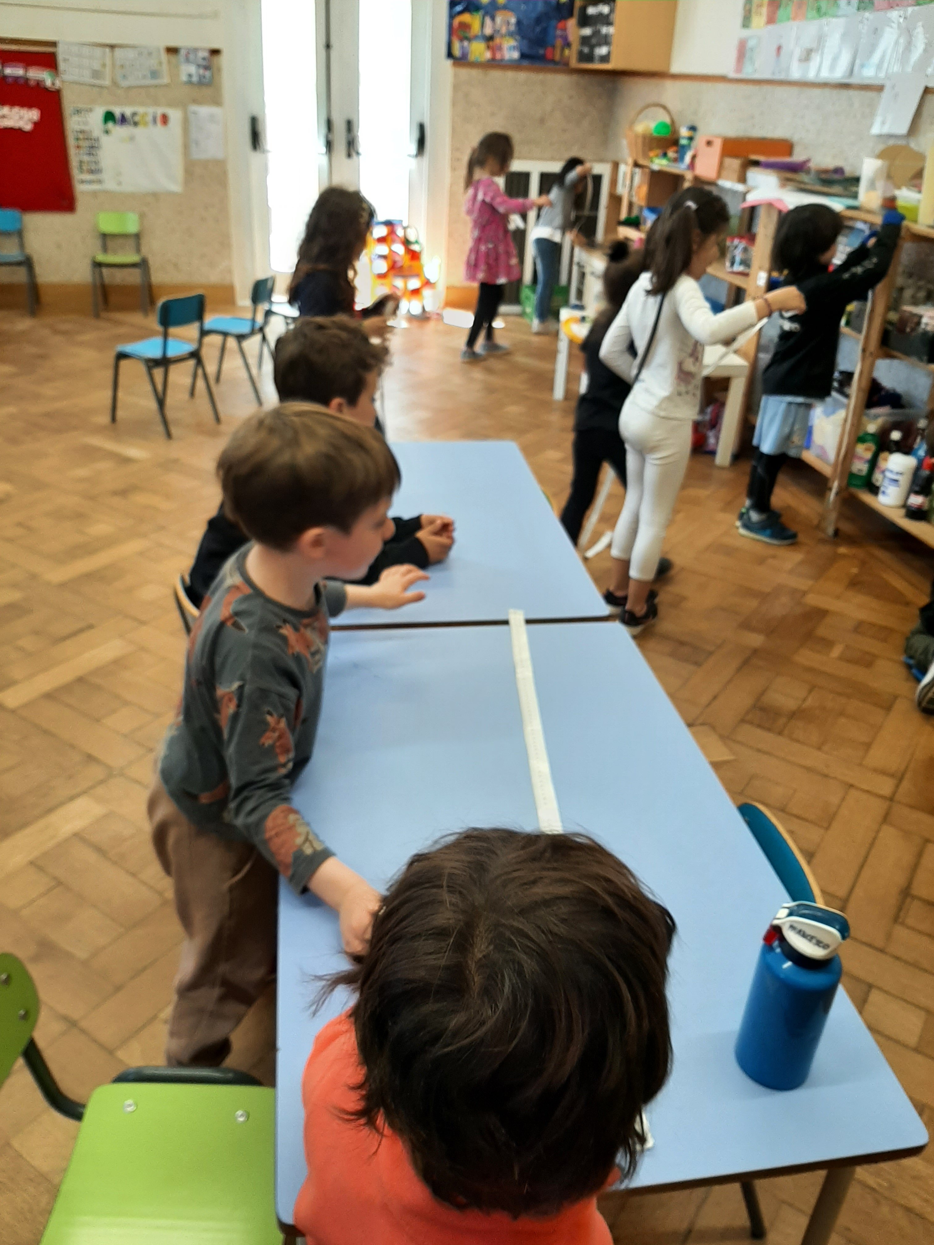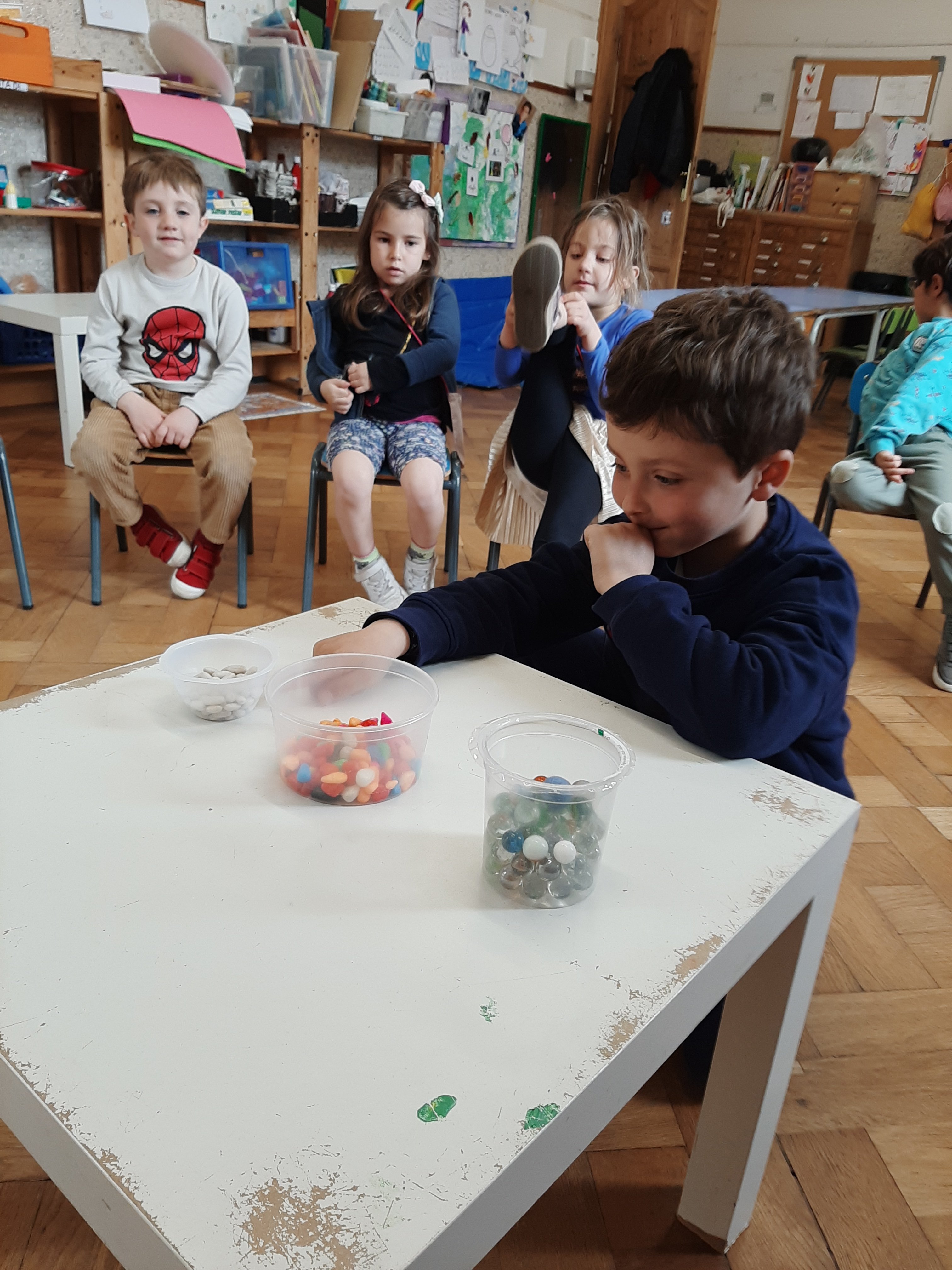 Utilizzando differenti materiali come biglie, sassolini, acqua o sabbia abbiamo fatto degli esperimenti con contenitori di diverse forme e dimensioni. Cosí abbiamo scoperto che, per esempio, la stessa quantitá di biglie, di acqua o di sabbia sembra di piú o di meno a seconda della grandezza o altezza del barattolino che la contiene. Che buffo effetto ottico! Quindi abbiamo capito l’importanza delle misure di capacitá!