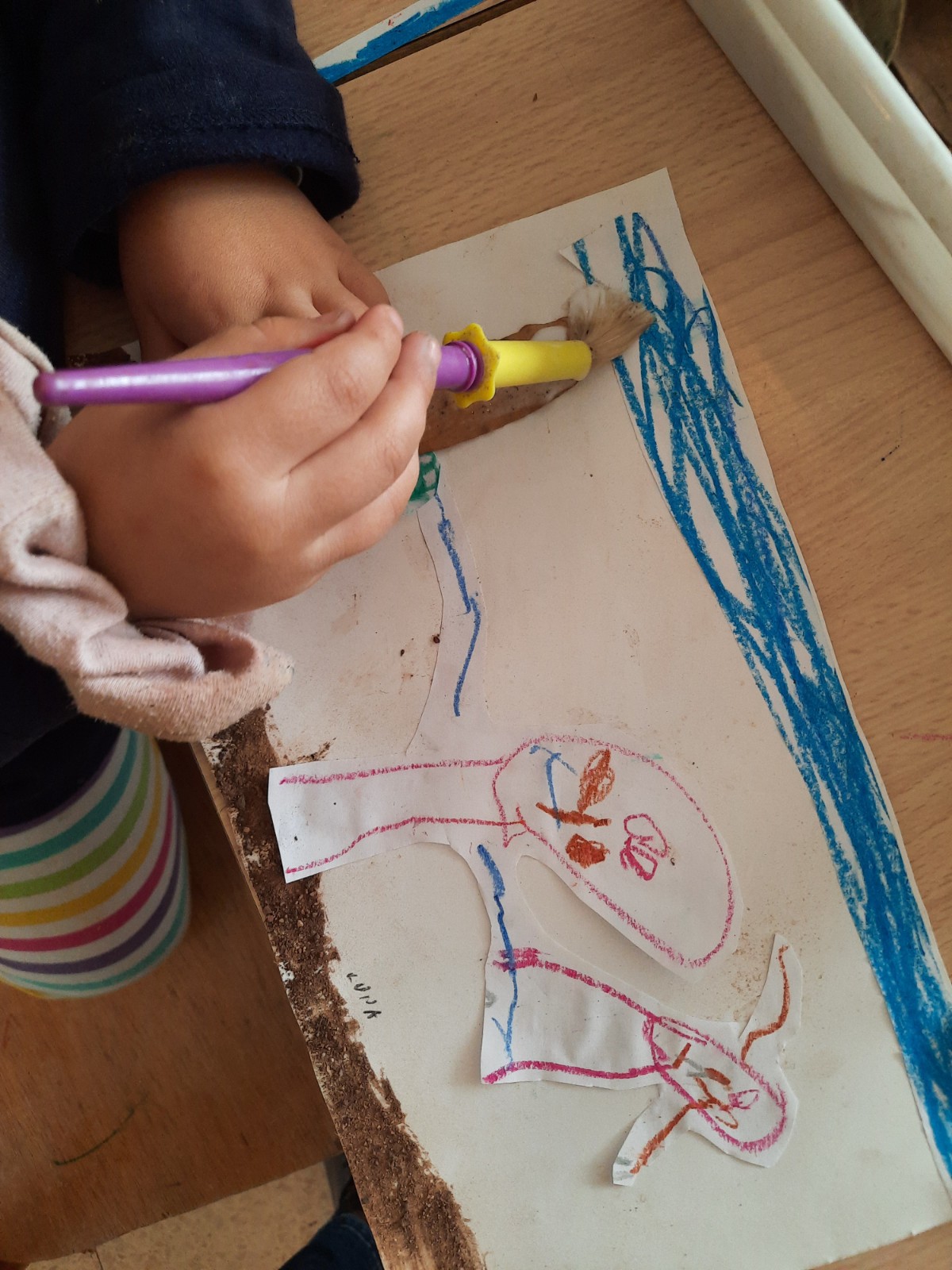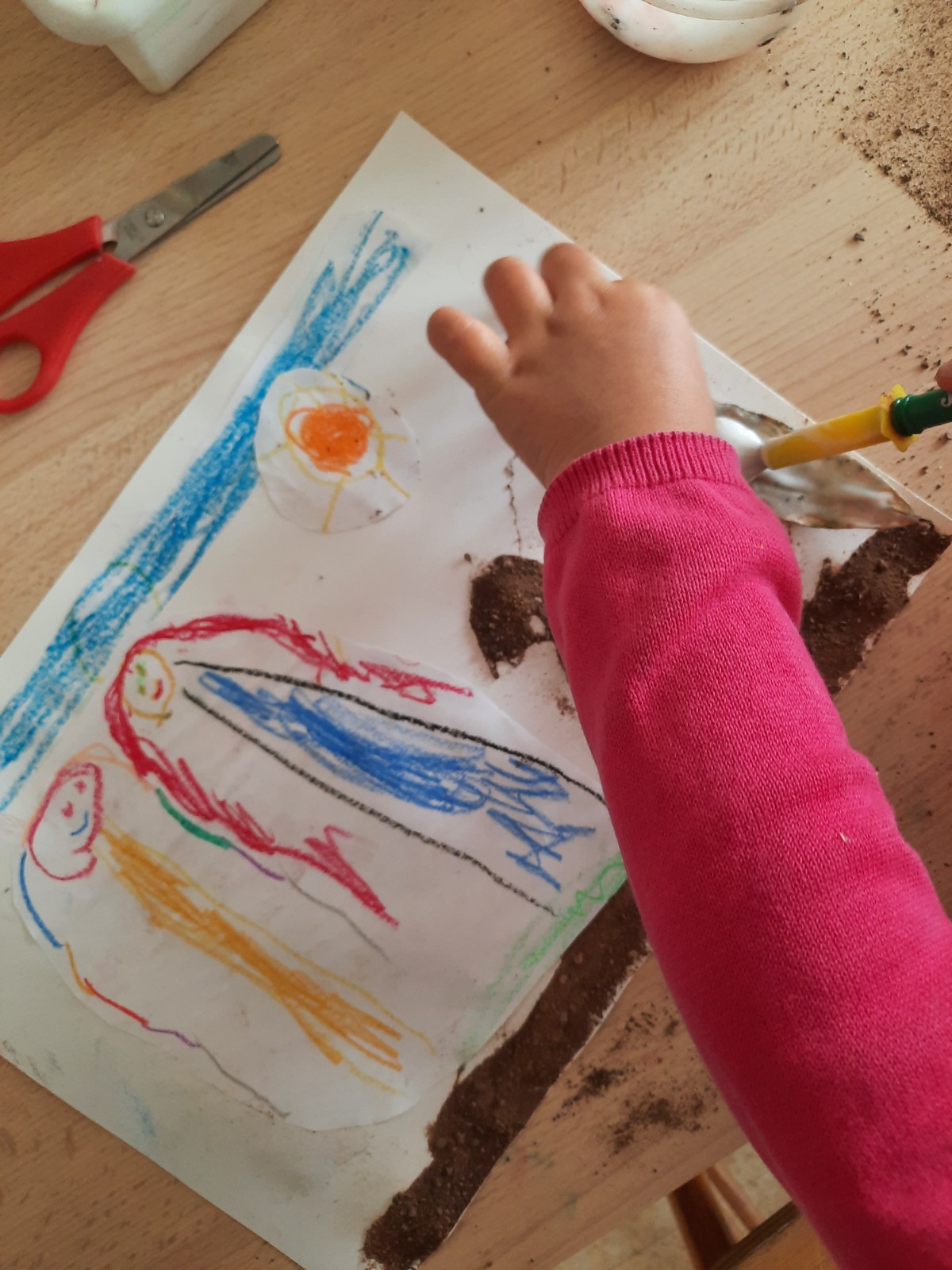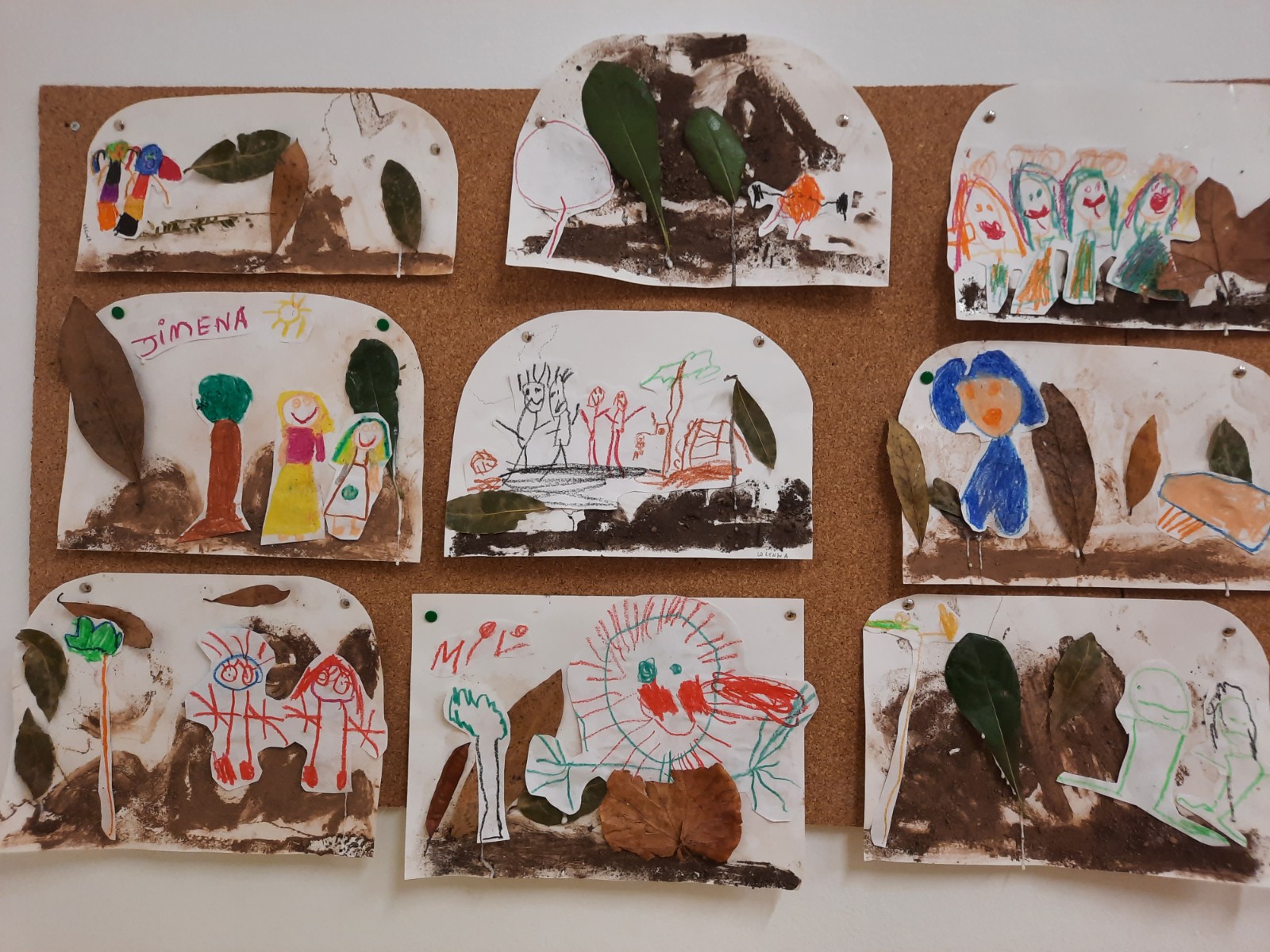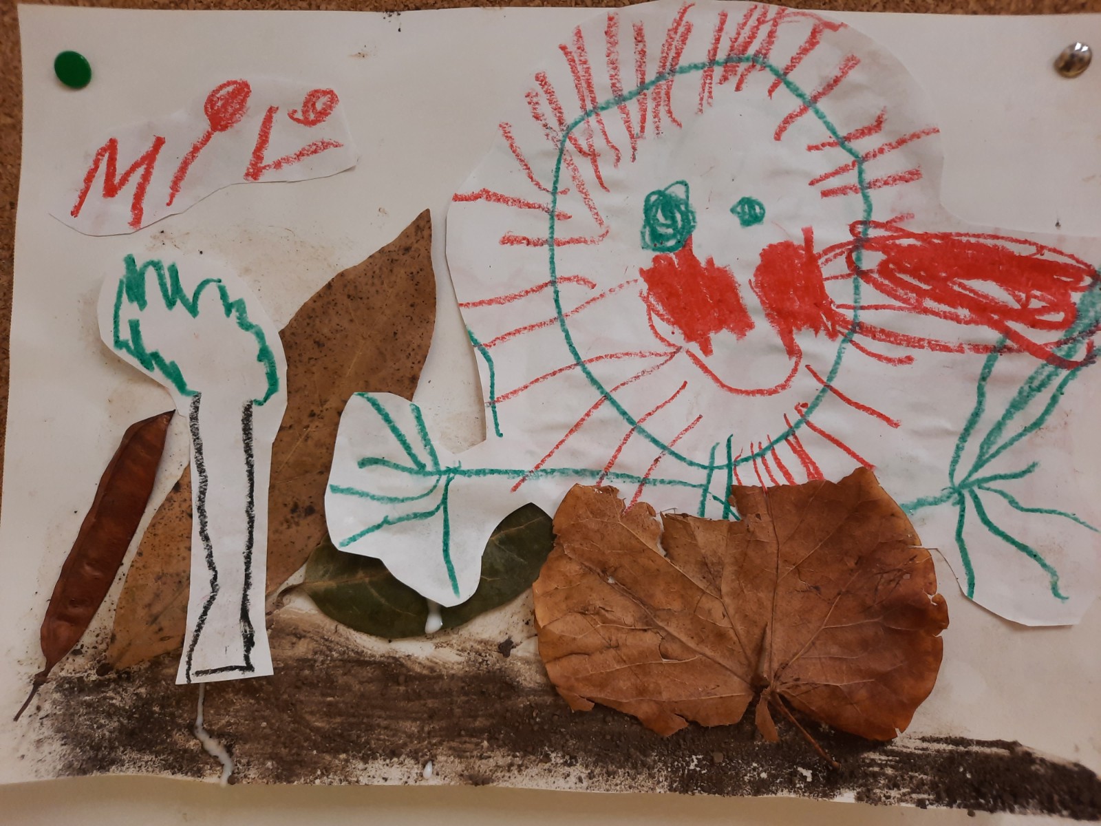 Dopo la manipolazione facciamo un collage usando la terra e le foglie per rappresentare le nostre esplorazioni al parco.