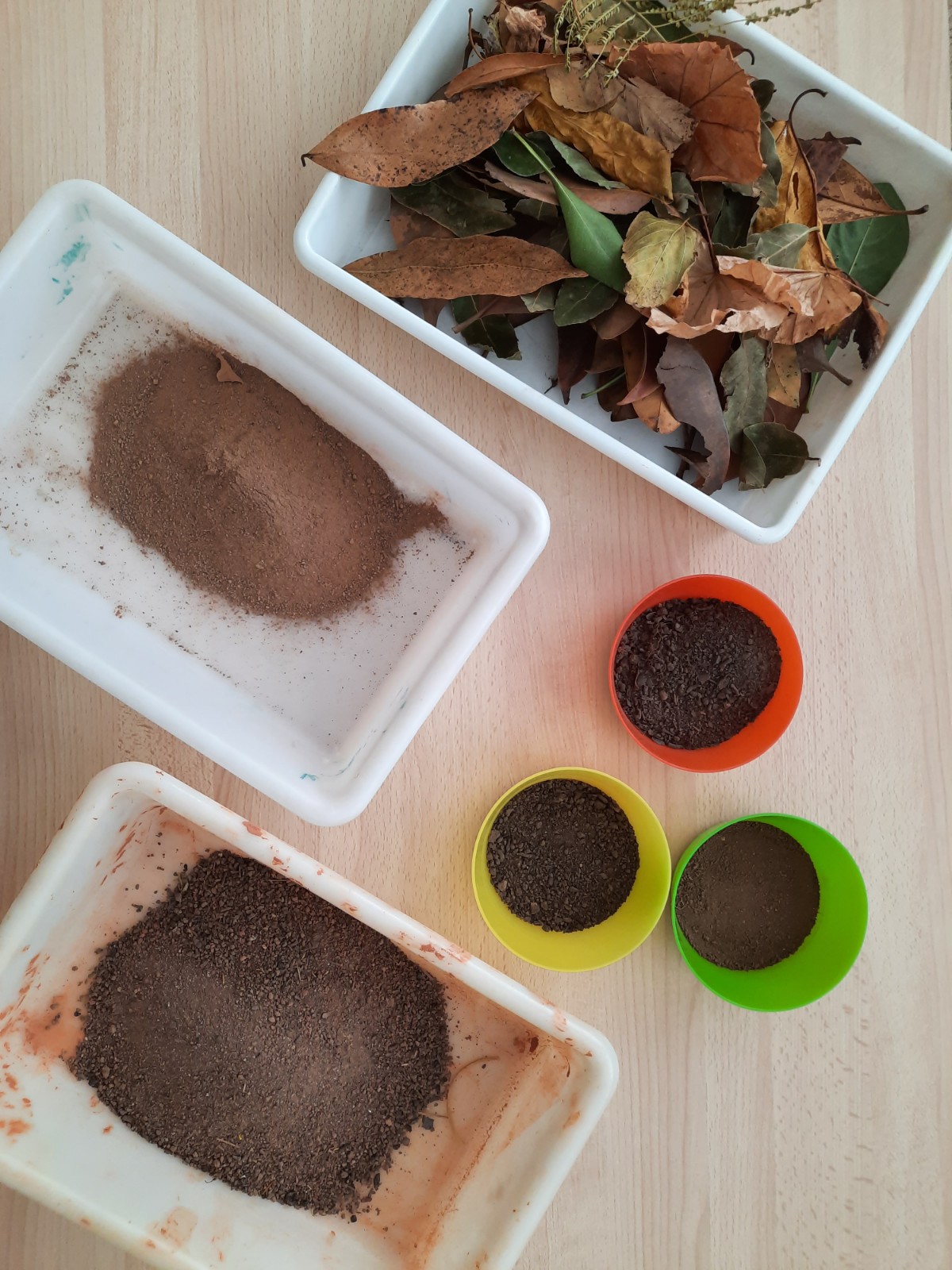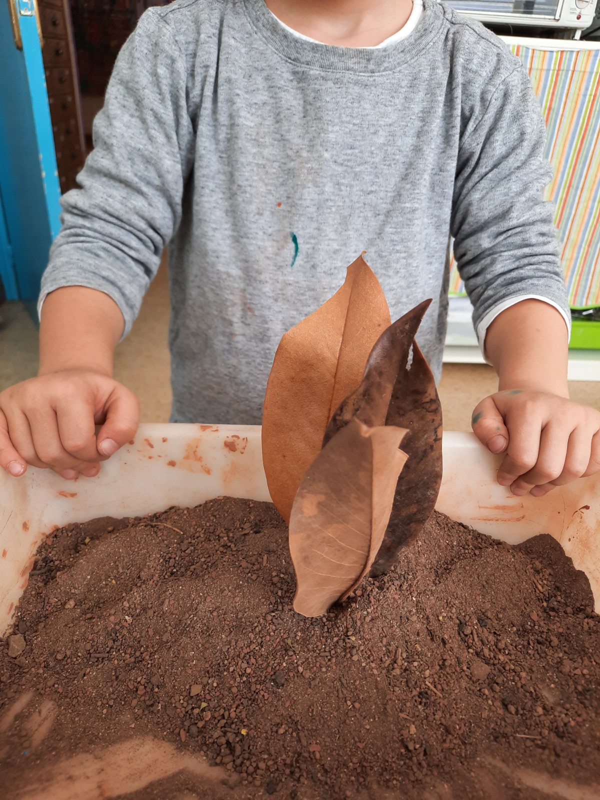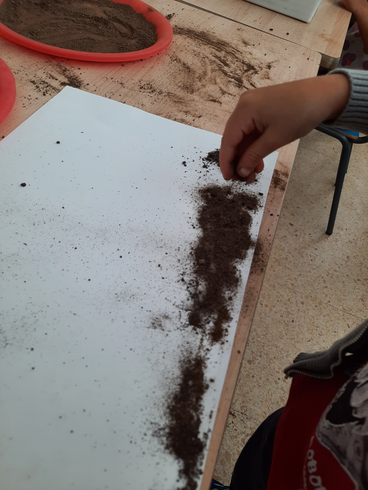 Questa è grigia… questa marrone… No, sono marrone chiaro e marrone scuro! Odora di terra… Odorano anche le foglie e fanno rumore. La terra serve per piantare fiori… e per fare un castello… no, quello si fa con la sabbia! Le formiche vivono nella terra… anche le chiocciole… e i ricci. Ho visto un fungo velenoso che cresceva sulla terra. Alcune terre sono più soavi… Non mi piace toccare la terra perché mi sporca… A me piace perché si sporcano le mani. A me invece piacciono le foglie! Nella terra si può disegnare!
