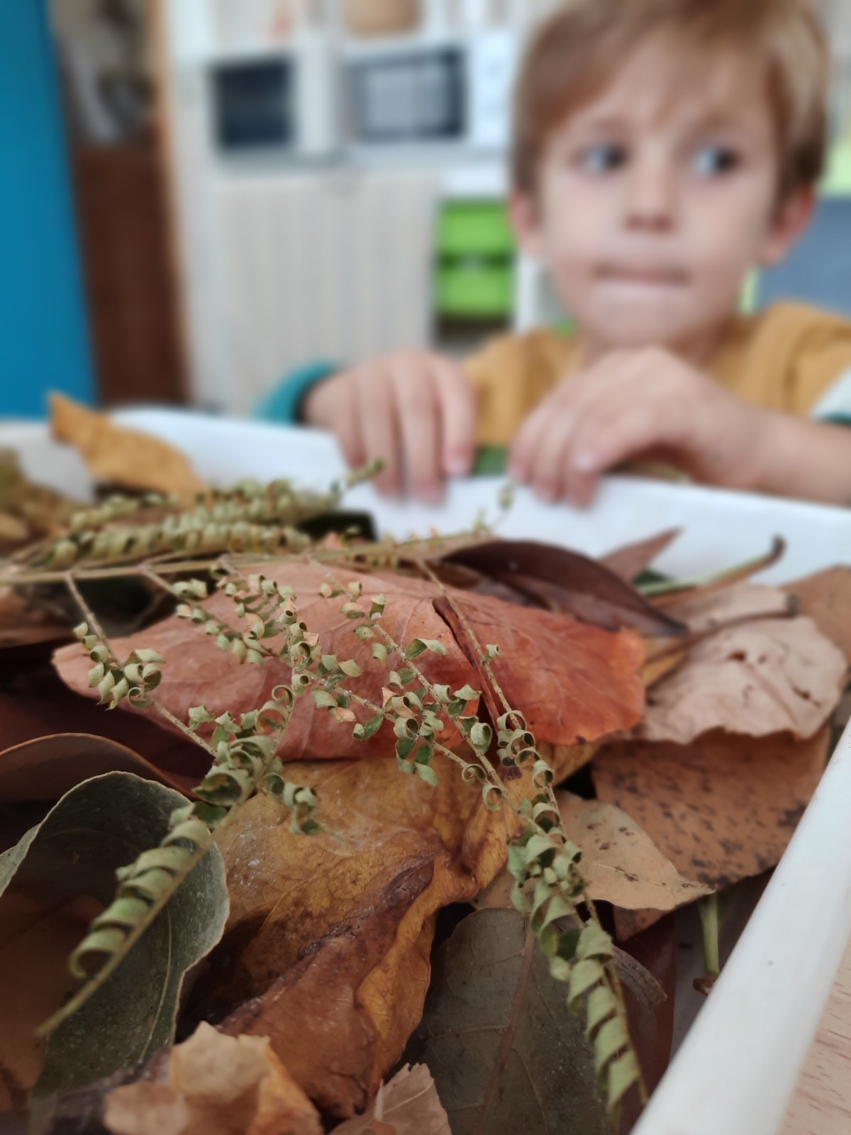 Lentamente e con calma i bambini e le bambine di 4 anni esplorano con gli occhi, le mani, il naso la terra e le foglie raccolte al parco.
