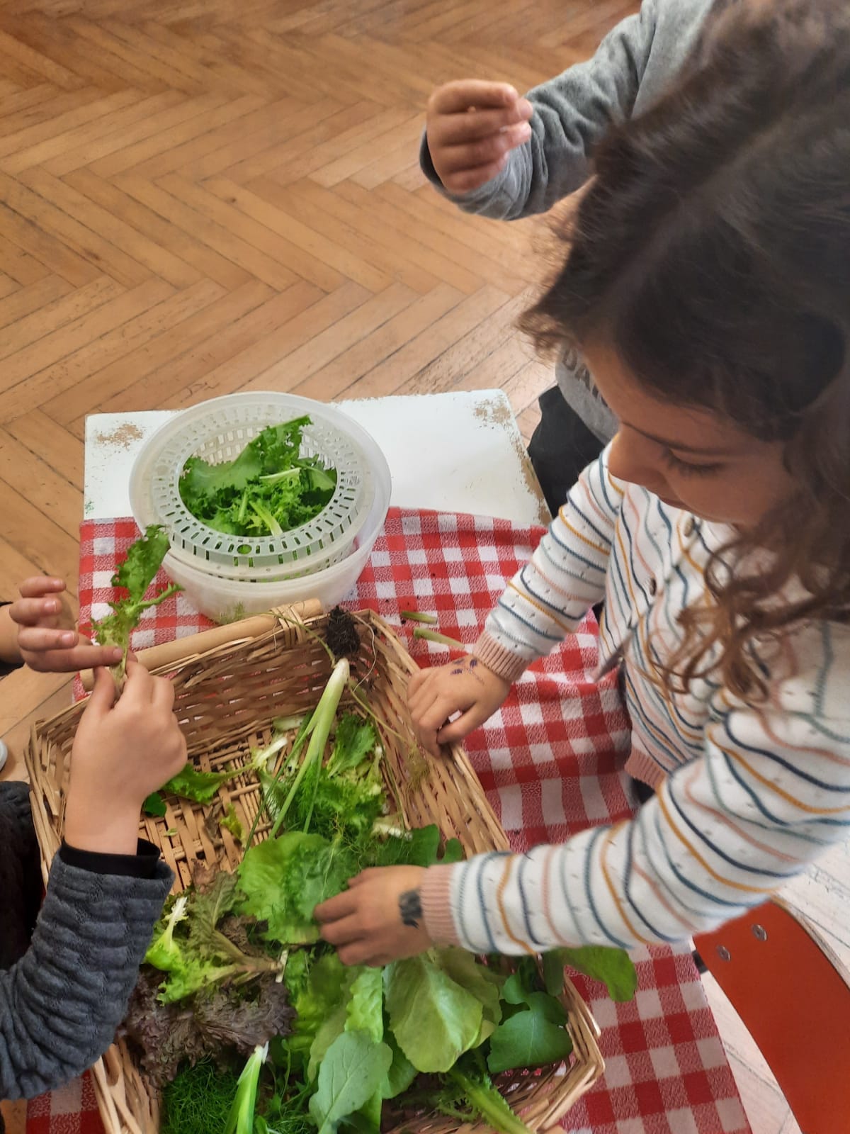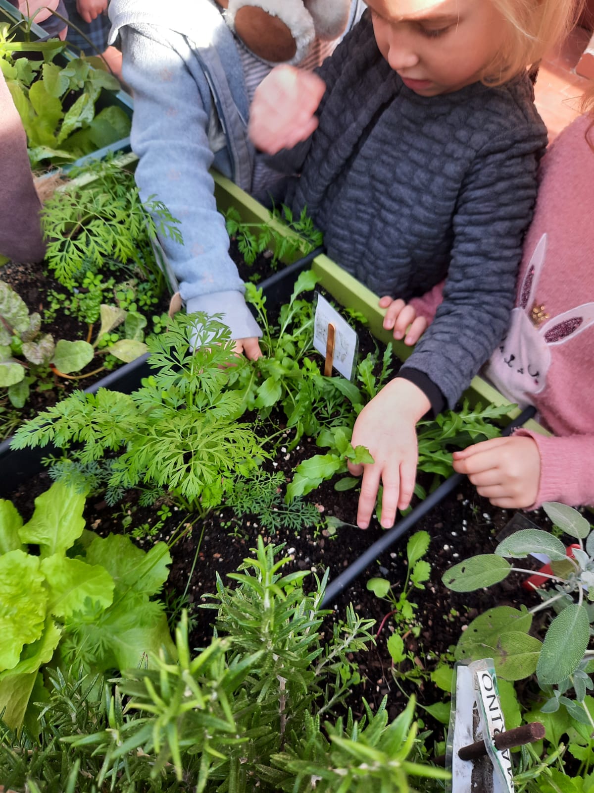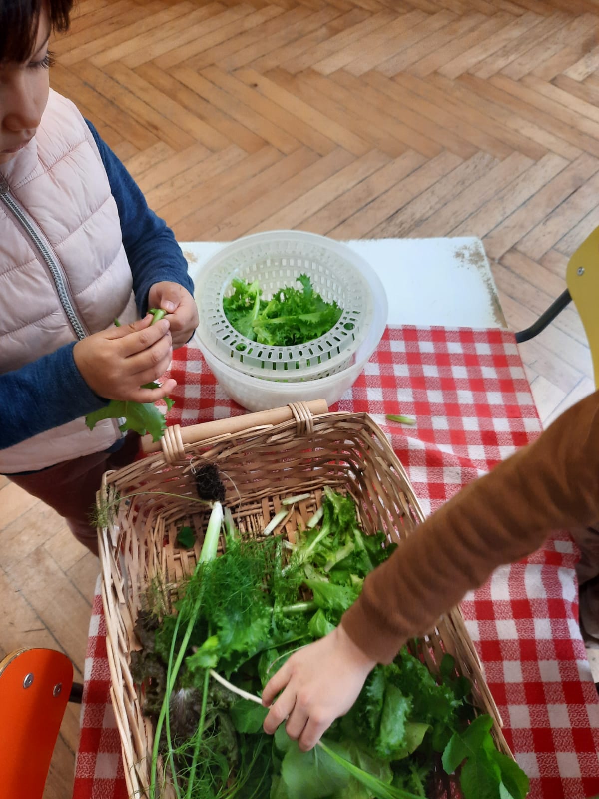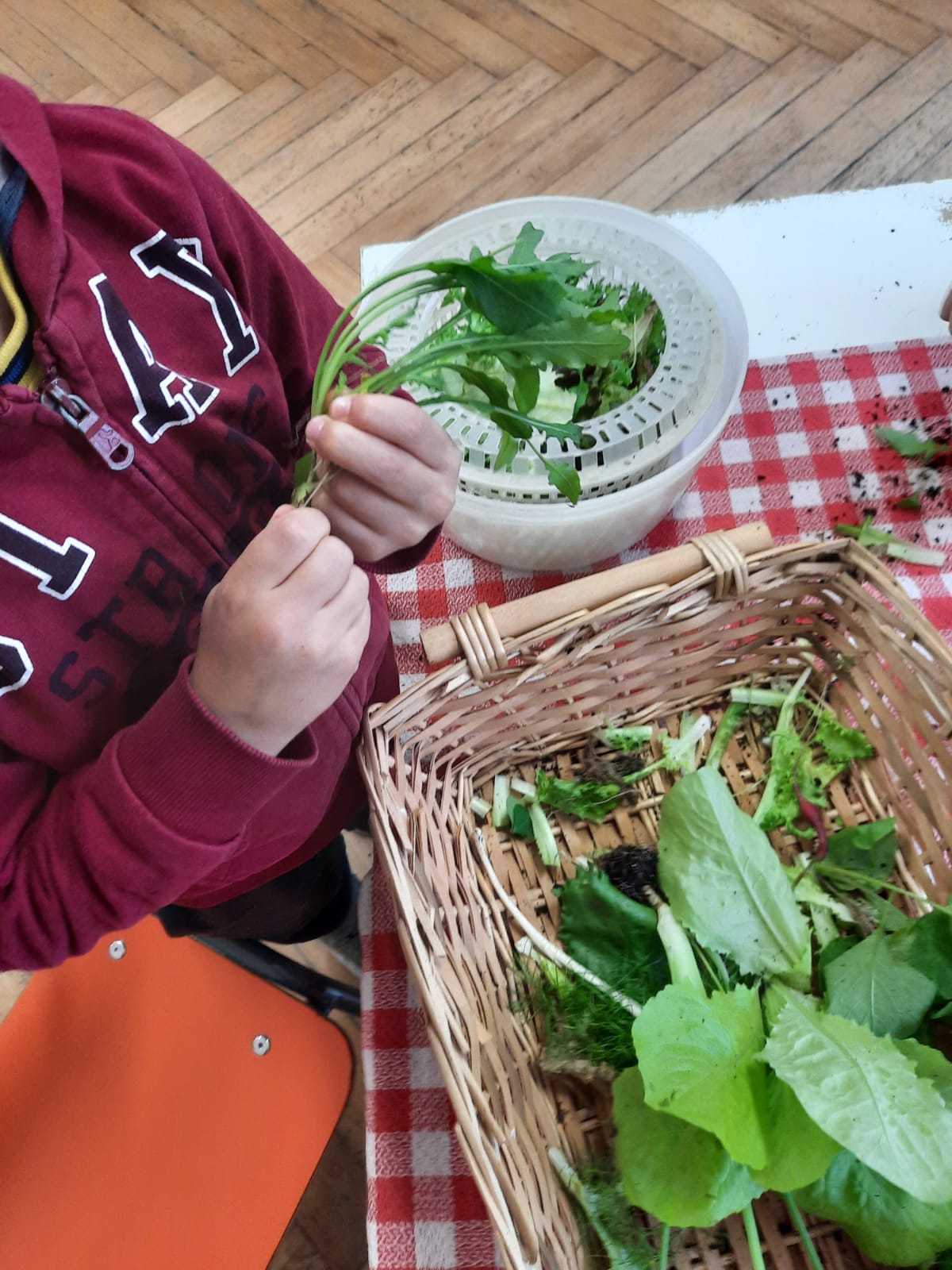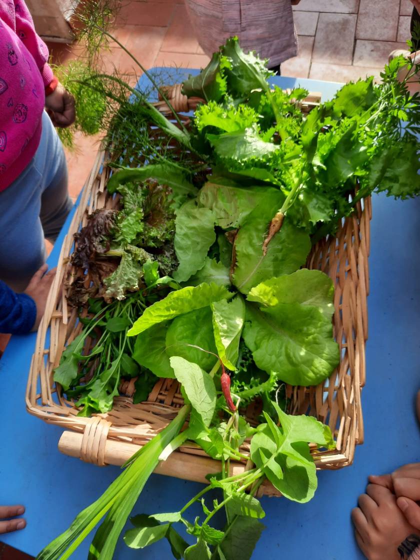 Raccogliamo puliamo, laviamo e degustiamo le fresche insalatine dell’orto: lattuga, scarola, rucola, un po’ di cipollina e odore di finocchio.