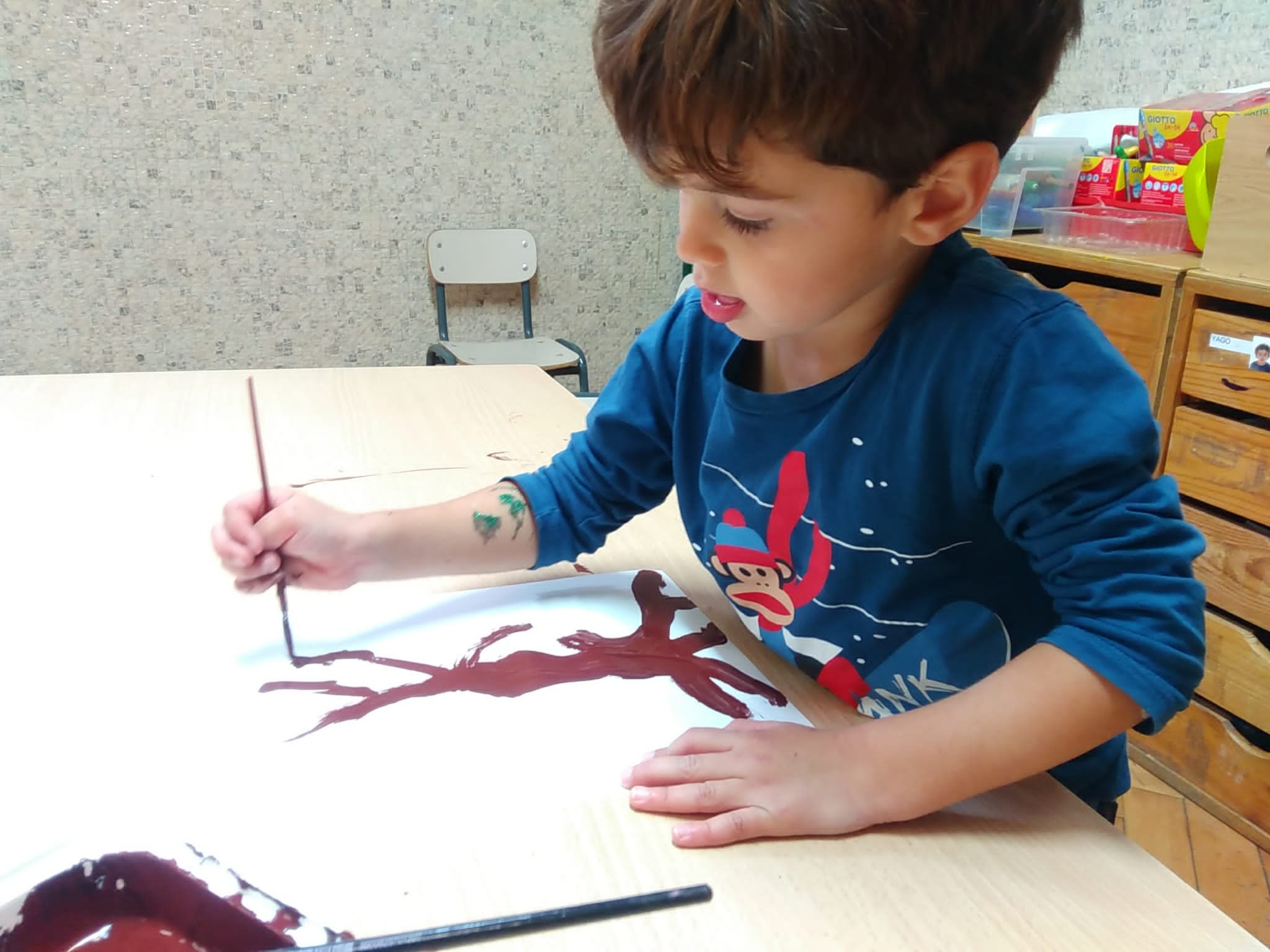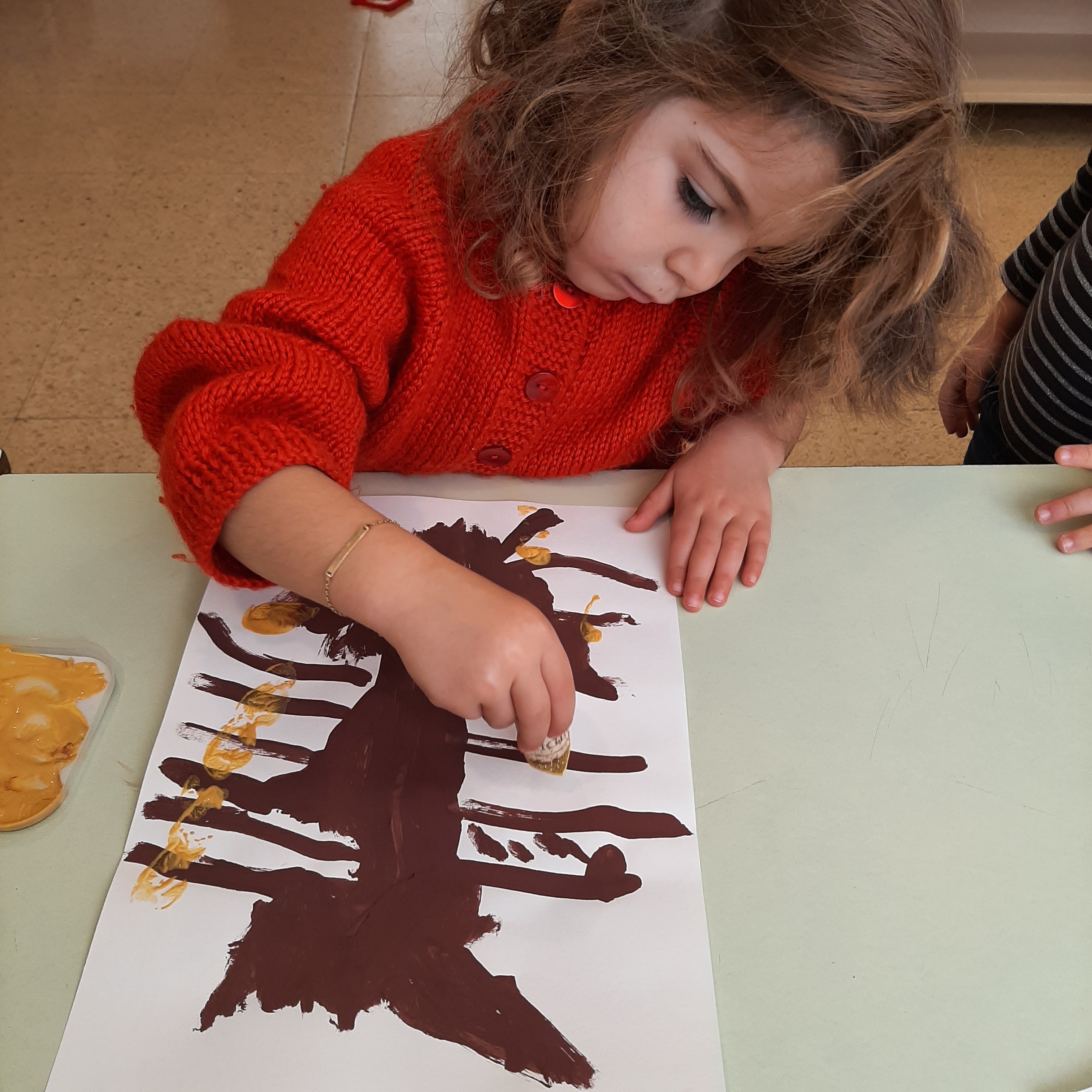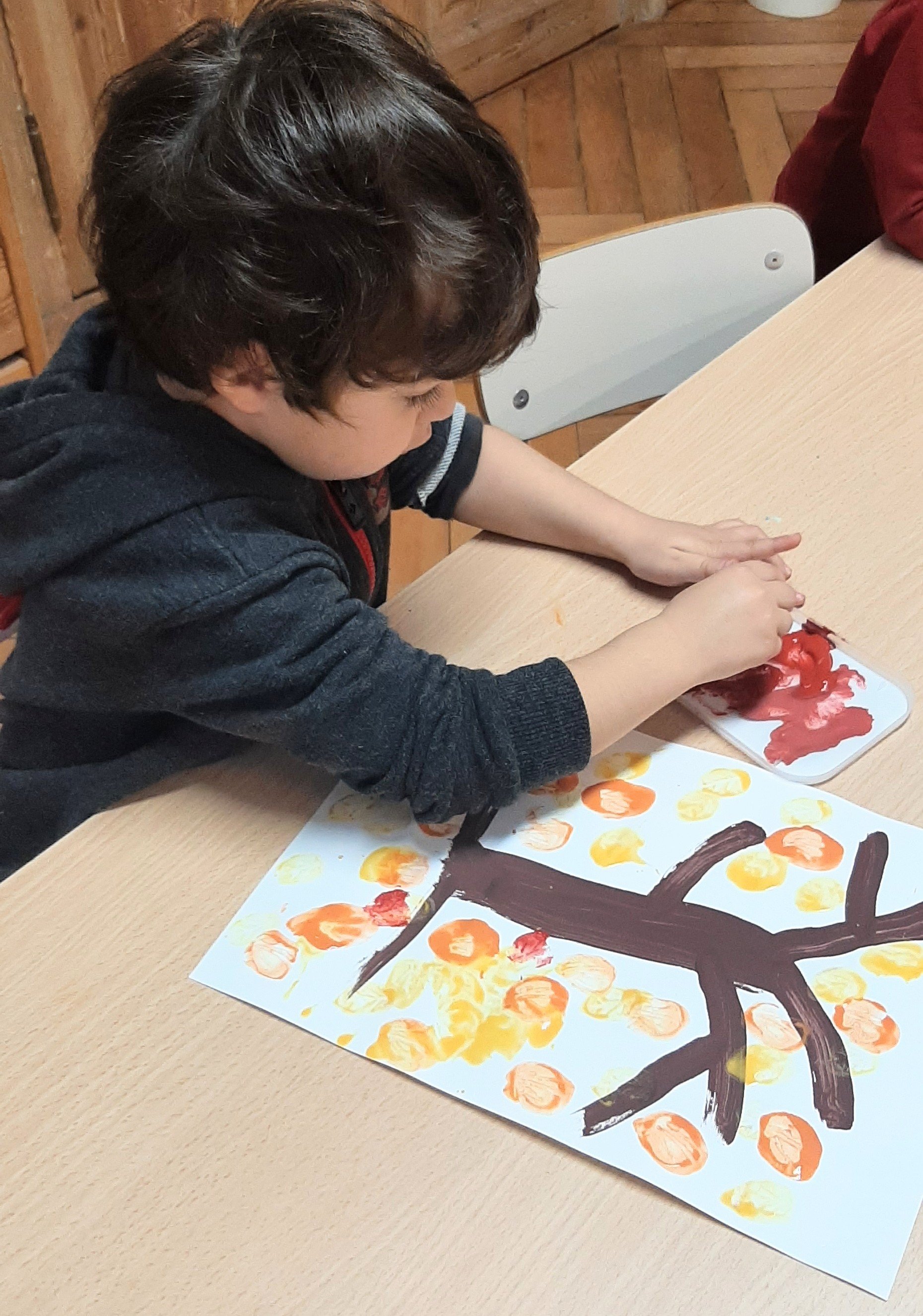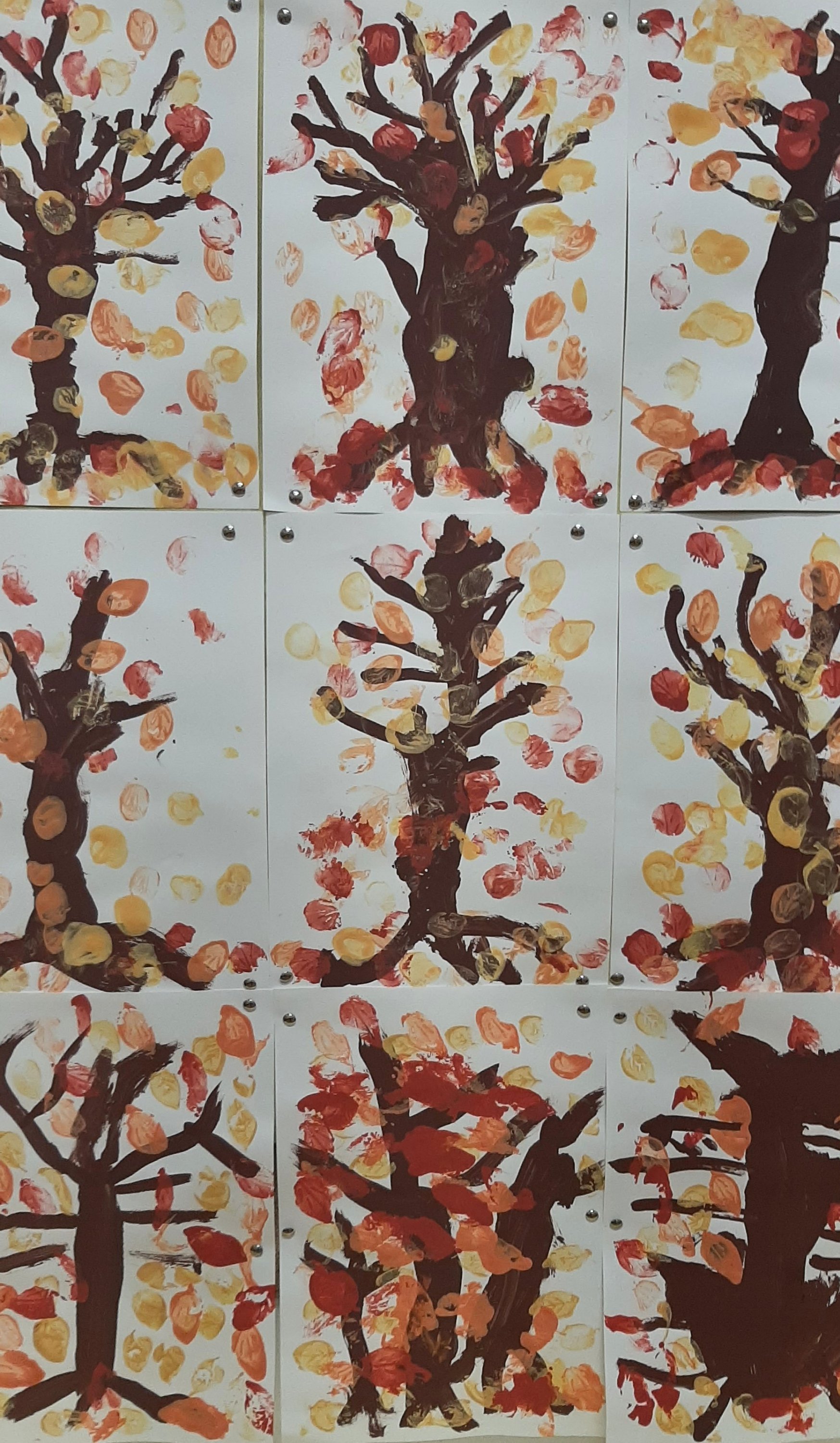 Dopo la lettura del libro: “L’albero vanitoso” di Nicoletta Costa, ci siamo soffermati ad osservare come molti alberi in autunno perdano le loro foglie. Abbiamo visto come i colori dei boschi cambiano, giocando con varie sfumature. Cosí con pennelli e pitture abbiamo voluto ricreare il nostro bosco autunnale. Ognuno di noi ha dipinto il proprio albero e poi con degli stampi ha impresso tante foglie cadenti, di colore giallino, arancione e rossiccio. Quale é stato il risultato? Guardate un po’ anche voi……