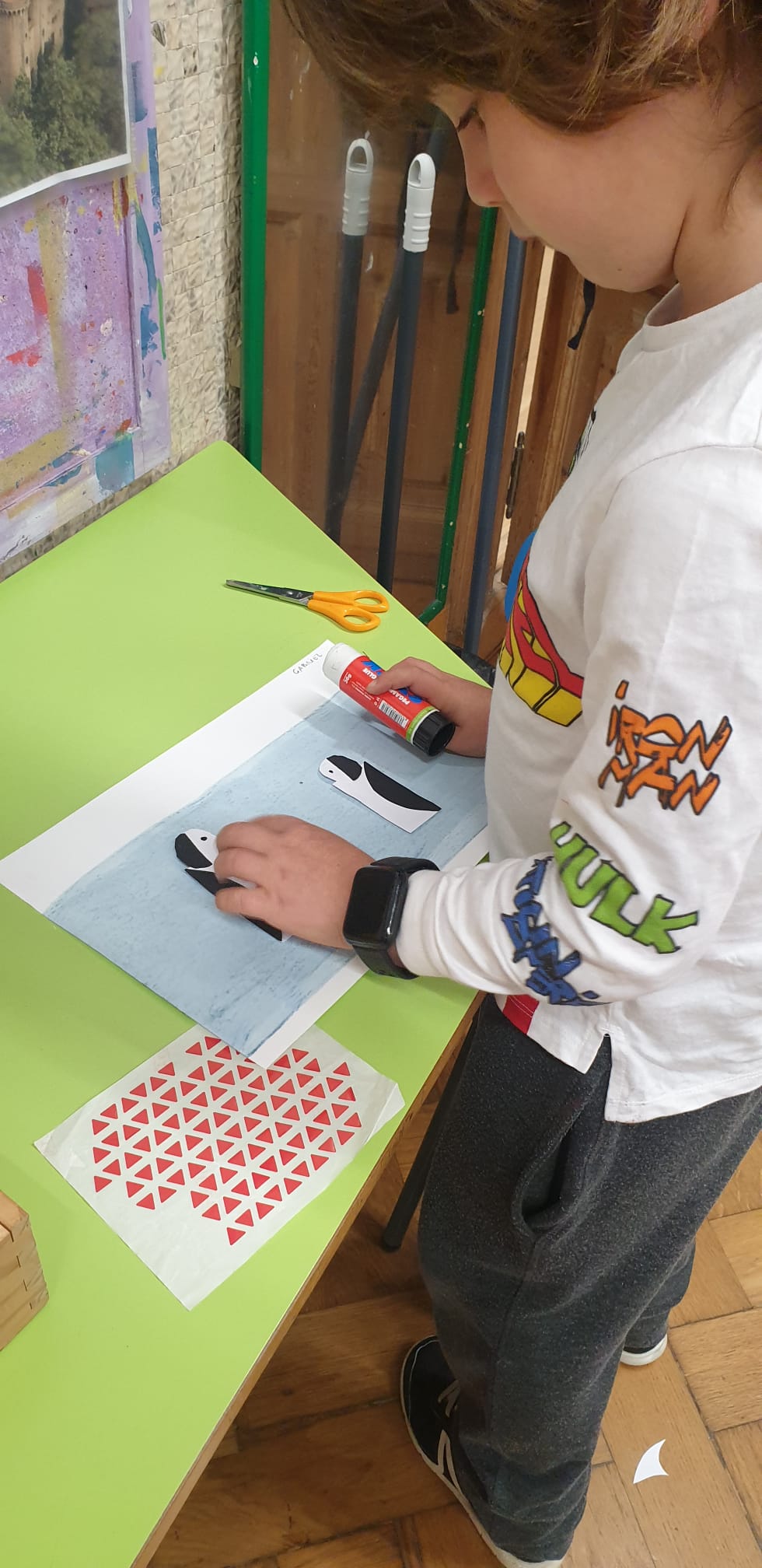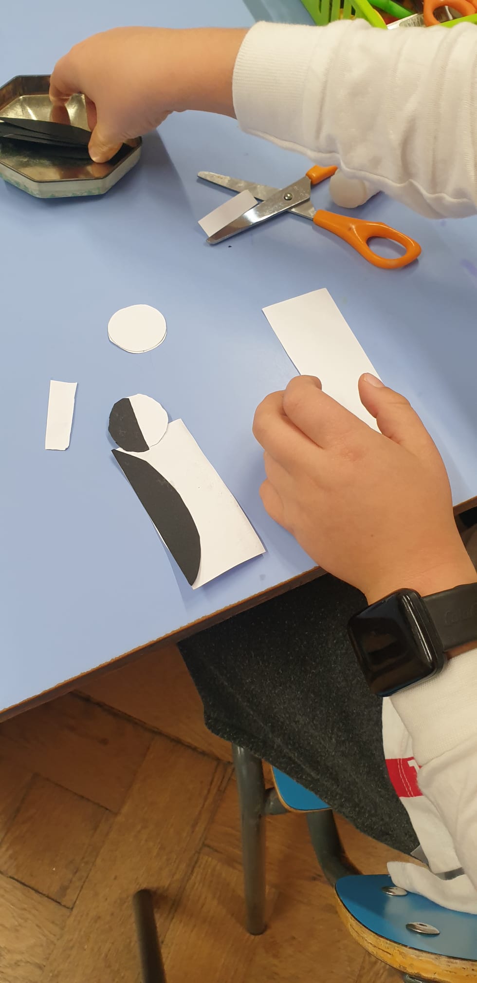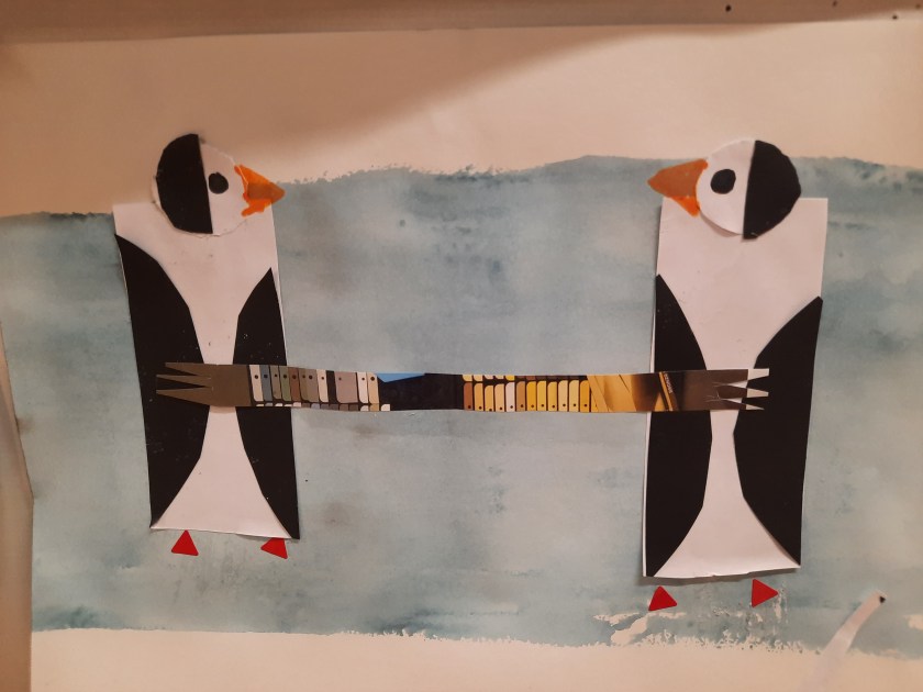 Poi riproduciamo i pinguini usando le forme geometriche, prestando attenzione alle metà speculari e alle direzioni.