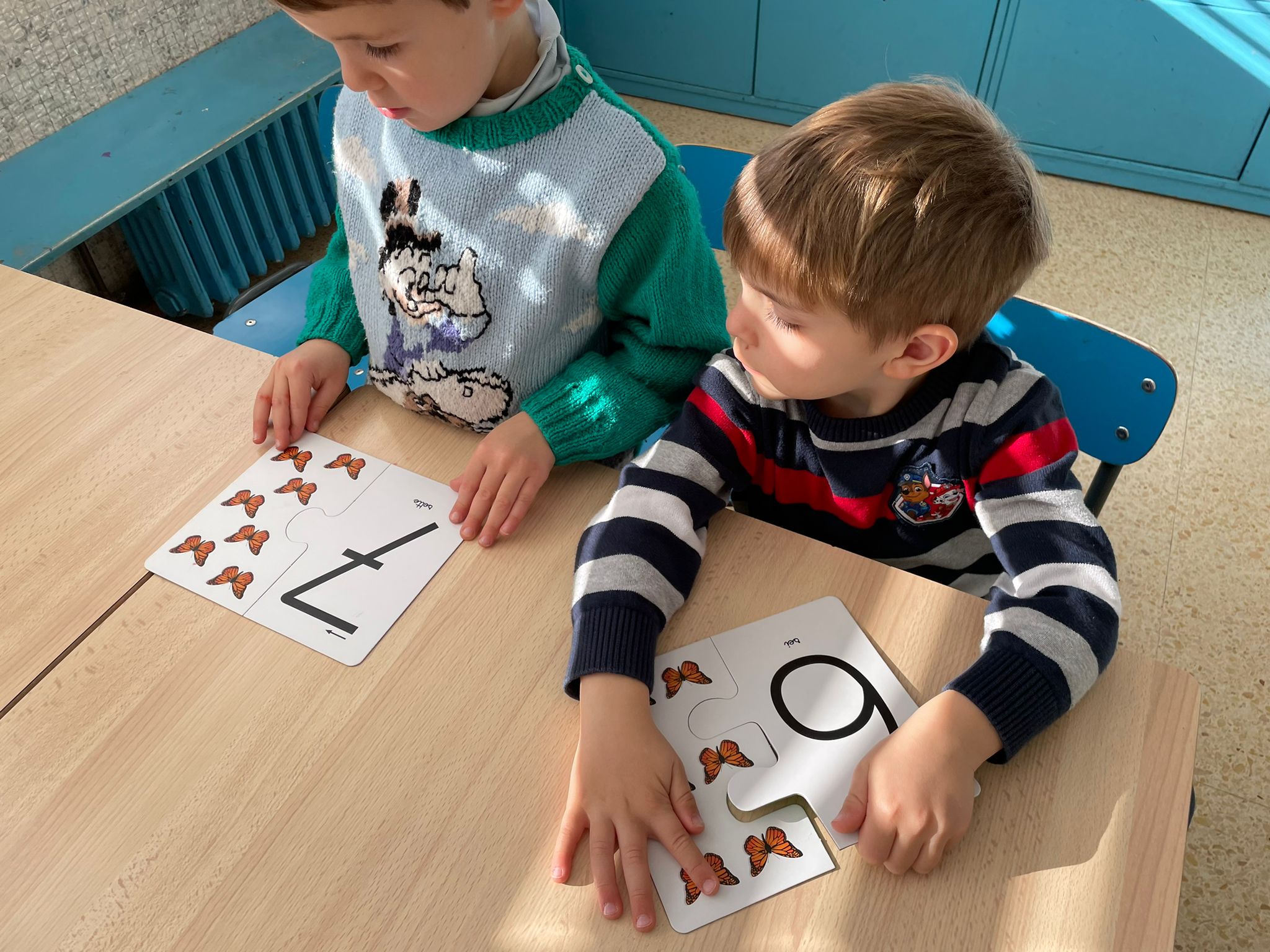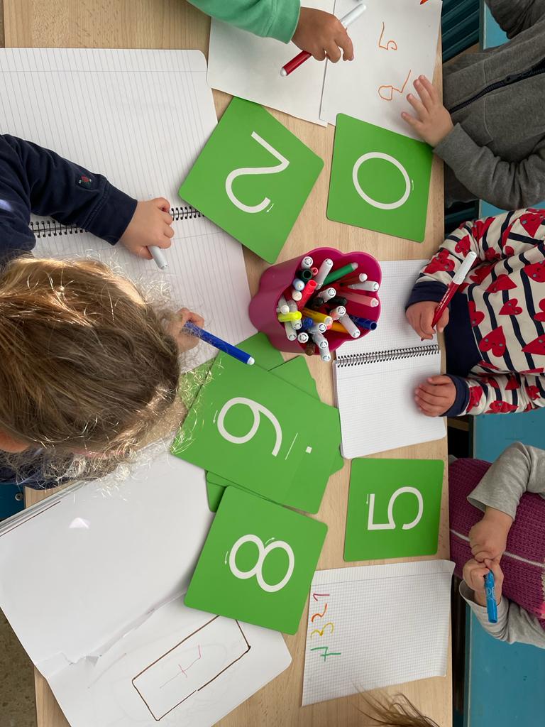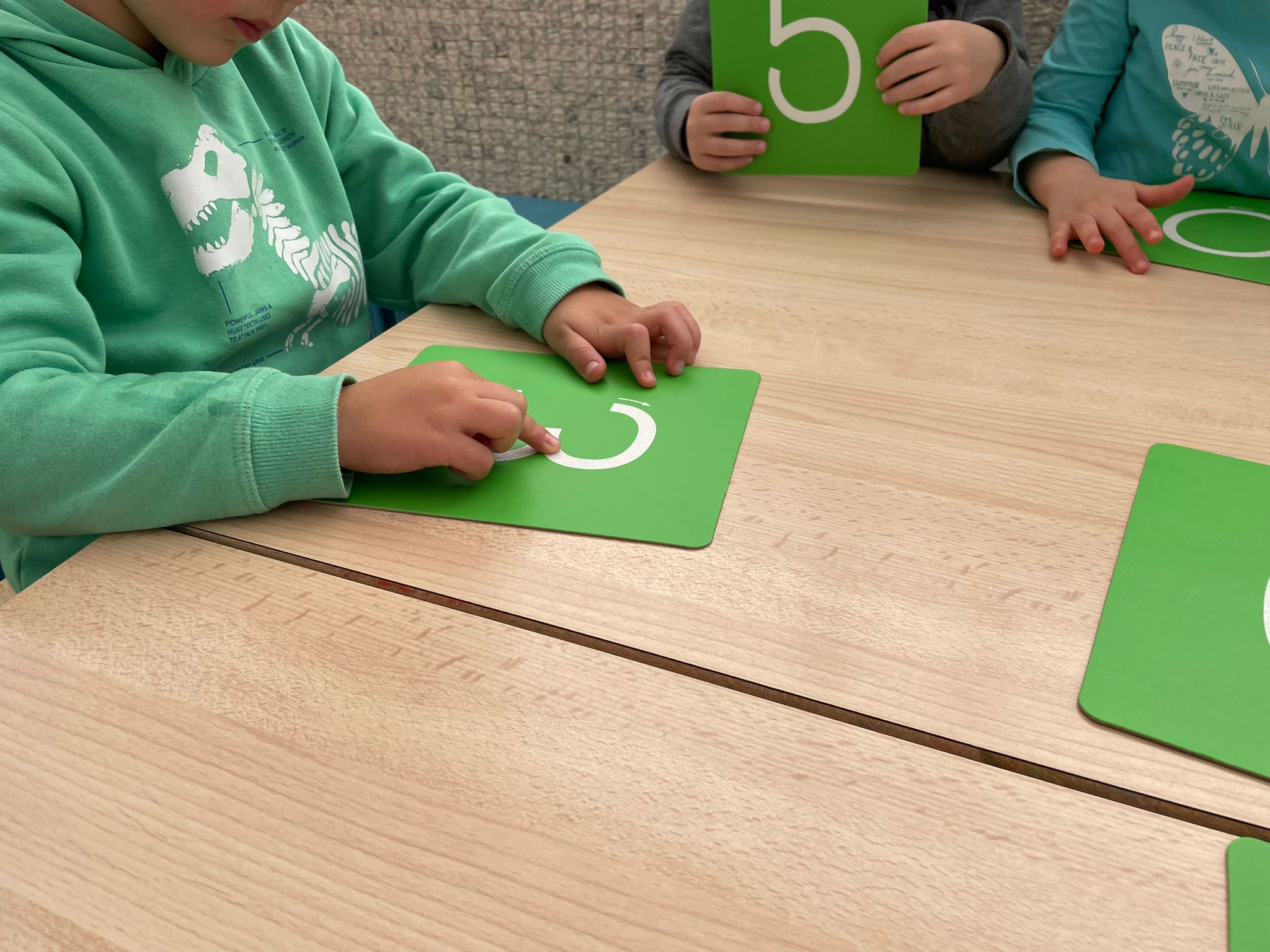 In classe abbiamo giocato con le carte montessoriane, allenandoci a comprendere le quantità, a riconoscere i simboli, ad associare le due cose ed infine a riprodurre la grafia dei numeri, prima con il dito e poi con il pennarello.