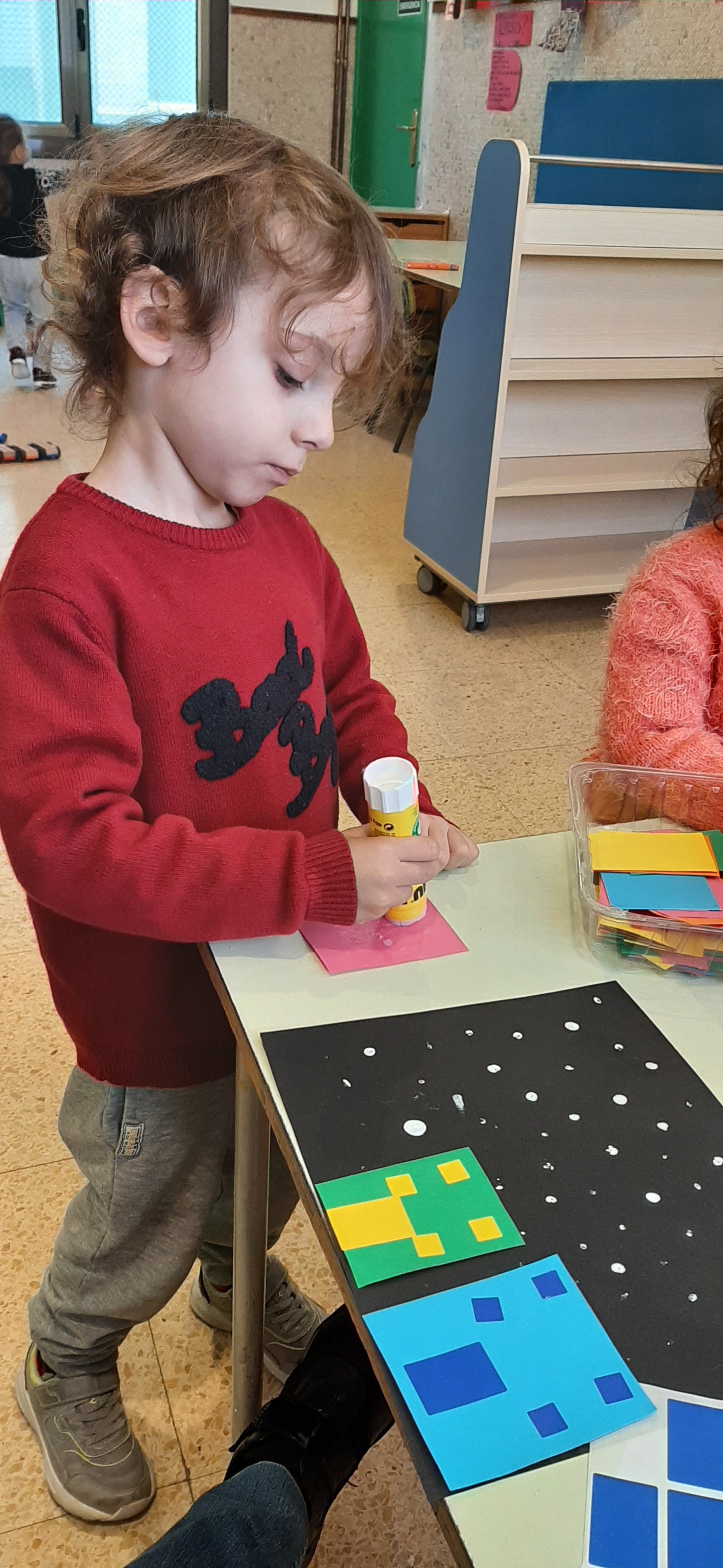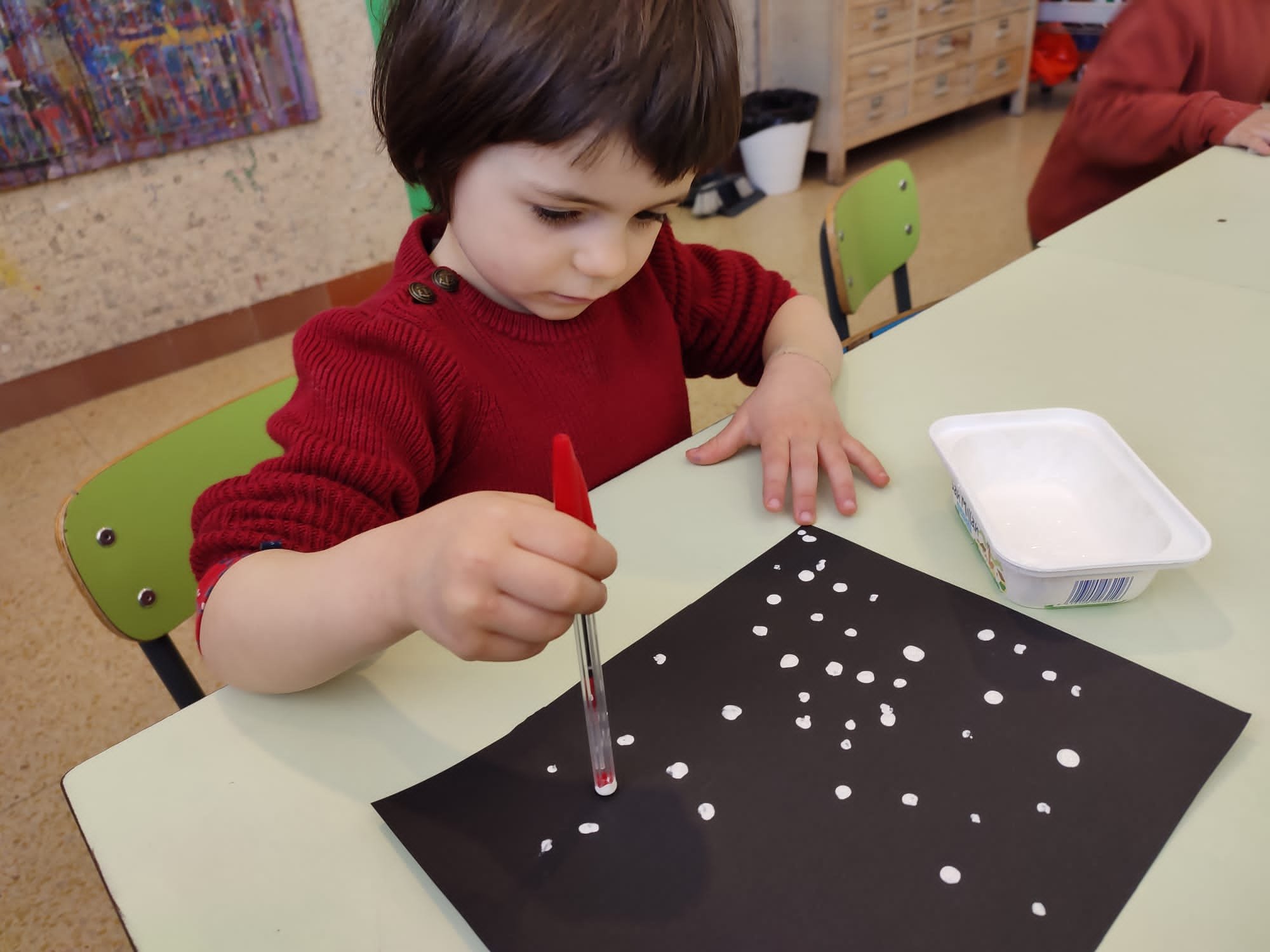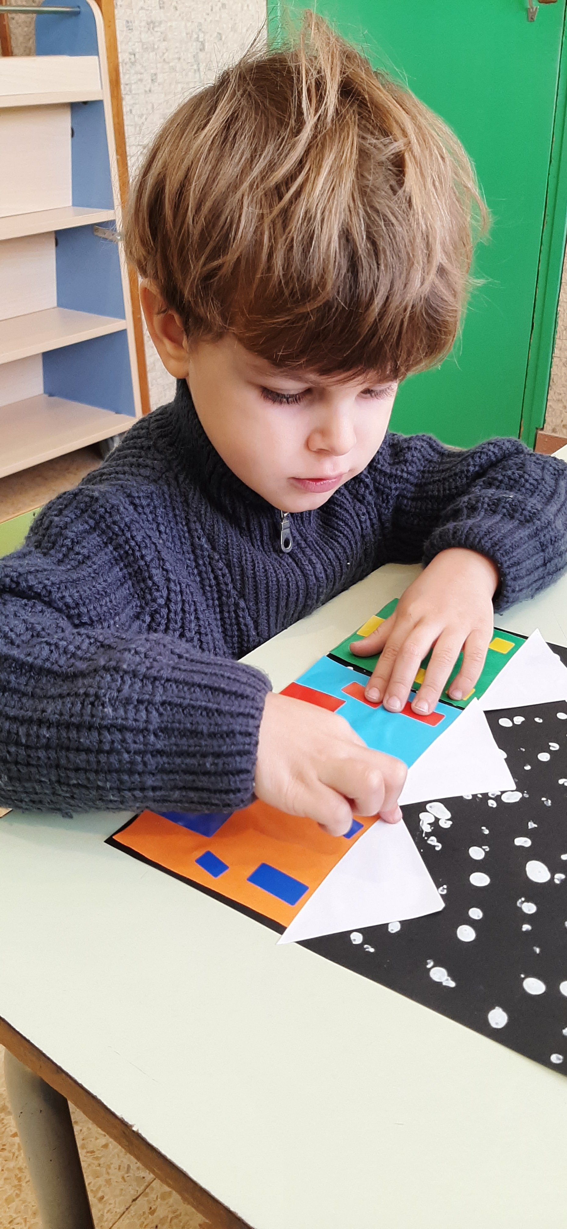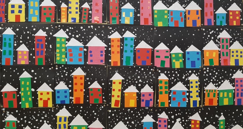 É giunto l’inverno, ci soffermiamo a riflettere su questa stagione. Fa piú freddo e dobbiamo coprirci di piú. Ma é anche bello perché, a volte, cade la neve, che é soffice, bianca e pure “bagnata”. Cosi ci divertiamo a ricreare con cartoncini, pitture ed adesivi, un paesino con tante casette colorate, ricoperte di candida neve.