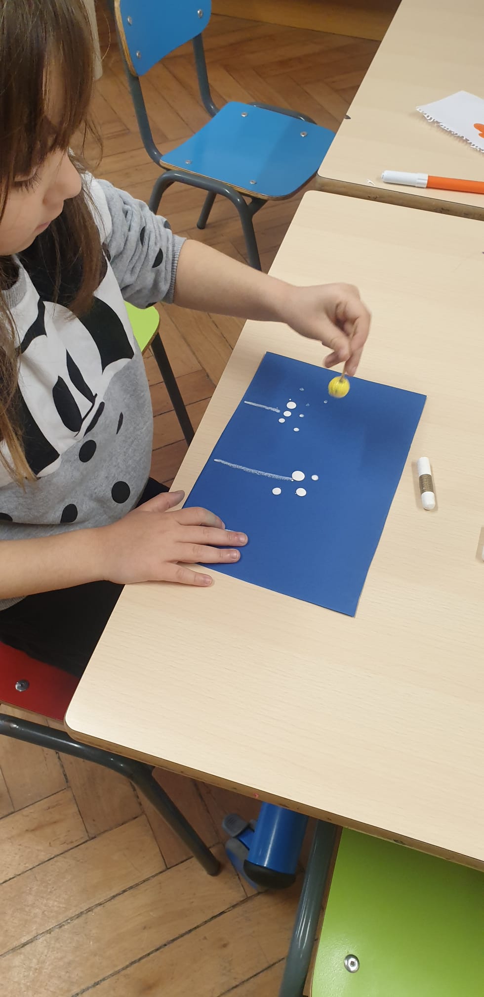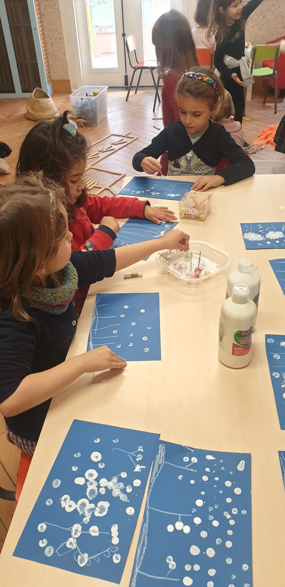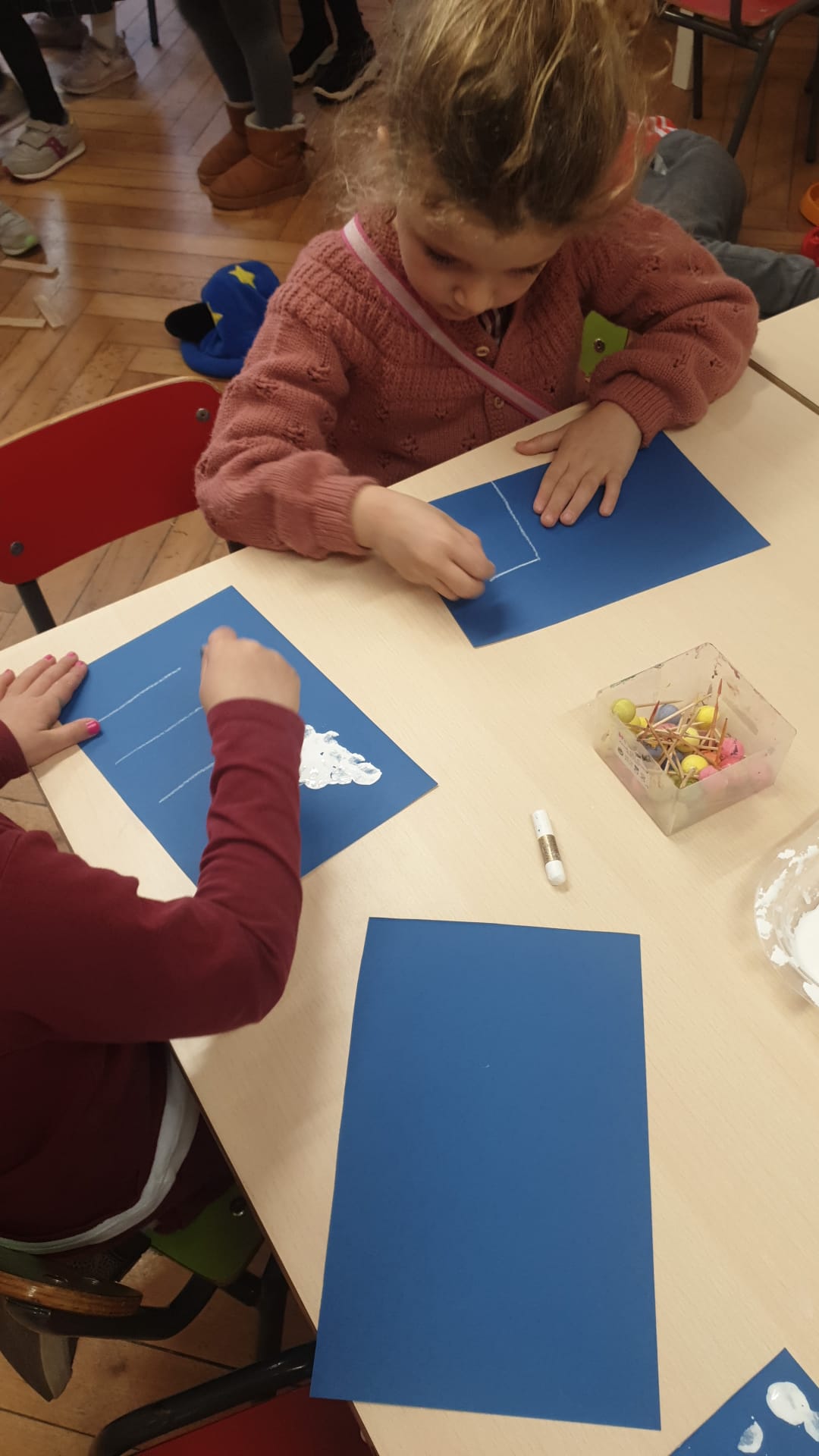 Con gli strumenti prodotti da noi con stuzzicadenti e palline di carta pesta creiamo il nostro paesaggio invernale.