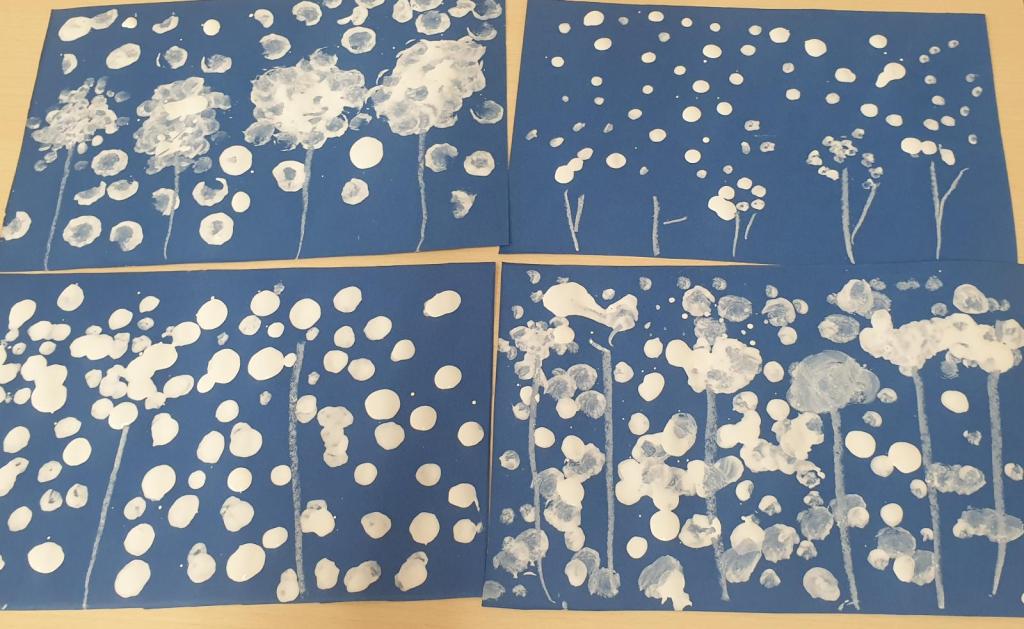 Ascoltiamo la storia di Fiocco di neve e al suono dell’inverno di A. Vivaldi ci dilettiamo con la pittura bianca per ricreare il viaggio di piccolo fiocco trasportato dal vento.