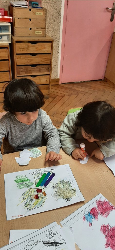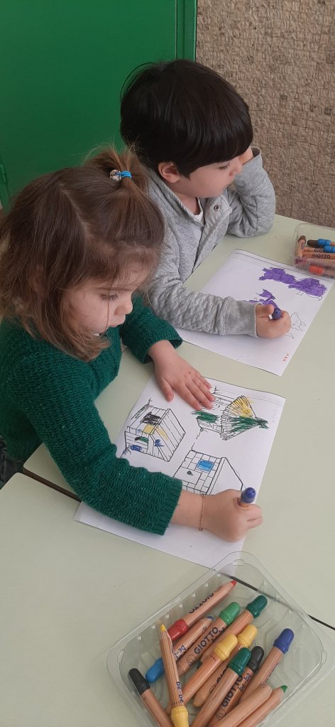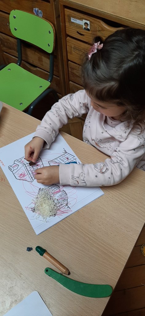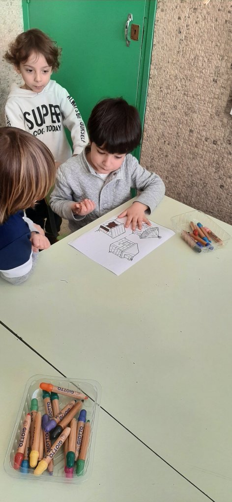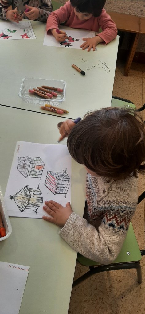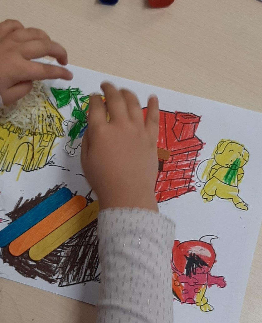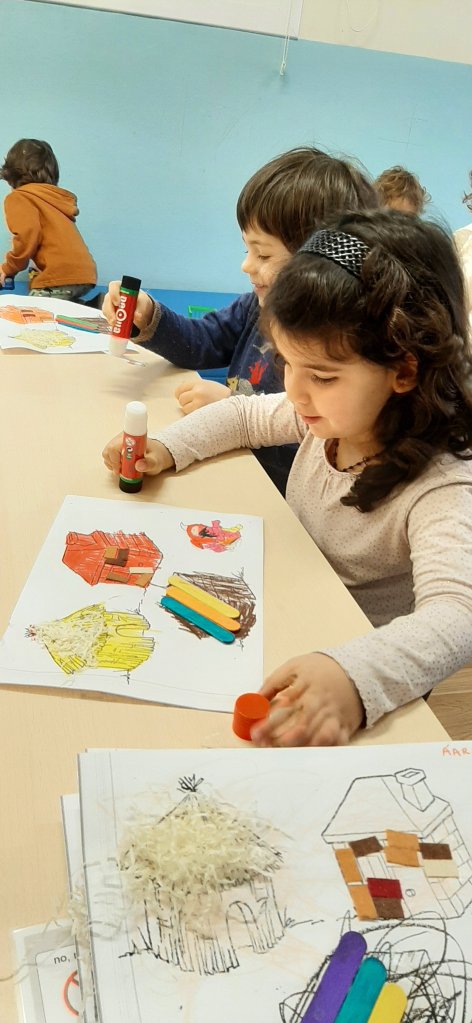 Leggiamo insieme la storia dei tre porcellini e la drammatizziamo. Ci soffermiamo a colorare con le matite i personaggi della fiaba. Osserviamo il materiale di cui erano fatte le tre casette dei fratellini. La prima era di paglia, la seconda di legno e la terza di mattoni. Utilizziamo vari elementi di recupero e facendo un collage, ricreiamo su foglio le graziose casette dei tre porcellini. Ed eccole qui!!