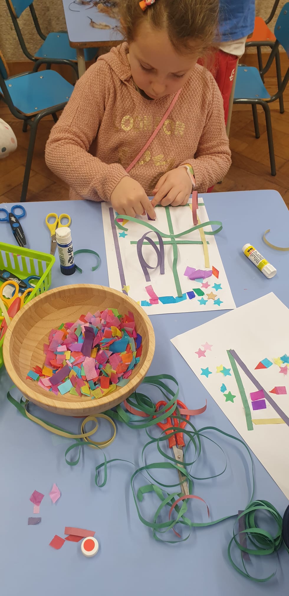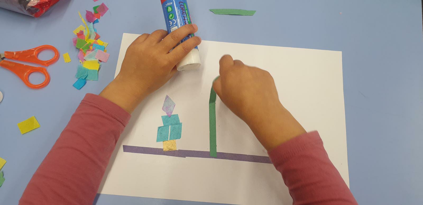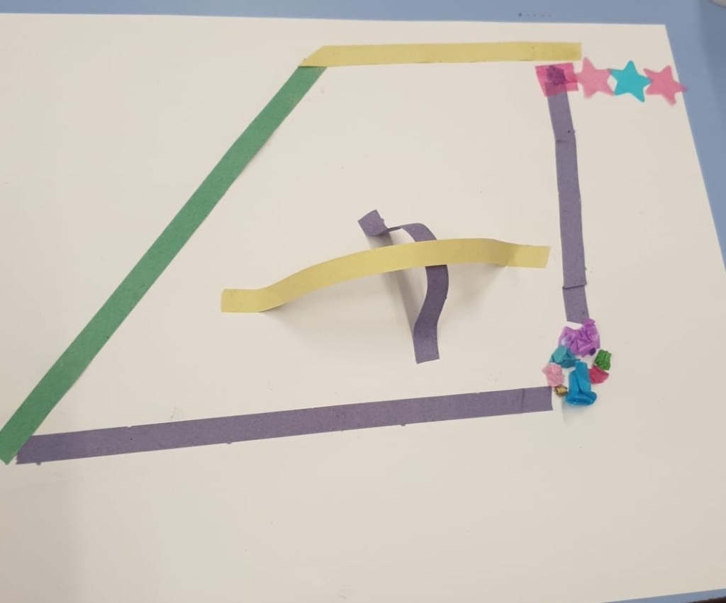 A scuola, invece, ci mettiamo alla prova con un esercizio topografico artistico per ricreare delle mappe viste dall’alto. Stabiliamo la legenda: i coriandoli geometrici sono le case, i coriandoli a forma di stella le aree verdi, le stelle filanti i ponti e le strade.