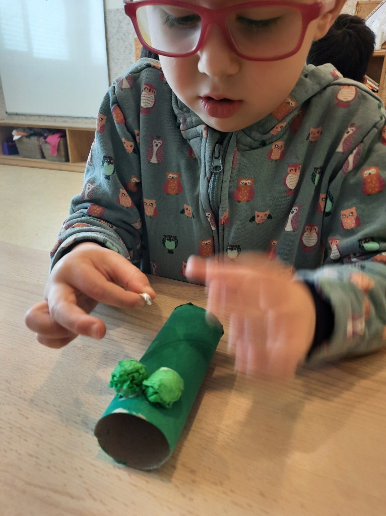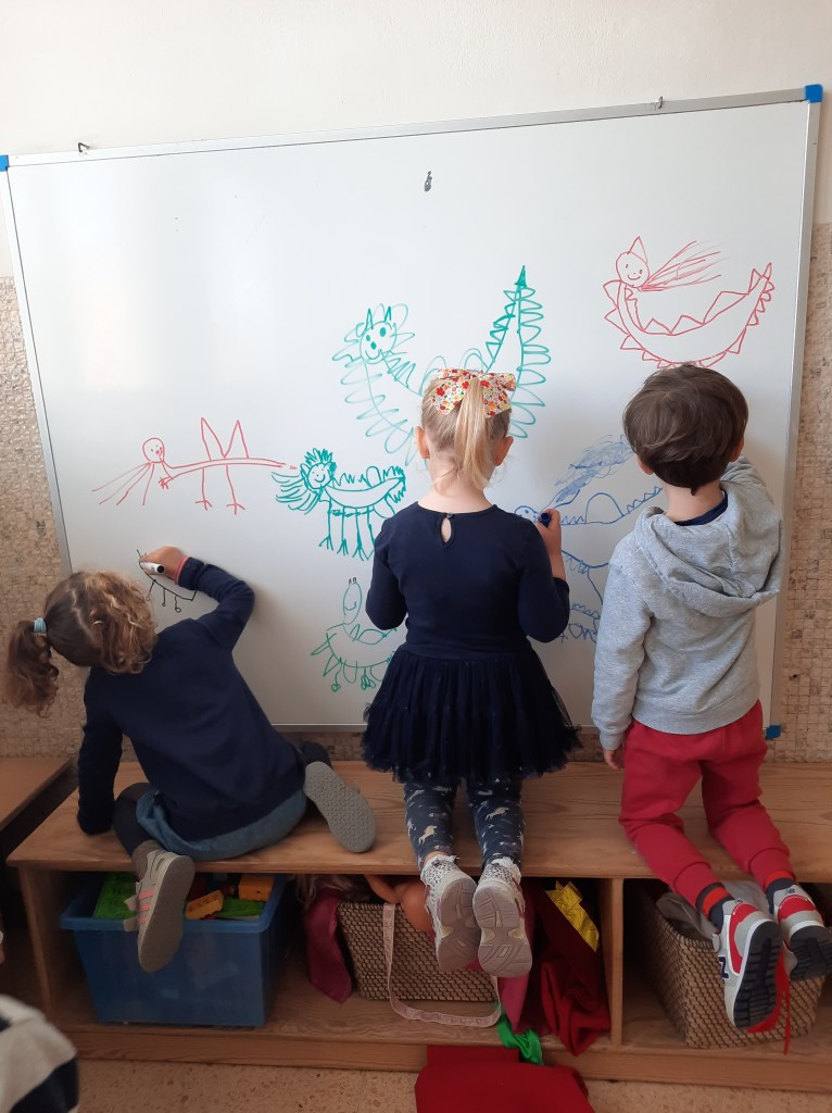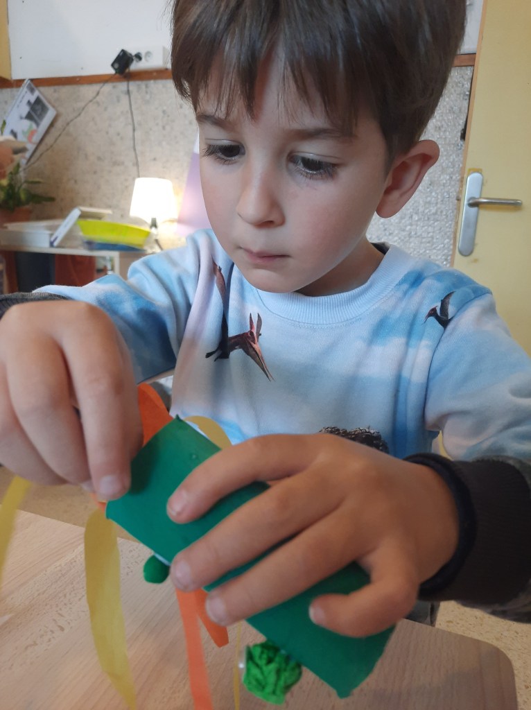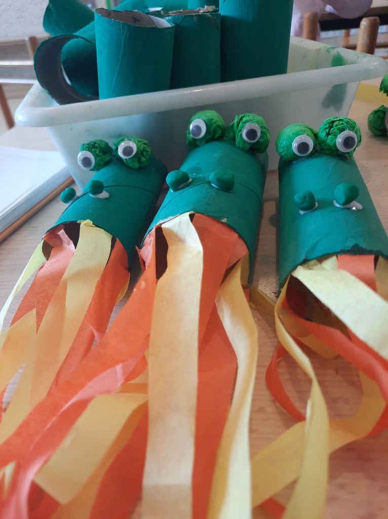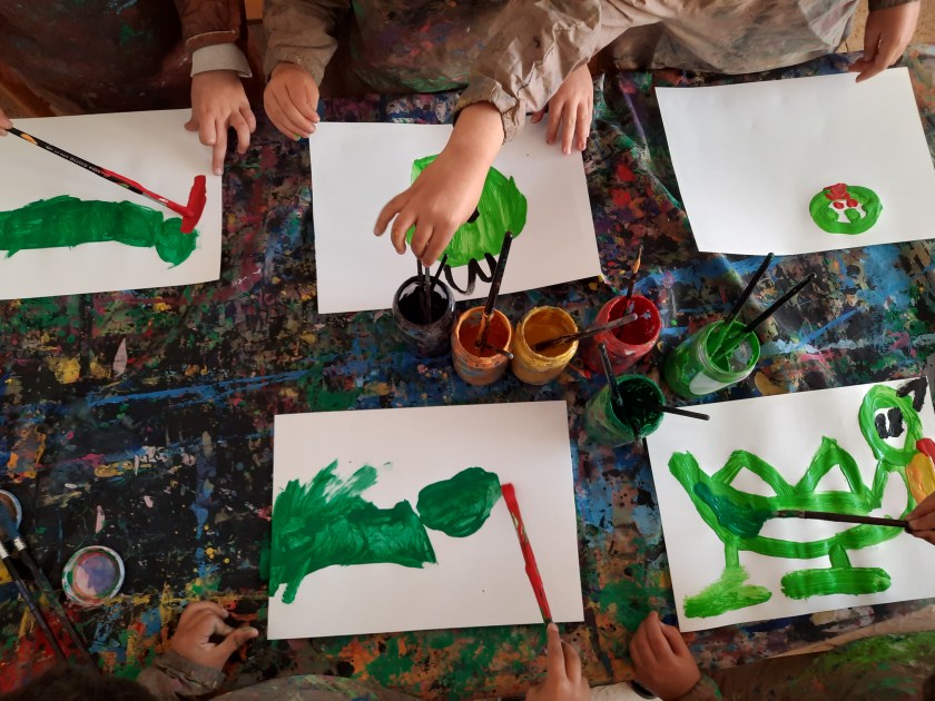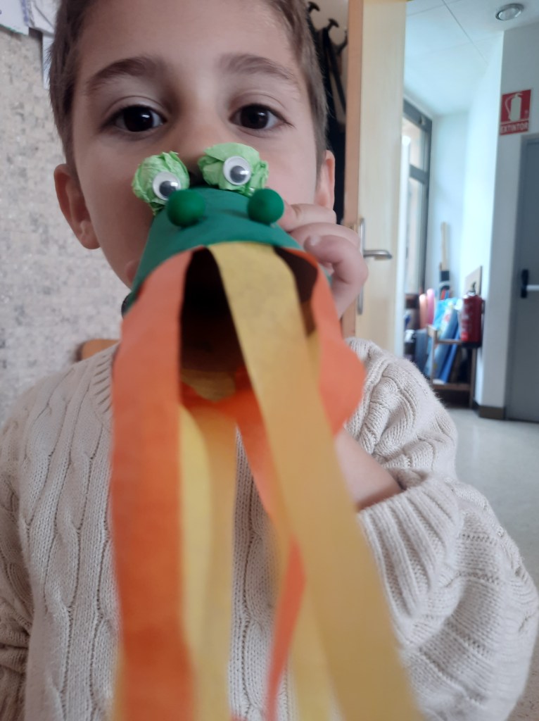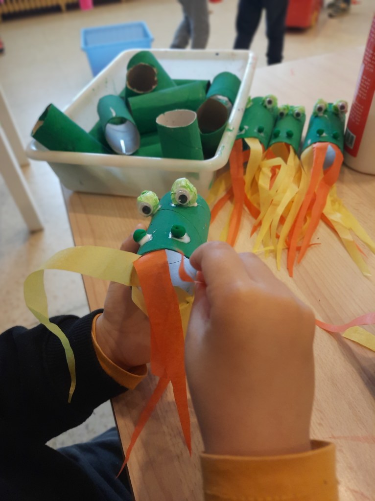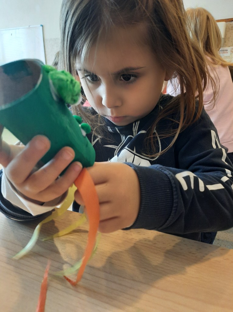 Nella classe dei 4 anni i bambini e le bambine si sono invece dedicati ai draghi, costruiti a partire da un rotolo di carta dipinto di verde e poi anche disegnati e dipinti con la tempera…
