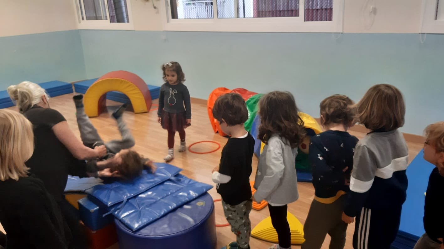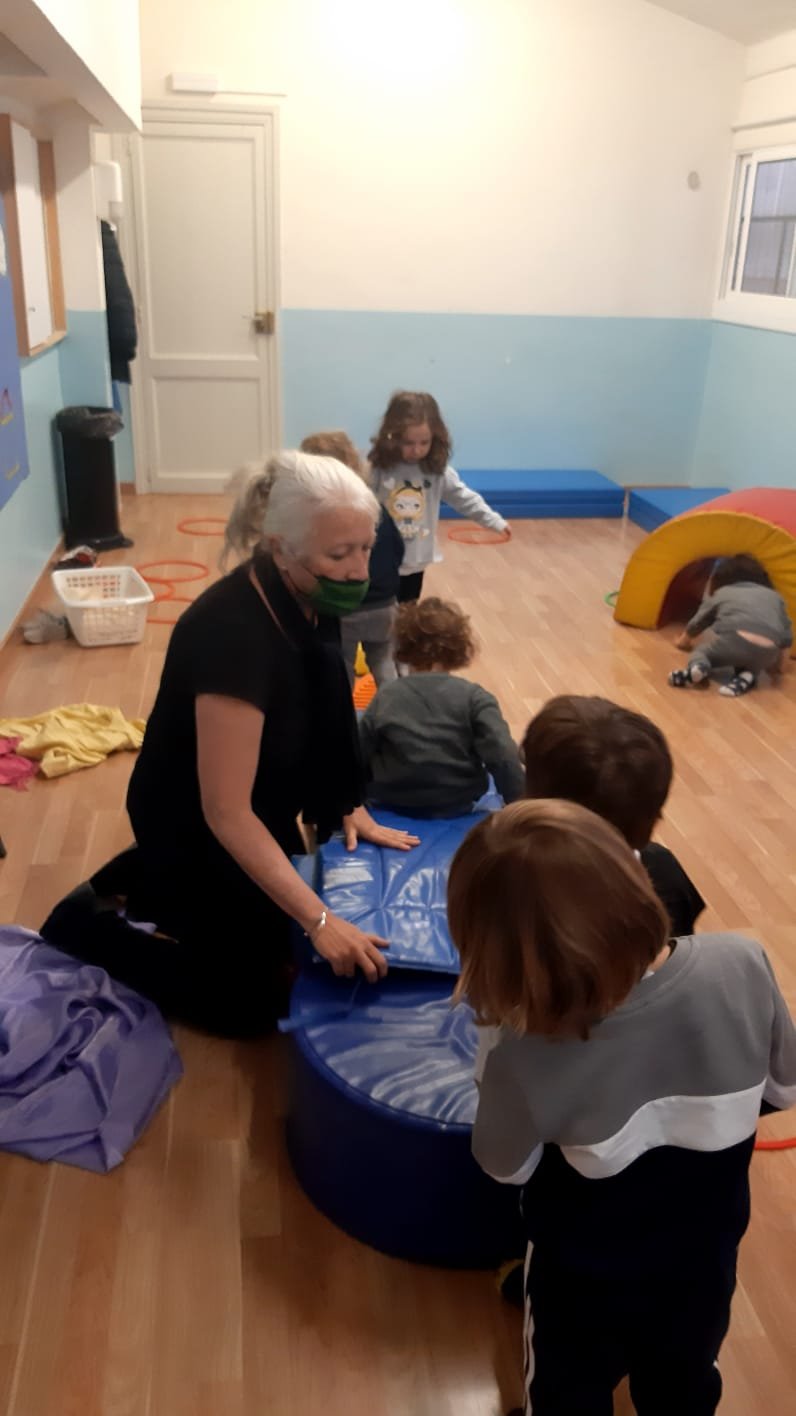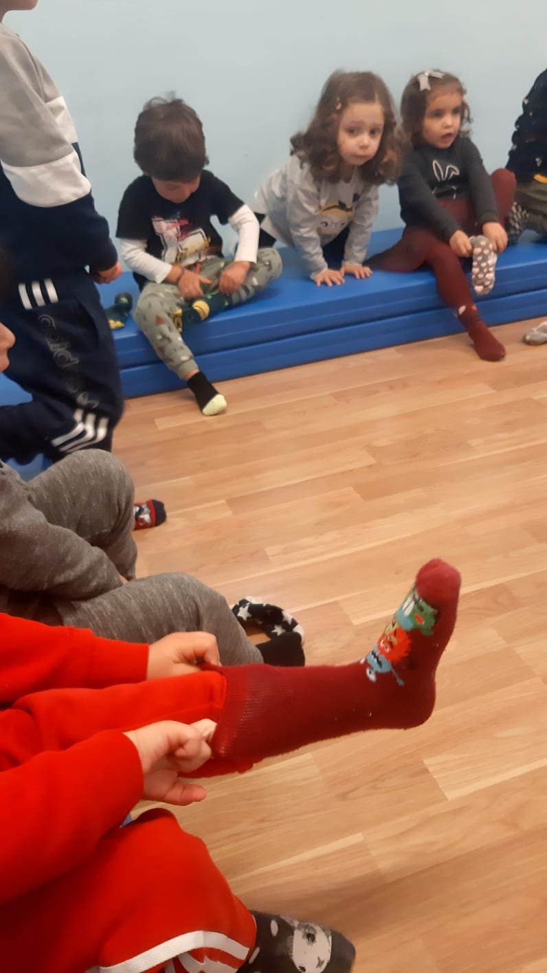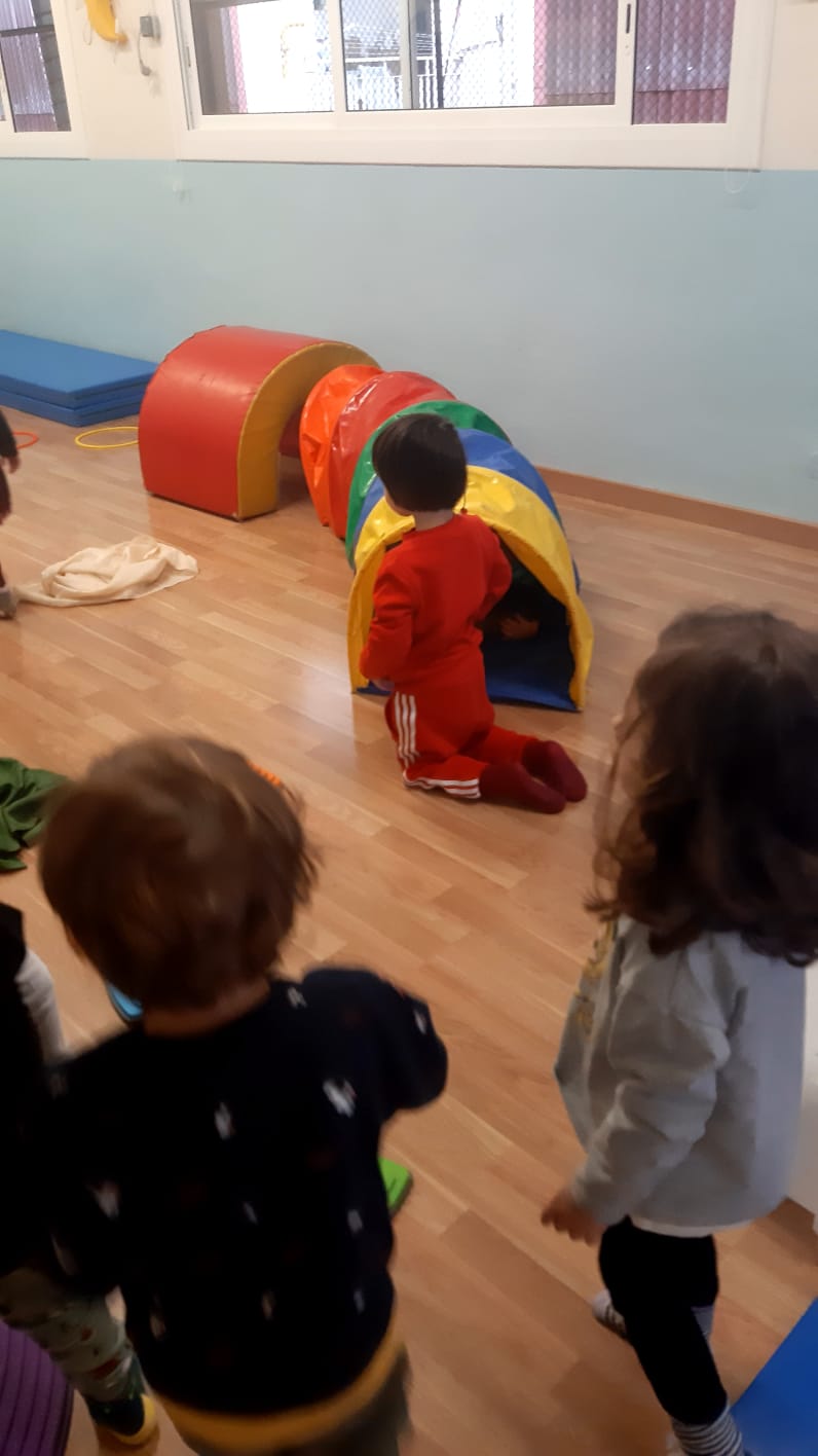 Continuano le nostre sessioni di psicomotricitá: adesso si che siamo grandi! Mettiamo i calzini da soli e facciamo il saluto tutti in cerchio con la filastrocca di Pinocchio. Il gioco delle scatoline piace tanto ed anche i percorsi dove ci sono passaggi piú o meno difficili ed emozionanti, come il tunnel e le capovolte sulla pendenza. Ma la maestra é sempre lí ad aiutarci! Con i cerchi diventiamo abili giocolieri, li facciamo ruotare, li lanciamo, li attraversiamo, oppure diventano le nostre case. Giocare con la palla fa parte dei nostri giochi preferiti. Impariamo a lanciarla a farla rotolare e ci alleniamo a prenderla al volo, che é sempre un po’ difficile! E alla fine del gioco, un momento rilassante: le carezze del vento, dove un telo colorato ci sfiora dolcemente e con leggerezza!!! É la maestra che lo muove e lo fa passare delicatamente sulle nostre teste e sul corpo, mentre siamo sdraiati tranquilli sui materassini.