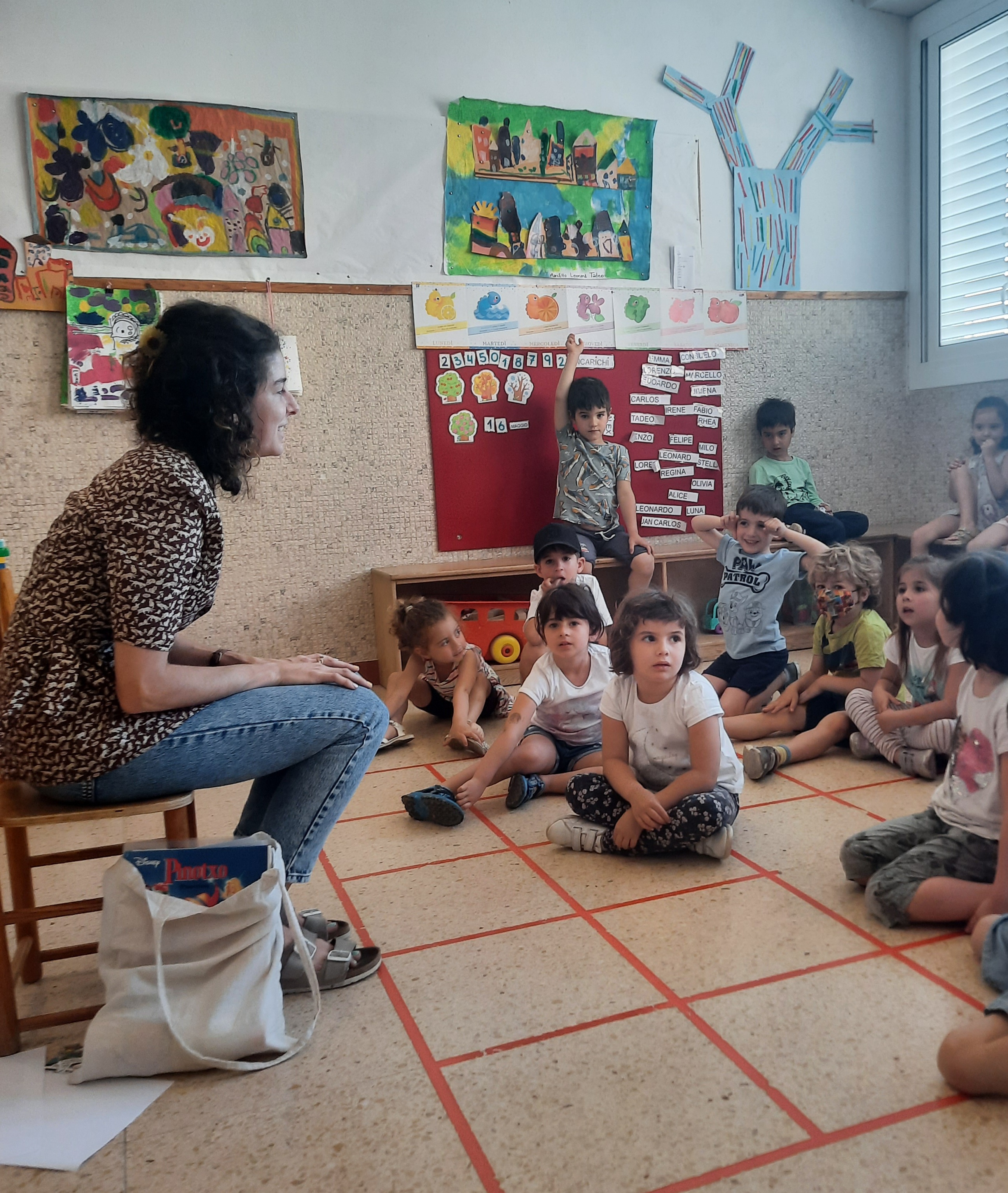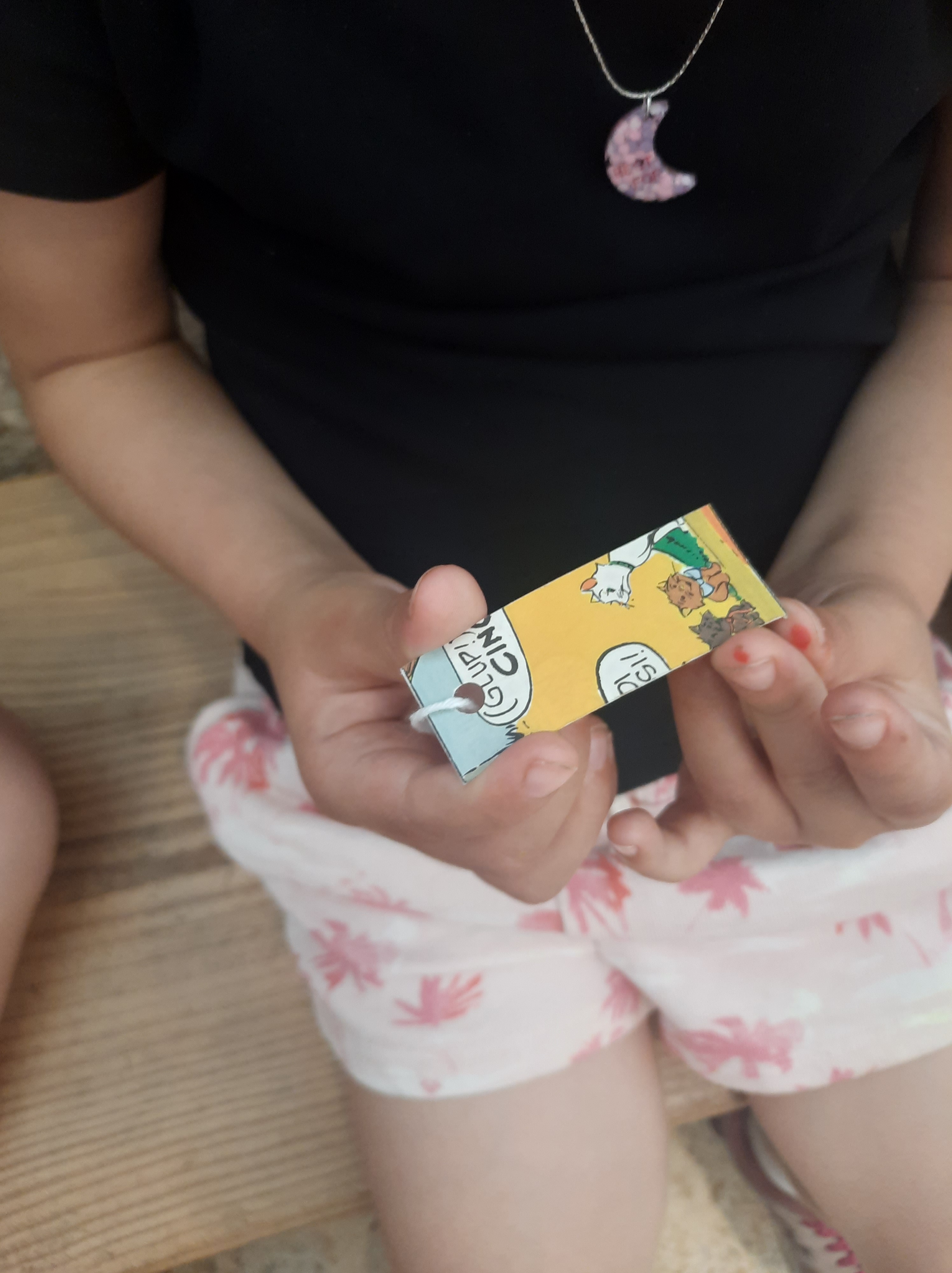 Il gruppo dei 4 anni ha potuto invece riflettere insieme a Leonie sull’importanza di riciclare e dare una seconda vita agli abiti che non indossiamo più, così come fa lei. Persino le etichette che abbiamo creato, da appendere ai nostri zaini, sono fatte a partire da immagini di libri ormai inservibili!