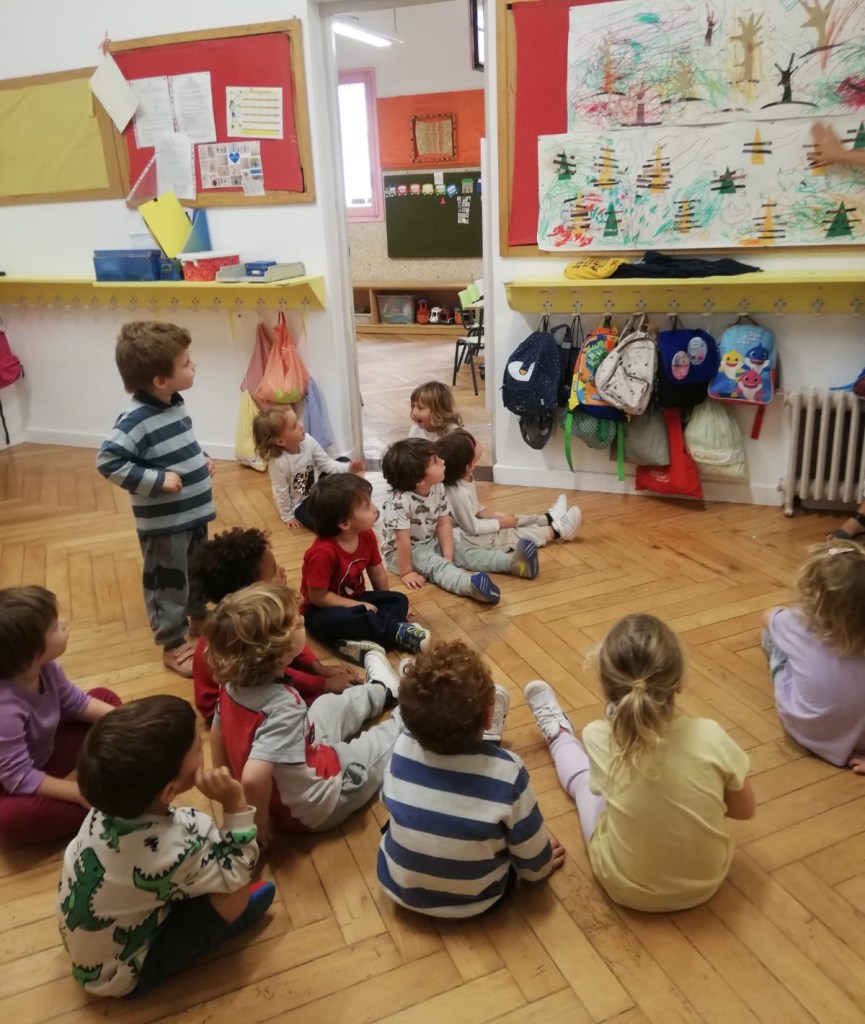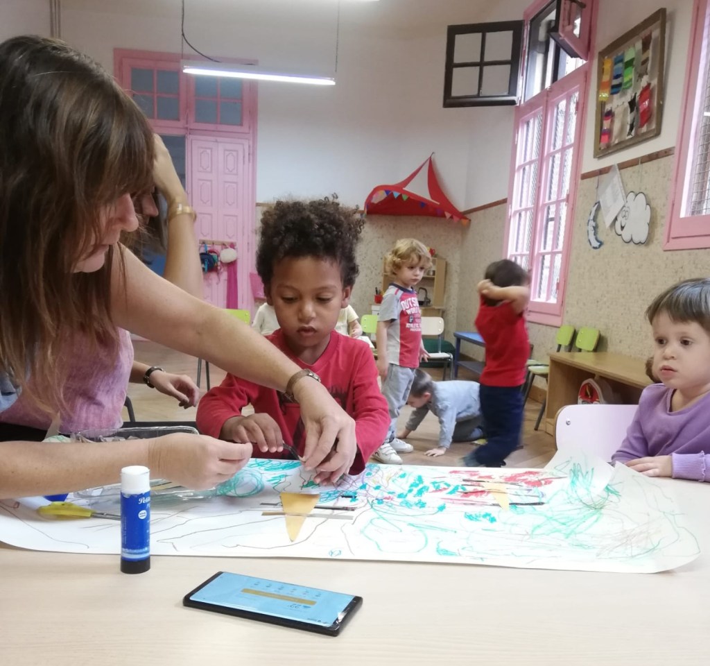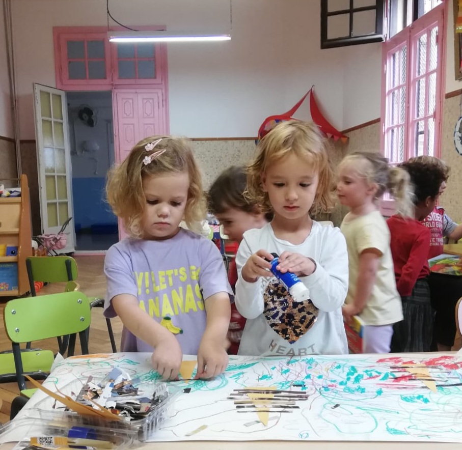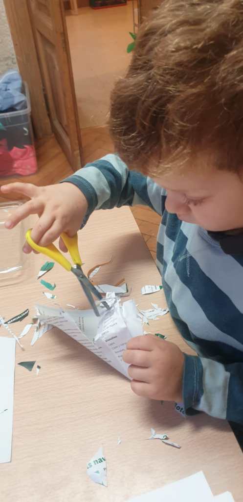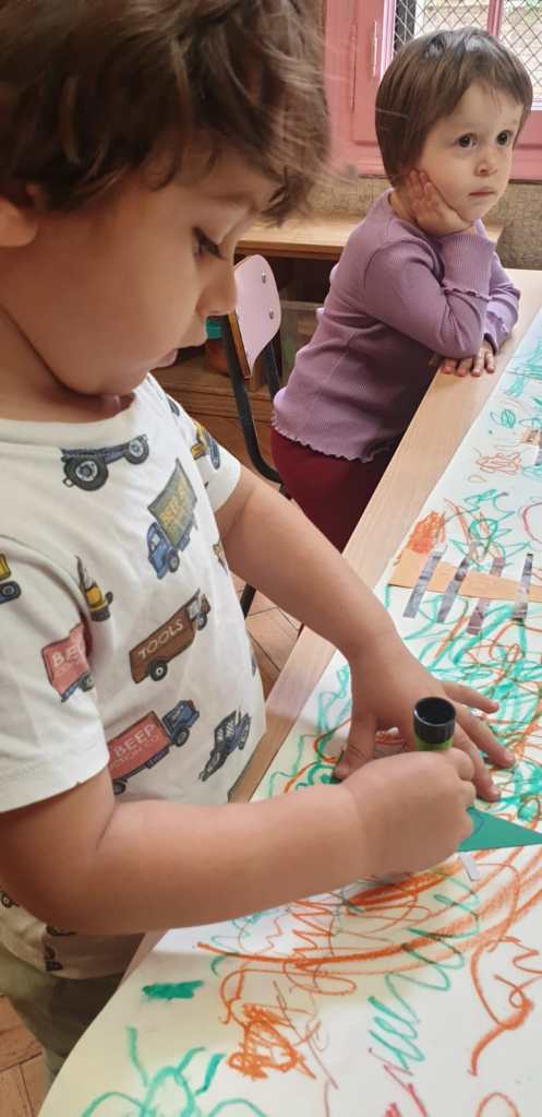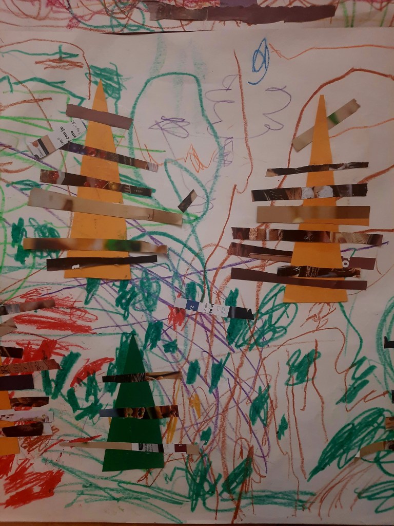 La stagione dell’autunno e i suoi colori ci hanno fatto riflettere sulle forme della natura e hanno ispirato questo bosco, realizzato con i pastelli a cera, per lo sfondo e con cartoncino e fogli di giornale, per gli alberi.