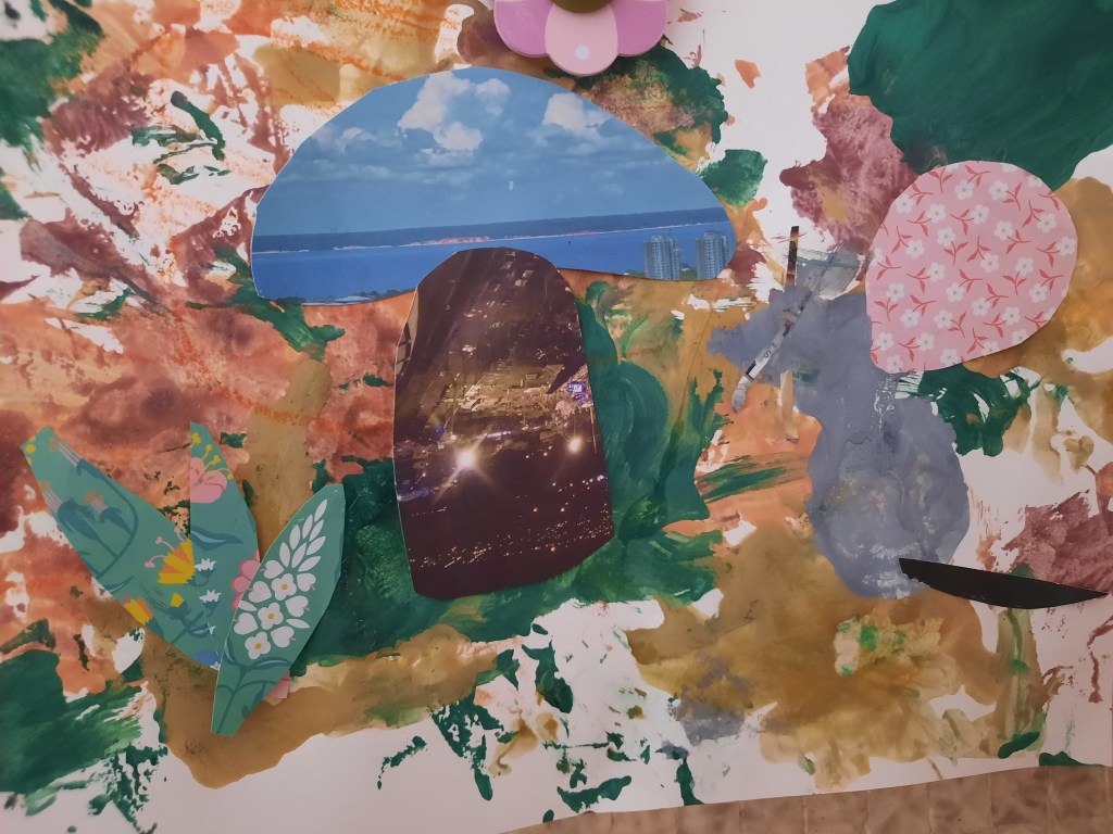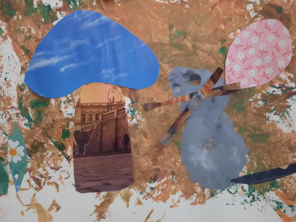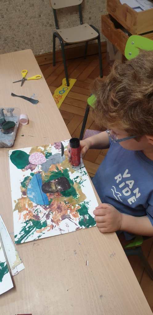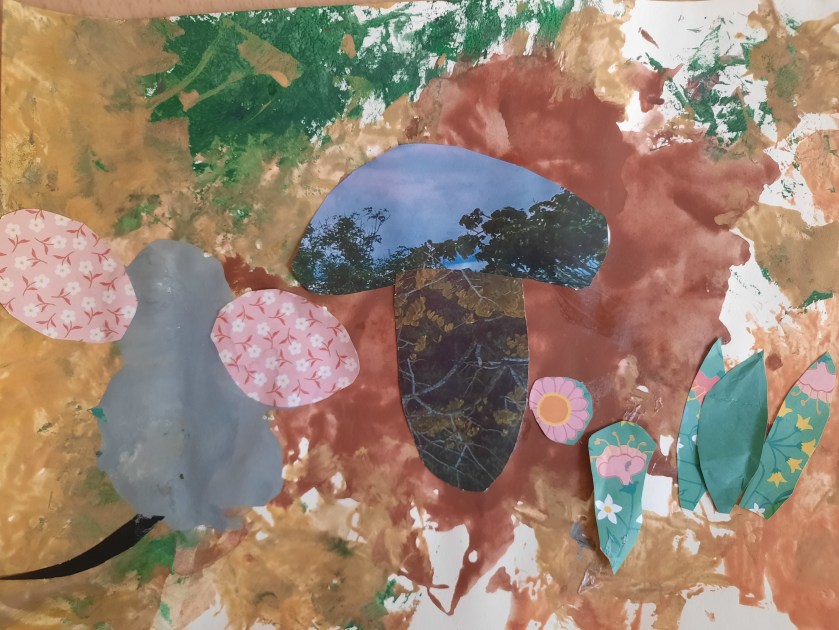 In una seconda fase abbiamo ascoltato la lettura di Teodoro e il fungo parlante di Leo Lionni, ed abbiamo usato gli sfondi creati con gli stampi precedenti per riprodurre graficamente la storia, lavorando contemporaneamente sul lessico e sulle parti del racconto. Usando una tecnica mista di collage e stampi con spugne abbiamo ottenuto la forma del topolino, del fungo e delle piante.