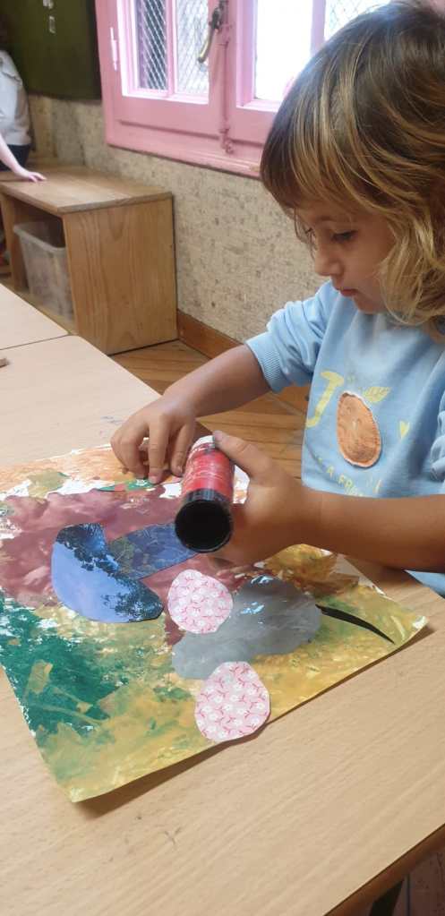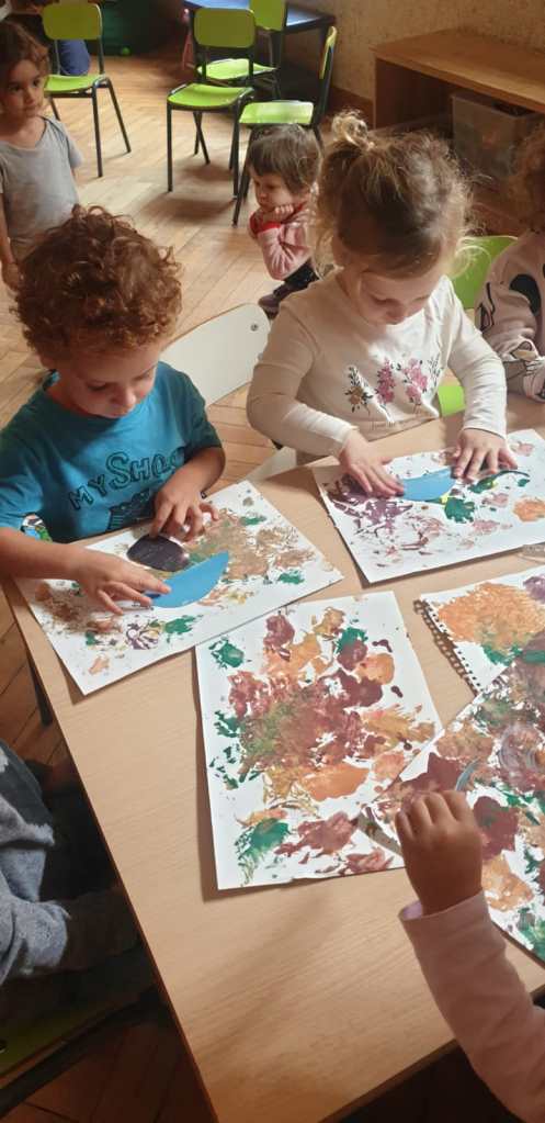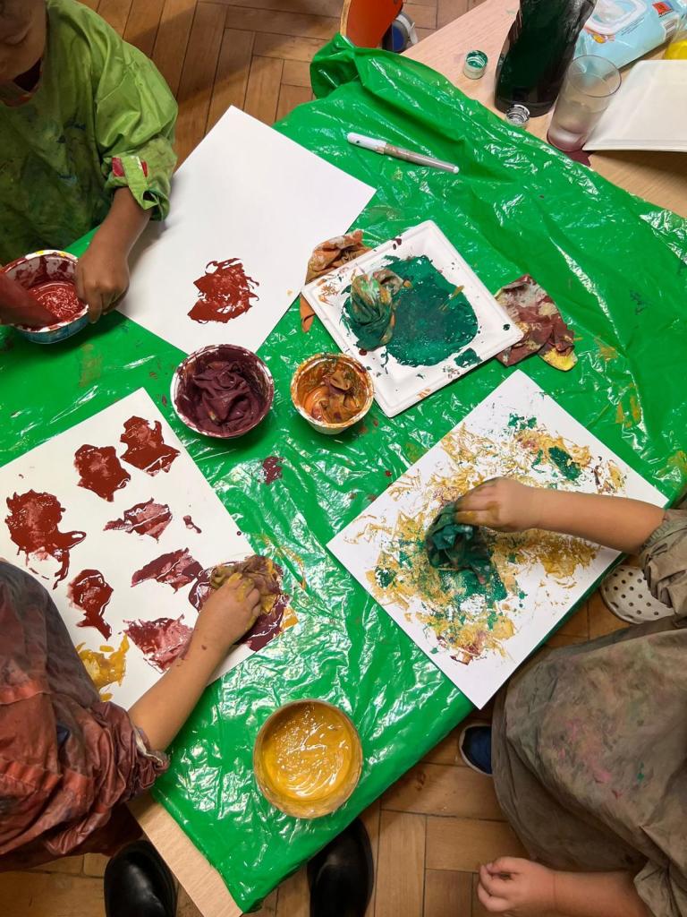 Cosa succede se mescoliamo i colori primari, come avviene nella storia di Piccolo Giallo e piccolo Blu di Leo Lionni? Ci abbiamo provato insieme, ed abbiamo ottenuto le sfumature dei toni autunnali. Con i colori già pronti ci siamo quindi sbizzarriti con la tecnica degli stampi con gli stracci.