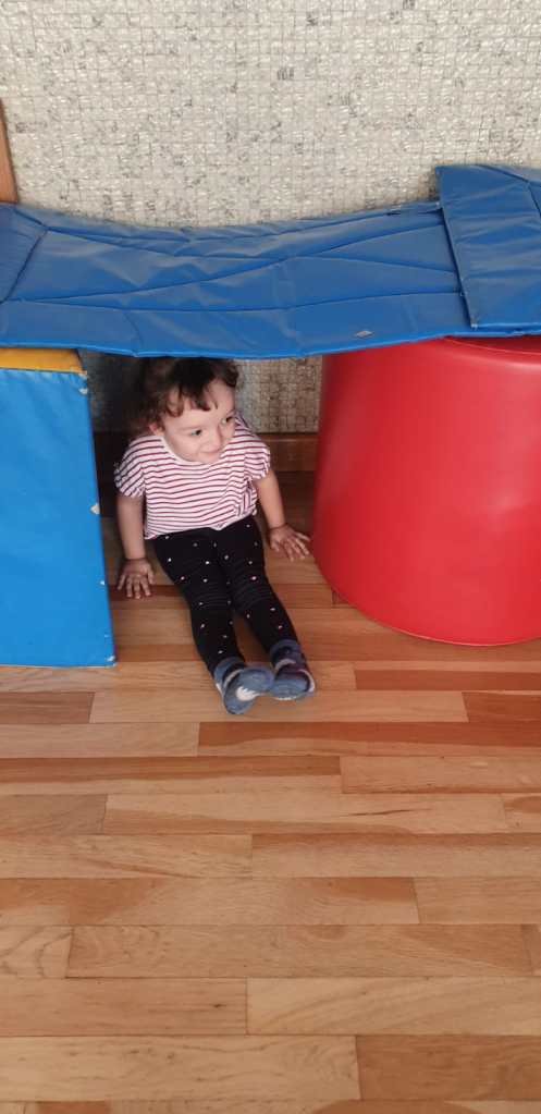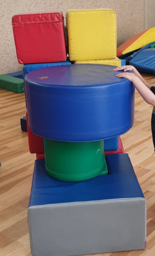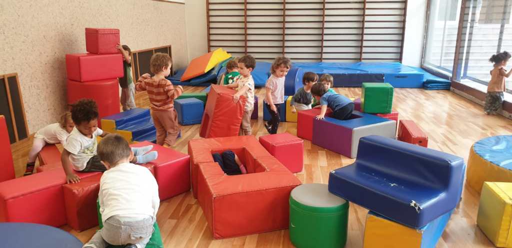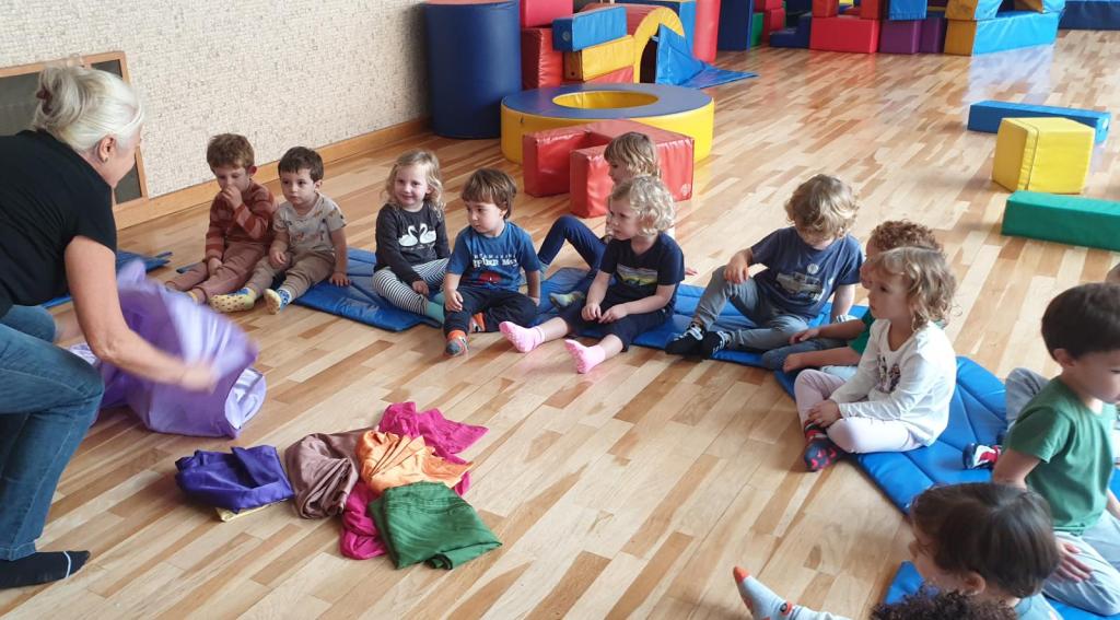 La prima attività é sulle parti del corpo. Poi facciamo il gioco delle scatoline magiche da cui escono gli animali del bosco. Imitiamo le loro andature. Infine con i blocchi morbidi costruiamo, da soli o in gruppo, rifugi e tane.