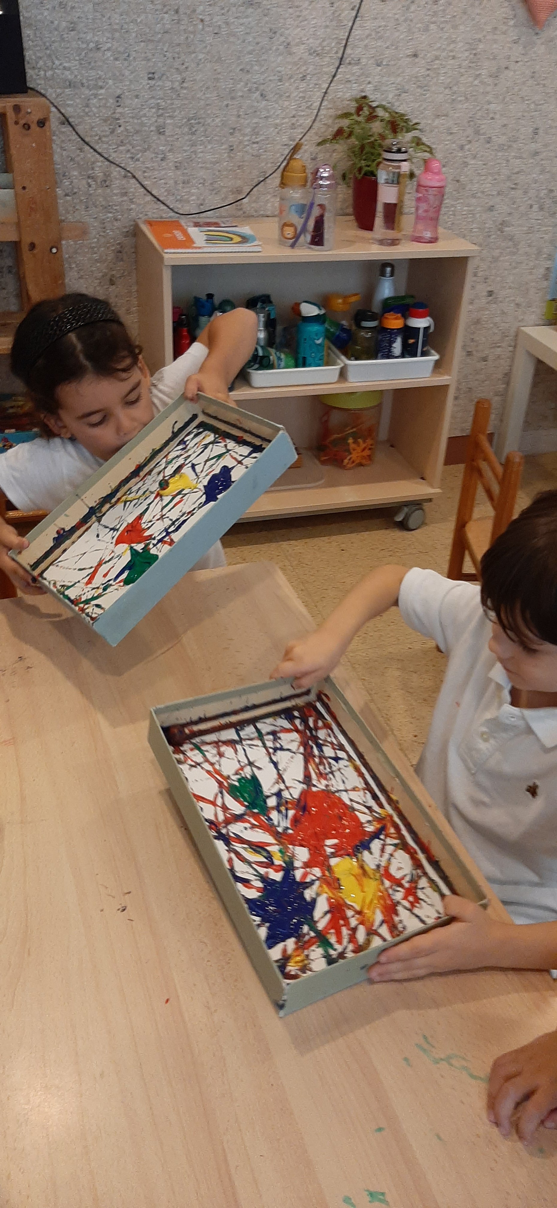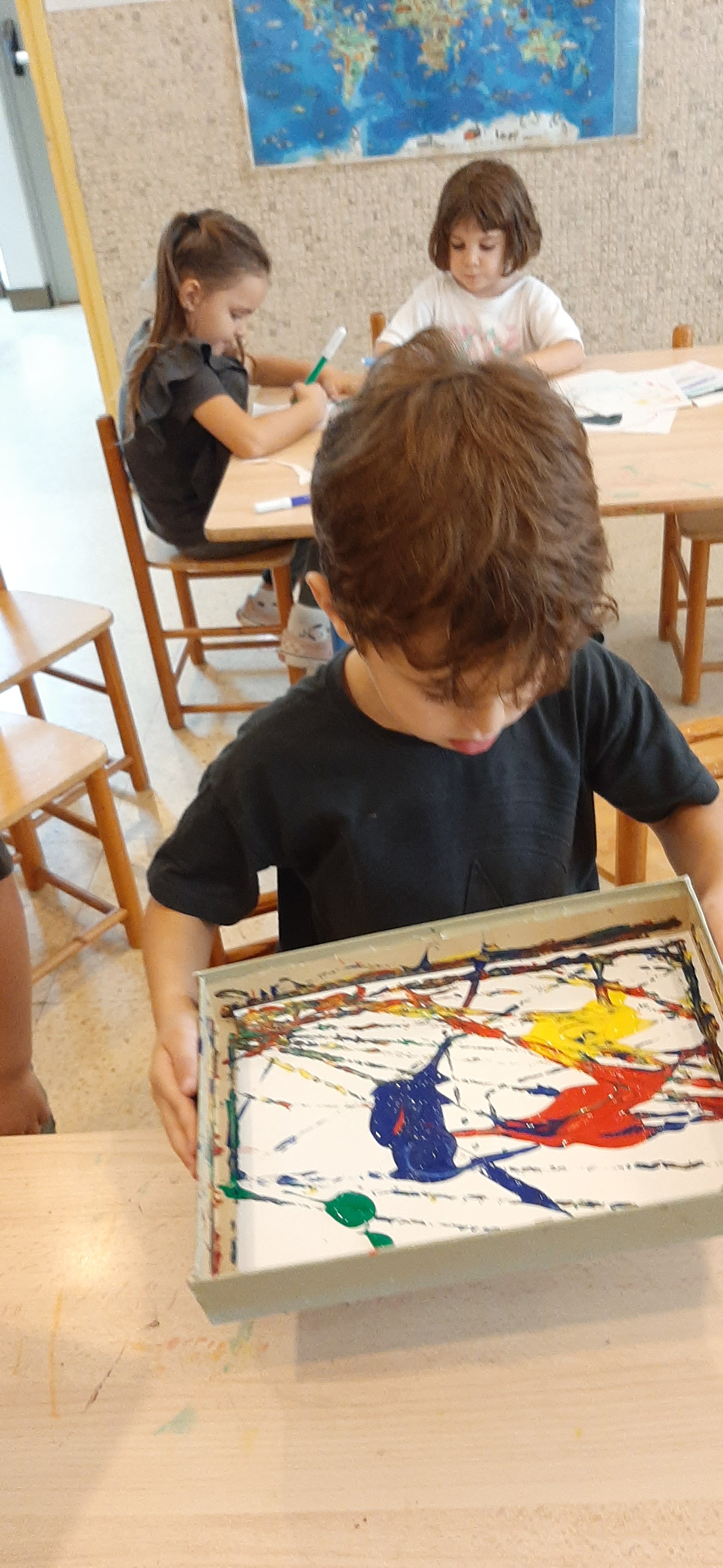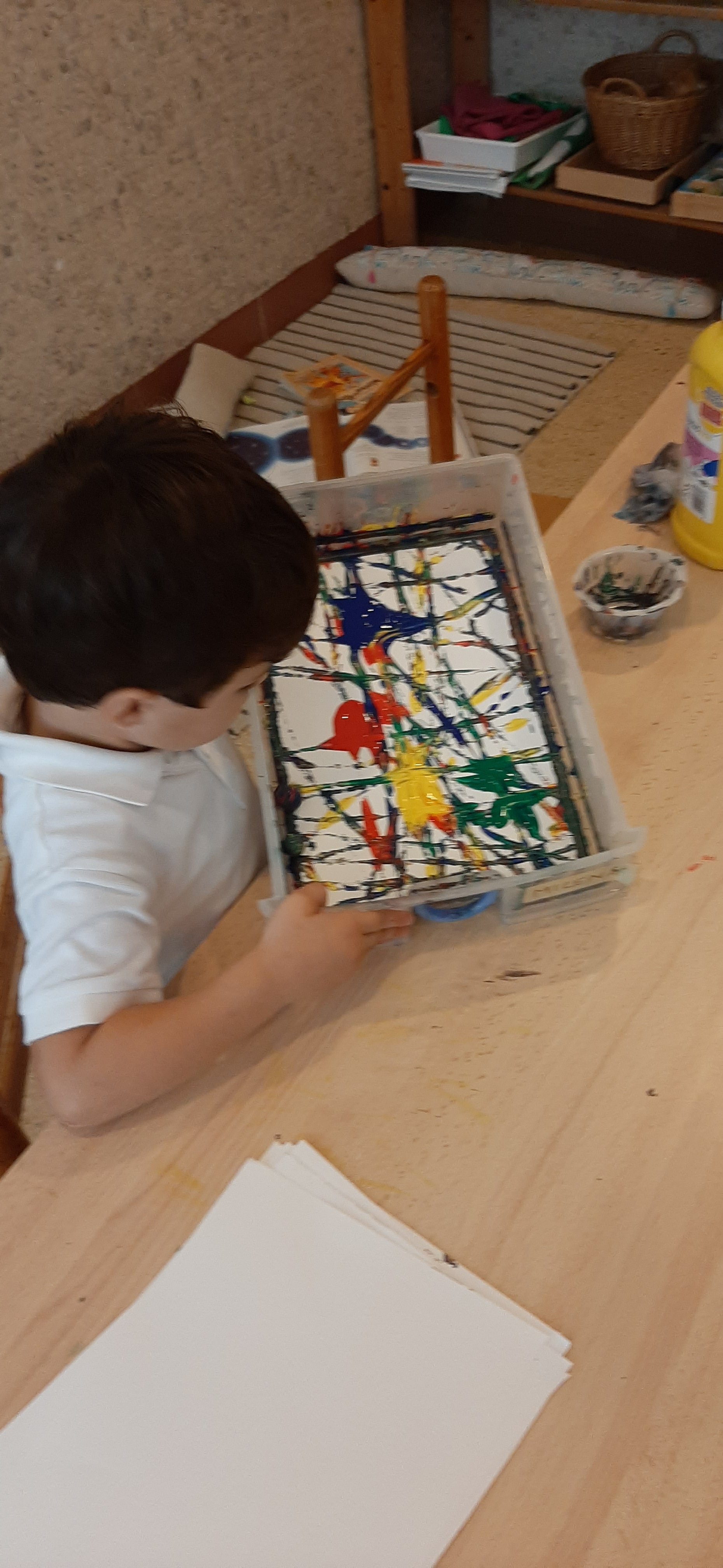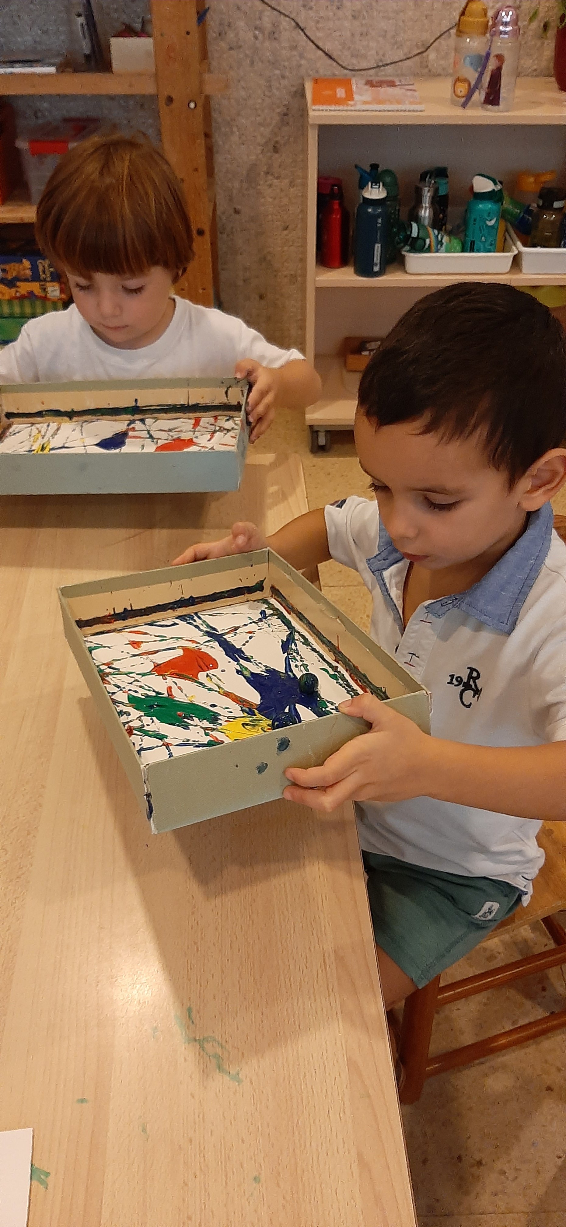 Giochiamo con la pittura e le biglie. Facciamo muovere le palline di vetro su un foglio ed osserviamo le tracce colorate di pittura che lasciano su. Guidiamo i movimenti delle biglie in alto, in basso, a destra, a sinistra ed in senso rotatorio. Notiamo come ad ogni nostro movimento, corrisponda sul foglio una scia distinta.