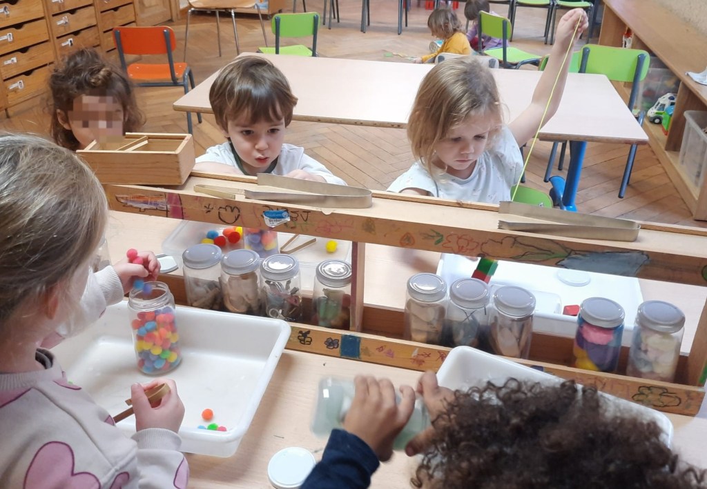 Scopriamo i materiali, le loro caratteristiche, impariamo ad aprire i barattoli, a svuotarli e riempirli, con o senza l’uso delle pinze. Ogni volta che vogliamo prendere un altro barattolo, riponiamo quello appena usato.