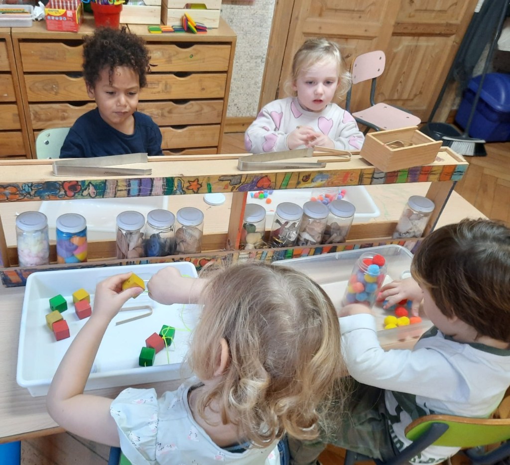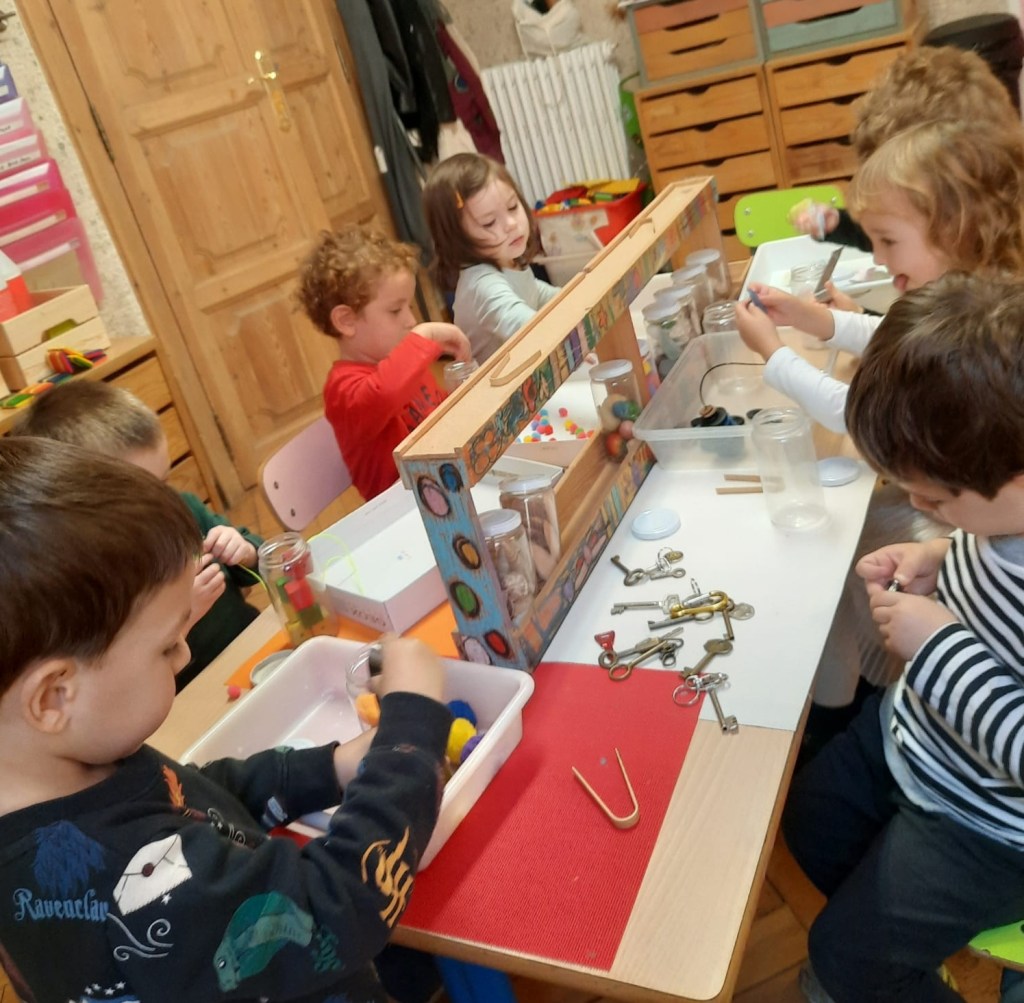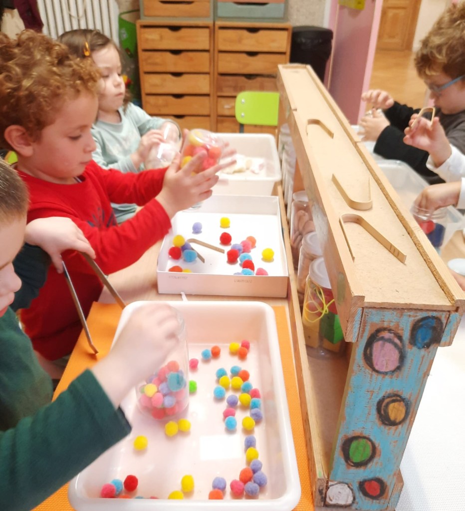 Questa è un’attività di manipolazione di materiali che favorisce la motricità fine, la concentrazione, il pensiero logico-matematico e che dà vita a molte situazioni di gioco – scoperta. I tempi sono dettati dalla capacità di concentrazione e dalla curiosità dei bambini e delle bambine. Dalla manipolazione passiamo poi alla verbalizzazione e alle classificazioni.