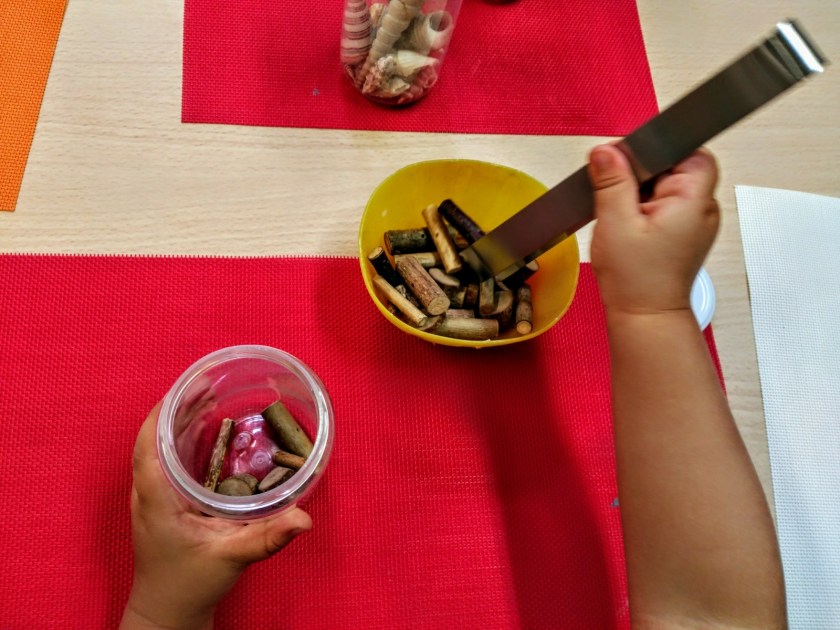 Scopriamo i materiali, le loro caratteristiche, impariamo ad aprire i barattoli, a svuotarli e riempirli, con o senza l’uso delle pinze. Ogni volta che vogliamo prendere un altro barattolo, riponiamo quello appena usato.